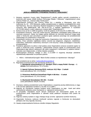 REGULAMIN KONKURSU POD NAZWĄ „WIELKI KONKURS CYFROWEGO POLSATU I DISCOVERY” 1. Niniejszy regulamin (zwany dalej "Regulaminem") określa ogólne warunki uczestnictwa w konkursie pod nazwą „Wielki konkurs Cyfrowego Polsatu i Discovery” organizowanym przez Cyfrowy Polsat S.A., zwanym dalej "Konkursem". 2. Organizatorem Konkursu jest Cyfrowy Polsat S.A. z siedzibą w Warszawie, przy ulicy Łubinowej 4a, 03 – 878 Warszawa, spółka zarejestrowana w rejestrze przedsiębiorców przez Sąd Rejonowy dla m.st. Warszawy Wydział Gospodarczy Krajowego Rejestru Sądowego, pod numerem KRS 0000010078, NIP 796-18-10-732, o kapitale zakładowym w wysokości 10.733.000 złotych w pełni wpłaconym (zwana dalej "Organizatorem"). 3. Konkurs trwa od 20.11.2009 od godziny 14:00 do godziny 23.59 dnia 04.12.2009 roku. 4. Uczestnikiem Konkursu może być osoba fizyczna, pełnoletnia, posiadająca pełną zdolność do czynności prawnych. Osoby nie mające pełnej zdolności do czynności prawnych mogą wziąć udział w Konkursie pod warunkiem uzyskania zgody opiekuna prawnego lub przedstawiciela ustawowego na uczestnictwo w Konkursie. 5. Uczestnikami konkursu nie mogą być pracownicy Organizatora i/lub członkowie ich najbliższej rodziny. Przez członków najbliższej rodziny rozumie się wstępnych, zstępnych, rodzeństwo, małżonków, małżonków rodzeństwa, krewnych w linii bocznej i osoby pozostające w stosunku przysposobienia. 6. Przesłanie zgłoszenia na adres e-mail podany przez Organizatora oznacza wyrażenie zgody na udział w Konkursie przez uczestnika i jednocześnie oznacza zgodę na przetwarzanie przez Organizatora jego danych osobowych dla celów związanych z konkursem tj. podania imienia i nazwiska oraz miejscowości, w której mieszka uczestnik. 7. Rozstrzygnięcie Konkursu nastąpi w dniu 11.12.2009 O wygranej decyduje udzielenie najciekawszej odpowiedzi na poniższe pytanie: • Które z doświadczeń/przygód Beara Gryllsa uważasz za najciekawsze i dlaczego? oraz przesłanie jej na adres: [email protected] 8. Nagrodami przeznaczonymi dla zwycięzców Konkursu są: 1. Nawigacja samochodowa 4,3" Navigon 2410 z mapą Polski i Europy - 1 sztuka (cena jednostkowa 742 zł brutto) 2. Aparat Cyfrowy Samsung ES15, matryca 10,2 Mpx - 2 sztuki (cena jednostkowa 322, 10 zł brutto) 3. Victorinox MultiTool SwissFlash Flight 4 GB Alox - 5 sztuk (cena jednostkowa 173, 50 zł brutto) 4. Słuchawki Senneheiser HD 201 - 5 sztuk (cena jednostkowa 100,65 zł brutto) 9. Zwycięzcy zostaną powiadomieni przez Organizatora o wygranej pocztą elektroniczną w ciągu 4 dni od dnia ogłoszenia wyników tj. do dnia 15.12.2009 r. 10. Nagrody do zwycięzców zostaną wysłane przez Organizatora na jego koszt pod adres zamieszkania wskazany przez Zwycięzców w zgłoszeniu konkursowym. 11. W przypadku niepodania swych danych osobowych lub niewyrażenia zgody na ich przetwarzanie przez Organizatora w zakresie wyżej podanym zwycięzca traci prawo do nagrody. 12. Nagrody zostaną wysłane w ciągu miesiąca licząc od dnia ogłoszenia wyników Konkursu. 13. Organizator Konkursu wyklucza możliwość zamiany nagrody w Konkursie na ekwiwalent pieniężny lub inną nagrodę rzeczową. 14. Zasady przeprowadzania Konkursu określa niniejszy Regulamin. 15. Udział w Konkursie, jest równoznaczny ze złożeniem przez uczestnika oświadczenia o wyrażeniu zgody na postanowienia niniejszego Regulaminu. 16. Organizator nie ponosi odpowiedzialności za: a) nieprawdziwość danych i oświadczeń złożonych przez Uczestników konkursu. b) problemy w funkcjonowaniu Konkursu, jeżeli nastąpiły one wskutek zdarzeń, których Organizator przy zachowaniu należytej staranności nie był w stanie przewidzieć, lub którym nie mógł zapobiec, w szczególności w przypadku problemów związanych ze zdarzeniami losowymi o charakterze siły wyższej, c) przerwy w funkcjonowaniu Konkursu zaistniałe z przyczyn technicznych lub niezależnych od Organizatora, nie doręczenie nagrody spowodowane podaniem przez laureata błędnych danych osobowych niezbędnych do doręczenia nagrody lub spowodowane działaniem firmy kurierskiej lub Poczty Polskiej, za pośrednictwem której będą doręczane przesyłki. 17. Organizator zastrzega sobie prawo do unieważnienia lub odwołania Konkursu w każdym czasie bez podania przyczyny. 18. W celu zapewnienia prawidłowości przeprowadzenia Konkursu Organizator powoła dwuosobową Komisję Konkursową. Do zadań Komisji należeć będzie czuwanie nad prawidłowością przebiegu Konkursu a w szczególności : a) zapewnienie przyznania nagród wyłonionym zwycięzcom, b) zabezpieczenie zgodności wyłonienia zwycięzców oraz przyznania nagrody zgodnie z regulaminem i zasadami pełnej rzetelności przeprowadzonych czynności, c) właściwe oznaczenie i zabezpieczenie danych zwycięzców, d) podpisanie protokołu zawierającego opis czynności przyznania nagród, e) udział w ewentualnym postępowaniu reklamacyjnym f) podejmowanie decyzji w kwestiach, w których pojawią się wątpliwości związane z Konkursem, w tym dotyczących interpretacji postanowień niniejszego Regulaminu. Decyzje Komisji są ostateczne. 19. Ewentualne reklamacje dotyczące Konkursu należy przesyłać listownie do Organizatora na adres: Łubinowa 4a, 03 – 878 Warszawa z dopiskiem "nazwa konkursu - reklamacja" w terminie 7 dni od dnia zakończenia konkursu lub w przypadku zwycięstwa w konkursie od daty wydania nagrody. Reklamacje zgłoszone po upływie ww. terminu nie będą rozpatrywane. Decyduje data otrzymania reklamacji przez Organizatora. 20. Konkurs przeprowadzony zostanie na stronie internetowej www.cyfrowypolsat.pl Regulamin Konkursu jest dostępny na stronie internetowej oraz w siedzibie Organizatora przez cały czas trwania Konkursu. 21. Za wydanie nagród w Konkursie odpowiada Organizator Cyfrowy Polsat S.A.