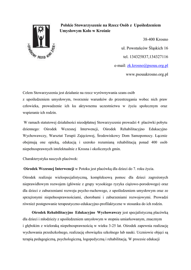 Polskie Stowarzyszenie na Rzecz Osób z Upośledzeniem Umysłowym Koło w Krośnie 38-400 Krosno ul. Powstańców Śląskich 16 tel. 134325837,134327116 e-mail: [email protected] www.psouukrosno.org.pl Celem Stowarzyszenia jest działanie na rzecz wyrównywania szans osób z upośledzeniem umysłowym, tworzenie warunków do przestrzegania wobec nich praw człowieka, prowadzenie ich ku aktywnemu uczestnictwu w życiu społecznym oraz wspieranie ich rodzin. W ramach statutowej działalności nieodpłatnej Stowarzyszenie prowadzi 4 placówki pobytu dziennego: Ośrodek Wczesnej Interwencji, Ośrodek Rehabilitacyjno Edukacyjno Wychowawczy, Warsztat Terapii Zajęciowej, Środowiskowy Dom Samopomocy. Łącznie obejmują one opieką, edukacją i szeroko rozumianą rehabilitacją ponad 400 osób niepełnosprawnych intelektualnie z Krosna i okolicznych gmin. Charakterystyka naszych placówek: Ośrodek Wczesnej Interwencji w Potoku jest placówką dla dzieci do 7. roku życia. Ośrodek realizuje wielospecjalistyczną, kompleksową pomoc dla dzieci zagrożonych nieprawidłowym rozwojem (głównie z grupy wysokiego ryzyka ciążowo-porodowego) oraz dla dzieci z zaburzeniami rozwoju psycho-ruchowego, z upośledzeniem umysłowym oraz ze sprzężonymi niepełnosprawnościami, chorobami i zaburzeniami rozwojowymi. Prowadzi również postępowanie terapeutyczno-edukacyjno-profilaktyczne w stosunku do ich rodzin. Ośrodek Rehabilitacyjno Edukacyjno Wychowawczy jest specjalistyczną placówką dla dzieci i młodzieży z upośledzeniem umysłowym w stopniu umiarkowanym, znacznym i głębokim z wieloraką niepełnosprawnością w wieku 3-25 lat. Ośrodek zapewnia realizację wychowania przedszkolnego, realizację obowiązku szkolnego lub nauki. Uczniowie objęci są terapią pedagogiczną, psychologiczną, logopedyczną i rehabilitacją. W procesie edukacji i rehabilitacji bazujemy na mocnych stronach dziecka. Celem oddziaływań edukacyjnoterapeutyczno -rehabilitacyjnych jest jak największe usamodzielnienie oraz przygotowanie wychowanków do przyszłego uczestnictwa w życiu społecznym. Placówka zapewnia również opiekę w postaci niezbędnej pielęgnacji, transportu i wyżywienia. Środowiskowy Dom Samopomocy jest placówką pobytu dziennego, przeznaczoną dla osób dorosłych z niepełnosprawnością intelektualną i sprzężonymi niepełnosrawnościami. Podstawowym zadaniem Środowiskowego Domu Samopomocy jest poprawa kondycji psychofizycznej, podtrzymywanie i rozwijanie umiejętności niezbędnych w codziennym, samodzielnym życiu, integracja ze środowiskiem lokalnym oraz wsparcie rodziny. Warsztat Terapii Zajęciowej dla osób dorosłych z orzeczonym znacznym lub umiarkowanym stopniem niepełnosprawności. WTZ przygotowuje uczestników do podjęcia pracy zawodowej oraz pozwala zdobyć umiejętności przydatne w codziennym i samodzielnym życiu. W ramach pozostałej działalności statutowej prowadzimy: aktywizację zawodową osób niepełnosprawnych, treningi mieszkalnictwa i usamodzielnienia, specjalistyczną bibliotekę, organizujemy zabawy i imprezy integracyjne. stałą współpracę z rodzicami podopiecznych poprzez: wspieranie i pomaganie w sytuacjach trudnych, dostarczanie wskazówek i wiedzy na temat potrzeb rozwojowych dziecka, informowanie o bliższych i dalszych celach pracy rehabilitacyjnej i edukacyjnej z dzieckiem, pomoc w wyborze odpowiedniego sprzętu rehabilitacyjnego oraz naukę korzystania z tego sprzętu.