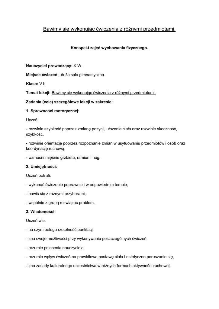 Bawimy się wykonując ćwiczenia z różnymi przedmiotami. Konspekt zajęć wychowania fizycznego. Nauczyciel prowadzący: K.W. Miejsce ćwiczeń: duża sala gimnastyczna. Klasa: V b Temat lekcji: Bawimy się wykonując ćwiczenia z różnymi przedmiotami. Zadania (cele) szczegółowe lekcji w zakresie: 1. Sprawności motorycznej: Uczeń: - rozwinie szybkość poprzez zmianę pozycji, ułożenie ciała oraz rozwinie skoczność, szybkość, - rozwinie orientację poprzez rozpoznanie zmian w usytuowaniu przedmiotów i osób oraz koordynację ruchową, - wzmocni mięśnie grzbietu, ramion i nóg. 2. Umiejętności: Uczeń potrafi: - wykonać ćwiczenie poprawnie i w odpowiednim tempie, - bawić się z różnymi przyborami, - wspólnie z grupą rozwiązać problem. 3. Wiadomości: Uczeń wie: - na czym polega rzetelność punktacji, - zna swoje możliwości przy wykonywaniu poszczególnych ćwiczeń, - rozumie polecenia nauczyciela, - rozumie wpływ ćwiczeń na prawidłową postawę ciała i estetyczne poruszanie się, - zna zasady kulturalnego uczestnictwa w różnych formach aktywności ruchowej. 4. Usamodzielniania ucznia: Uczeń: - przeżywa radość i satysfakcję z uczestnictwa w zabawach integrujących grupę, - poszukuje różnych rozwiązań organizacji wyścigów w rzędach, - współdziała w grupie w celu szybkiego rozwiązania problemu i szybkiego rozpoczęcia ćwiczenia, - przestrzega zasad bezpieczeństwa, zdrowego współzawodnictwa i rywalizacji. Przybory: szarfy (4 kolory), 4 piłki, chorągiewki, gazety, kartki i długopisy. Metody: zabawowa, zadaniowa, problemowa, pogadanka. Zasady: wszechstronności, stopniowego natężenia pracy mięśniowej, świadomego i aktywnego udziału uczniów, przystępności. Formy: frontalne, grupowe. Czas trwania lekcji – 45 minut Ilość ćwiczących – 15 osób TOK ZAJĘĆ ZADANIA UCZNIÓW Czynności Uczniowie zapoznają się z zadaniami Organizacyjno- lekcji. porządkowe Uczniowie słuchają informacji nauczyciela i przygotowują się do aktywnego udziału. Zabawa ożywiająca Pobudzenie organizmu, przygotowanie do wysiłku. Zabawa ożywiająca „Ryby i rybacy Przebieg zabawy: fragment boiska stanowi powierzchnię „jeziora” uczniowie są podzieleni na dwa zespoły I. Zespół to „ryby” II. to „rybacy”. Rybacy trzymają siatkę do siatkówki, starają się w określonym czasie schwycić w sieć uciekające po całym „jeziorze” „ryby”. Ryby starają się uniknąć schwytania i biegają w różnych kierunkach. Złapaną rybę rybacy odprowadzają do przystani, CZYNNOŚCI NAUCZYCIELA Powitanie, zapoznanie z zadaniami lekcji, sprawdzanie gotowości uczniów do zajęć. UWAGI ORG.-MET Ustawienie w dwuszeregu w skorygowanej postawie. Nauczyciel przypomina reguły zabawy i czuwa nad prawidłowym jej przebiegiem, bezpieczeństwem dzieci. Metoda zabawowa klasyczna Uczniowie podzieleni są na Część główna A gdzie pozostaje do końca ustalonego na połów czasu. Po jego upływie następuje liczenie złowionych ryb oraz zamiana ról pomiędzy zespołami. Wygrywa zespół, który w czasie połowu schwyta więcej ryb. Zabawa ruchawa „Traf piłką ostatniego” Podział dzieci na dwie grupy. Jedna tworzy koło stojąc w odległości kroku jedno od drugiego. Druga grupa stoi w środku koła ustawiając się w rzędzie trzymając mocno pod boki jedna drugą. Dzieci tworzące koło przerzucają piłkę starając się uderzyć nią ostatniego w rzędzie. Trafiony ostatni wycofuje się z gry i dołącza do dzieci rzucających piłką. Gra toczy się dalej aż do pozostania jednego uczestnika w środku koła. Ćwiczenia kształtujące z przyborem nietypowym (gazetą). Pobudzenie organizmu, przygotowanie do wysiłku. Uczniowie wykonują ćwiczenia RR, NN i tułowia: 1. W staniu rozkrocznym przesuwanie złożonej gazety między stopami – „ósemki”. 2. Przeskoki bokiem przez gazetę w prawo i w lewo. 3. W siadzie skrzyżnym, poprzez skłon w przód dotknięcie czołem gazety leżącej na podłodze. 4. W leżeniu przodem „przeglądanie się w lusterku”- gazeta złożona na pół. 5. Stojąc w rozkroku i trzymając gazetę w górze uczniowie naśladują „żagiel na wietrze”. 6. W przysiadzie podpartym czworakowanie wokół gazety rozłożonej na podłodze. 7. W leżeniu tyłem rowerek obunóż z gazetą między stopami. 8. Dowolne przeskoki przez gazetę. 9. W marszu i w biegu rzuty i chwyty zgniecionej gazety. 10. Stojąc na gazecie skręty tułowia. 11. Czy potrafisz? Kulka między stopami – w podskoku wyrzucenie kulki w górę i chwycenie oburącz. 12. „Gazetowa bitwa”- przerzucanie kul na boisko przeciwne przez 1 minutę (liczenie kul). dwa zespoły. Uczniowie stojący w środku koła muszą pilnie uważać u kogo znajduje się piłka i starać się poruszać całym zespołem tak szybko i zwinnie, aby nie dopuścić do trafienia ostatniego w rzędzie. Nauczyciel inspiruje i nadzoruje wykonywane przez dzieci ćwiczenia, nagradza najlepiej ćwiczących. Metoda zadaniowa Część główna B Metoda problemowa Wspólne rozwiązywanie problemu. Integracja grupy. Rozwijanie szybkości. Uczeń przygotowuje przybory i przyrządy do ćwiczeń. Zajmuje miejsce w swoim rzędzie. Bierze udział w wyścigach rzędów. 1.Zabawa bieżna „Samoloty” Trzy zastępy stoją w swoich rzędach pierwsi w zastępach trzymają ręce w bok. Na wyprostowane ręce zakładają gazety po sygnale prowadzącego biegną do mety tak szybko aby gazety nie spadły z ramion, a jednocześnie przypominają skrzydła samolotu. Po okrążeniu chorągiewki wracają do mety i przekazują gazety następnemu zawodnikowi. Wygrywa zespół, który najszybciej i najdokładniej wykona swoje zadanie. Rozwijanie zwinności. 2. Zabawa ,,Jeże transportujące grzyby” Uczeń w siadzie ugiętym podpartym z piłką leżącą na biodrach czworakuje tyłem do chorągiewki, wraca wykonując bieg przodem. Wydaje polecenie ustawienia się drużyn do udziału w wyś
