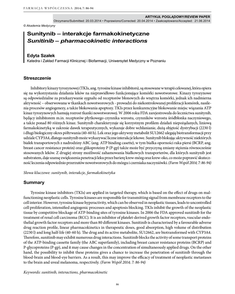 86 FA R M A C J A W S P Ó Ł C Z E S N A 2014; 7: 86-94 ARTYKUŁ POGLĄDOWY/REVIEW PAPER Otrzymano/Submitted: 20.03.2014 • Poprawiono/Corrected: 20.04.2014 • Zaakceptowano/Accepted: 21.06.2014 © Akademia Medycyny Sunitynib – interakcje farmakokinetyczne Sunitinib – pharmacokinetic interactions Edyta Szałek Katedra i Zakład Farmacji Klinicznej i Biofarmacji, Uniwersytet Medyczny w Poznaniu Streszczenie Inhibitory kinazy tyrozynowej (TKIs, ang. tyrosine kinase inhibitors), są stosowane w terapii celowanej, która opiera się na wykorzystaniu działania leków na nieprawidłowo funkcjonujące komórki nowotworowe. Kinazy tyrozynowe są odpowiedzialne za przekazywanie sygnału od receptorów błonowych do wnętrza komórki, jednak ich nadmierna aktywność – obserwowana w tkankach nowotworowych - prowadzi do niekontrolowanej proliferacji komórek, nasilenia procesów angiogenezy, a także blokowania apoptozy. TKIs przez konkurencyjne blokowanie miejsc wiązania ATP kinaz tyrozynowych hamują rozrost tkanki nowotworowej. W 2006 roku FDA zarejestrowała do lecznictwa sunitynib, będący inhibitorem m.in. receptorów płytkowego czynnika wzrostu, czynników wzrostu śródbłonka naczyniowego, a także ponad 80 różnych kinaz. Sunitynib charakteryzuje się korzystnym profilem działań niepożądanych, liniową farmakokinetyką w zakresie dawek terapeutycznych, wykazuje dobre wchłanianie, dużą objętość dystrybucji (2230 l) i długi biologiczny okres półtrwania (40-60 h). Lek oraz jego aktywny metabolit SU12662 ulegają biotransformacji przy udziale CYP3A4, dlatego sunitynib może wykazywać liczne interakcje lekowe. Sunitynib blokując aktywność niektórych białek transportowych z nadrodziny ABC (ang. ATP binding casette), w tym białka oporności raka piersi (BCRP, ang. breast cancer resistance protein) oraz glikoproteiny P (P-gp) także może być przyczyną zmiany stężenia równocześnie stosowanych leków. Z drugiej strony możliwość zahamowania białkowych transporterów, dla których sunitynib jest substratem, daje szansę zwiększenia penetracji leku przez barierę krew-mózg oraz krew-oko, co może poprawić skuteczność leczenia odpowiednio przerzutów nowotworowych do mózgu i czerniaka naczyniówki. (Farm Współ 2014; 7: 86-94) Słowa kluczowe: sunitynib, interakcje, farmakokinetyka Summary Tyrosine kinase inhibitors (TKIs) are applied in targeted therapy, which is based on the effect of drugs on malfunctioning neoplastic cells. Tyrosine kinases are responsible for transmitting signal from membrane receptors to the cell interior. However, tyrosine kinase hyperactivity, which can be observed in neoplastic tissues, leads to uncontrolled cell proliferation, intensified angiogenic processes and apoptosis blocking. TKIs inhibit the growth of the neoplastic tissue by competitive blockage of ATP-binding sites of tyrosine kinases. In 2006 the FDA approved sunitinib for the treatment of renal cell carcinoma (RCC). It is an inhibitor of platelet-derived growth factor receptors, vascular endothelial growth factor receptors and more than 80 different kinases. Sunitinib is characterised by a favourable adverse drug reaction profile, linear pharmacokinetics in therapeutic doses, good absorption, high volume of distribution (2230 l) and long half-life (40-60 h). The drug and its active metabolite, SU12662, are biotransformed with CYP3A4. Therefore, sunitinib may exhibit numerous drug interactions. Sunitinib blocks the activity of some transport proteins of the ATP-binding cassette family (the ABC superfamily), including breast cancer resistance proteins (BCRP) and P-glycoproteins (P-gp), and it may cause changes in the concentration of simultaneously applied drugs. On the other hand, the possibility to inhibit these proteins gives a chance to increase the penetration of sunitinib through the blood-brain and blood-eye barriers. As a result, this may improve the efficacy of treatment of neoplastic metastases to the brain and uveal melanoma, respectively. (Farm Współ 2014; 7: 86-94) Keywords: sunitinib, interactions, pharmacokinetic 86 FA R M A C J A W S P Ó Ł C Z E S N A 2014; 7: 86-94 Stale rosnąca liczba pacjentów onkologicznych wymusza poszukiwanie nowych leków, które będą cechowały się wybiórczym działaniem na komórki nowotworowe, dobrą tolerancją i penetracją tkankową. Duże znaczenie dla komfortu leczonego pacjenta ma również doustna droga podania leku, która eliminuje przedłużoną i kosztowną hospitalizację. Nadrzędnym celem terapii przeciwnowotworowej będzie oczywiście możliwość wyleczenia i przedłużenie życia pacjentów. Szansę na efektywniejsze leczenie stwarza terapia celowana, która jest ukierunkowana molekularnie i opiera się na hamowaniu tylko określonych szlaków sygnałowych w procesie progresji nowotworu. Lekami ukierunkowanymi molekularnie są inhibitory kinaz tyrozynowych (ang. ang. tyrosine kinase inhibitors, TKIs). Kinazy tyrozynowe są to enzymy przekazujące sygnał od receptorów błonowych do wnętrza komórki. Są one jednak także zaangażowane w powstawanie nowotworów. Nadmierna aktywacja receptorów o aktywności kinaz tyrozynowych prowadzi m.in. do zaburzeń w szlakach sygnałowych komórki i w efekcie do promowania niekontrolowanej proliferacji komórek, nasilenia procesów angiogenezy, a także blokowanie apoptozy. Do inhibitorów kinaz tyrozynowych należy m.in. sunitynib, który został zarejestrowany do lecznictwa w 2006 roku przez Amerykańską Agencję ds. Żywności i Leków (ang. US Food and Drug Administration, FDA). Podstawowe wskazania do stosowania sunitynibu obejmują leczenie nowotworów podścieliskowych przewodu pokarmowego (ang. gastrointestinal stromal tumor, GIST), zaawansowanego raka nerki (ang. renal cell carcinoma, RCC) i (lub) raka nerki z przerzutami (ang. metastatic renal cell cancer, MRCC) oraz nowotworów neuroendokrynnych trzustki (ang. pancreatic neuroendocrine tumor, pN