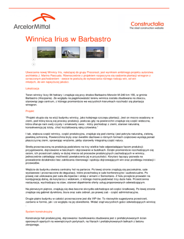 Winnica Irius w Barbastro Utworzenie nowej Winnicy Iris, należącej do grupy Proconsol, jest wynikiem ambitnego projektu autorstwa architekta J. Marino Pascuala. Równocześnie z projektem rozpoczyna się sadzenie plantacji winogron z oznaczonym pochodzeniem - owoce te posłużą do wytwarzania różnego rodzaju win, od win młodych, do win najwyższej jakości. Lokalizacja Teren winnicy liczy 84 hektary i znajduje się przy drodze Barbastro-Monzón M-240 km 155, w gminie Barbastro (Hiszpania). Ze względu na pagórkowatość terenu winnica została zbudowana na zboczu, stanowiąc jego centrum, z którego promieniście we wszystkich kierunkach rozchodzi się plantacja winogron. Projekt "Projekt skupia się na wizji budynku winnicy, jako kolejnego szczepu plantacji. Jest on mocno osadzony w ziemi, pod którą toczą się procesy produkcji, podczas gdy na powierzchni znajduje się część widoczna, która ofiaruje nam swój czysty i smakowity owoc - który pochodząc z ziemi, stanowi naturalną konsekwencję jej istoty, choć kształtowaną ręką człowieka.” I tak, większa część winnicy, część produkcyjna, znajduje się pod ziemią i jest pokryta naturalną, zieloną, powłoką ochronną. Powierzchnia bryły oraz świetliki dachowe o różnych formach częściowo wystają ponad płaszczyznę ziemi, sprawiając wrażenie, jakby stanowiły integralną część natury. Strefę przeznaczoną na produkcję podzielono na trzy wielkie hale odpowiadające fazom produkcji: przygotowanie, dojrzewanie w beczkach i dojrzewanie w butelkach. Dzięki promieniście rozchodzącym się osiom, ich przestrzeń zależy w dużej mierze od procesów produkcyjnych zachodzących w winnicy, jednocześnie zakładając możliwość powiększenia jej w przyszłości. Korytarz łączący pozwala na prowadzenie działalności bez zakłócania równowagi i spokoju dojrzewających win oraz przebiegu instalacji i przewodów. Wejście do budynku otwiera centralny hol na parterze. Po lewej stronie znajdują się poczekalnie, sale wystawowe i przeznaczone do degustacji, które przechodzą w sale konferencyjne i audiowizualne. Po prawej zaś ulokowana jest sala dla kiperów i sklep z winami z Somontano. Z holu przejście prowadzi na kondygnację dolną, do korytarza z widokiem, z którego można podziwiać trzy duże hale. Przestrzenna restauracja, wychodząca na staw, stanowi dopełnienie oferty usług proponowanych odwiedzającym. Na pierwszym piętrze, znajdują się dwa boczne skrzydła odchodzące od części środkowej. Po lewej stronie znajduje się gabinet dyrektora, biura oraz sale zebrań, po prawej zaś - część administracyjna. Drugie piętro budynku w całości przeznaczone jest dla VIP-ów. To niezwykle sugestywna przestrzeń, zarówno w formie, jak i ze względu na jej oświetlenie. Widać stąd wszystkich gości odwiedzających winnicę . System konstrukcyjny Konstrukcja hali produkcyjnej, dojrzewania i butelkowania zbudowana jest z prefabrykowanych ścian oporowych opartych na wewnętrznych portykach, na filarach i prefabrykowanych belkach z betonu zbrojonego. Budynek dla gości wieńczy trzy hale główne; konstrukcja niższych kondygnacji wykonana została z betonu zbrojonego (ściany, belki, filary i płytki elewacji). Stalowe elewacje i zadaszenie W budowie winnicy zastosowano dwa rodzaje dachów: roślinne i przechodnie nad halami oraz płaskie nad pomieszczeniami technicznymi. Konstrukcja jest jednakowa dla elewacji i dachu. Pomieszczenia na parterze oraz na pierwszym i drugim piętrze mają takie same parametry, czy to w ułożeniu poziomym, czy też pionowym oraz na powierzchniach nachylonych. Razem tworzą one literę U, podobnie jak cała ich konstrukcja. Przegrody wykonane są z konstrukcji stalowej. Wykorzystano blachy ze stali S 275 R, łączone za pomocą spawania obwodowego. Konstrukcje powierzchni bocznych utworzone są z ram z profili zamkniętych o przekroju prostokątnym i o zmiennych wymiarach. Na tych głównych i pobocznych profilach zamontowany został panel typu sandwich. Na nim ułożono gładką blachę, kilka warstw izolacyjnych i nieprzemakalnych, a wreszcie powłokę wykonaną ze stali nierdzewnej z płytami łączonymi za pomocą rąbkowania z krytymi zszywkami. Liczne fasady budynku wybudowano ze stali nierdzewnej UGITOP (gatunek 316L). Materiał ten nadaje całej powierzchni jednorodny charakter, co podkreśla ideę, że każda płaszczyzna, zarówno dachy, jak i elewacje, posiada taką samą rangę w konstrukcji budynku. Matowe wykończenie bryły lekko odbija kolory otoczenia, tworząc łagodny i świetlisty kontrast z krajobrazem. Stal UGITOP o wysokiej odporności na korozję doskonale wpasowuje się w wiejski pejzaż. Dzięki swojej neutralności, materiał ten nie powoduje żadnego zagrożenia dla środowiska i nie zmienia składu chemicznego wód deszczowych. Nad halą produkcyjną umieszczono świetliki dachowe z otwieranymi oknami pełniącymi również funkcje wentylacyjne. Zewnętrzne wykończenie zrealizowano ze stali nierdzewnej, podobnie jak elewacje i dachy w części logistycznej. Stolarka zewnętrzna w oknach i drzwiach między sekcjami wykonana jest ze stali nierdzewnej i stalowej blachy. Z tych samych materiałów zrobione są rynny i kratki, przez które do hali produkcyjnej dostaje się woda przeznaczona do mycia owoców. Winnica odznacza się w krajobrazie Sierra de Guara nie tylko dzięki swoim architektonicznym kształtom, ale również dzięki higienicznemu i czystemu wyglądowi, który zawdzięcza wykorzystaniu nieskazitelnie błyszczących materiałów na elewacji i dachu, takich jak stal nierdzewna. Winnica Irius jest obowiązkowym punktem wizyt w Somontano i najlepszą reklamą dla wysokojakościowych win tam produkowanych. Stal wykorzystana w projekcie Wybrana dzięki wyjątkowej wytrzymałości, twardości i trwałości. Ważne rodzaje stali wykorzystane podczas budowy: - Konstrukcja elewacji i dachu: profile zamknięte ze stali walc