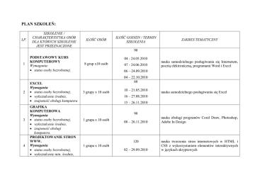 PLAN SZKOLEŃ: LP. SZKOLENIE / CHARAKTERYSTYKA OSÓB DLA KTÓRYCH SZKOLENIE JEST PRZEZNACZONE ILOŚĆ OSÓB ILOŚĆ GODZIN / TERMIN SZKOLENIA ZAKRES TEMATYCZNY 90 1 2 3 4 PODSTAWOWY KURS KOMPUTEROWY Wymagania: status osoby bezrobotnej. EXCEL Wymagania status osoby bezrobotnej, wykształcenie średnie, znajomość obsługi komputera GRAFIKA KOMPUTEROWA Wymagania status osoby bezrobotnej, wykształcenie średnie, znajomość obsługi komputera. PROJEKTOWANIE STRON WWW. Wymagania status osoby bezrobotnej, wykształcenie min. średnie, 04 - 24.05.2010 8 grup x10 osób 07 - 24.06.2010 nauka samodzielnego posługiwania się Internetem, pocztą elektroniczną, programami Word i Excel 06 – 24.09.2010 04 – 22.10.2010 60 3 grupy x 10 osób 10 – 21.05.2010 nauka samodzielnego posługiwania się Excel 16 – 27.08.2010 15 – 26.11.2010 90 1 grupa x 10 osób 08 – 26.11.2010 120 1 grupa x 10 osób 02 – 29.09.2010 nauka obsługi programów Corel Draw, Photoshop, Adobe In Design nauka tworzenia stron internetowych w HTML i CSS z wykorzystaniem elementów interaktywnych w językach skryptowych znajomość obsługi komputera. 5 6 7 8 PRACOWNIK SEKRETARIATU Wymagania status osoby bezrobotnej, wykształcenie średnie. KSIĘGOWOŚĆ KOMPUTEROWA Wymagania: status osoby bezrobotnej, wykształcenie średnie (preferowane ekonomiczne), staż pracy w księgowości min. 2 lata. SPECJALISTA DS. KADR I PŁAC Wymagania: status osoby bezrobotnej, wykształcenie min. średnie, staż pracy w kadrach lub księgowości min. 2 lata. STYLIZACJA PAZNOKCI Wymagania: status osoby bezrobotnej, zdolności manualne. dobry stan zdrowia. 90 2 grypy x 10 osób 19.07 – 06.08.2010 11- 29.10.2010 obsługa komputera(Word, Excel, Internet), Kodeks Pracy, zagadnienia kadrowe, obsługa urządzeń biurowych, dokumentacja biurowa 150 programy Symfonia, Płatnik 1 grupa x 10 osób 05.07 – 06.08.2010 120 2 grupy x 10 osób 04 – 31.05.2010 02 - 30.11.2010 zarządzanie personelem, przepisy Kodeksu Pracy, dokumentacja osobowa pracowników, świadczenia pieniężne z tytułu stosunku pracy, rozliczenia z ZUS z uwzględnieniem systemu emerytalnego 90 2 grupy x 10 osób 07 – 25.06.2010 02 – 24.11.2010 stylizacja paznokci: manicure paznokci, zdobienie paznokci i przedłużanie 9 10 11 OBSŁUGA KAS FISKALNYCH Wymagania: status osoby bezrobotnej, mile widziane wykształcenie handlowe, lub staż pracy w zawodzie. MAGAZYNIER Z MODUŁEM OBSŁUGI WÓZKÓW JEZDNIOWYCH Wymagania: status osoby bezrobotnej, wykształcenie min. zawodowe, prawo jazdy kat. B mile widziany staż pracy w zawodzie, brak przeciwwskazań lekarskich do pracy w zawodzie. OPERATOR WÓZKÓW JEZDNIOWYCH Wymagania: status osoby bezrobotnej, prawo jazdy kat. B mile widziany staż pracy w zawodzie, brak przeciwwskazań lekarskich do pracy w zawodzie. 30 nauka obsługi kas fiskalnych 1 grupa x 10 osób 26 – 30.04.2010 150 2 grupy x 10 osób 05.07 -06.08.2010 04.10 – 05.11.2010 90 2 grupy x 10 osób 24.05 – 11.06.2010 23.08 – 10.09.2010 podstawy obsługi komputera, obsługa programów magazynowych, dokumentacja obrotu towarowego oraz organizacja pracy w magazynie, fakturowanie, obsługa wózków jezdniowych obsługa wózków jezdniowych, typy i budowa wózków, czynności operatora przy obsłudze wózka, wiadomości z zakresu ładunkoznawstwa 12 13 14 PRACOWNIK OCHRONY FIZYCZNEJ I STOPNIA Wymagania: status osoby bezrobotnej, ukończone 21 lat, uregulowany stosunek do służby wojskowej, brak przeciwwskazań lekarskich do pracy w zawodzie, osoba nie karana. PRACOWNIK OCHRONY FIZYCZNEJ II STOPNIA Wymagania: status osoby bezrobotnej, ukończone 21 lat, wykształcenie min. średnie, uregulowany stosunek do służby wojskowej, brak przeciwwskazań lekarskich do pracy w zawodzie, osoba nie karana. UPRAWNIENIA ELEKTROENERGETYCZNE DO 1 KV Wymagania: status osoby bezrobotnej, wykształcenie min. zawodowe elektryczne lub pokrewne lub staż pracy w zawodzie. 180 1 grupa x 10 osób 20.09 – 29.10.2010 180 1 grupa x 10 osób 07.06 – 16.07.2010 30 2 grupy x 10 osób 26 – 30.04.2010 04 – 08.10.2010 przepisy regulujące zasady wykonywania zadań pracownika ochrony fizycznej, elementy prawa karnego i wykroczeń oraz prawa karnego procesowego, cywilnego i prawa pracy, etyka pracownika ochrony, elementy psychologii, zasady udzielania pomocy przedlekarskiej przepisy regulujące zasady wykonywania zadań pracownika ochrony fizycznej, elementy prawa karnego i wykroczeń oraz prawa karnego procesowego, cywilnego i prawa pracy, etyka pracownika ochrony, elementy psychologii, zasady udzielania pomocy przedlekarskiej zasady eksploatacji urządzeń, sieci i instalacji, budowa i regulacja maszyn elektrycznych, charakterystyka układów sieciowych, ochrona przed porażeniem prądem, udzielanie pomocy przedlekarskiej 15 16 17 18 19 UPRAWNIENIA ELEKTROENERGETYCZNE POWYŻEJ 1 KV WRAZ Z DOZOREM Wymagania: status osoby bezrobotnej, wykształcenie min. zawodowe elektryczne lub pokrewne lub staż pracy w zawodzie ELEKTRYK + SEP DO 1 KV Wymagania: status osoby bezrobotne, brak przeciwwskazań lekarskich do pracy w zawodzie. SPAWANIE TIG Wymagania: status osoby bezrobotnej, dobry stan zdrowia. PRZEDŁUŻANIE RZĘS Wymagania: status osoby bezrobotnej, brak przeciwwskazań zdrowotnych. PRZEDŁUŻANIE WŁOSÓW Wymagania: status osoby bezrobotnej, brak przeciwwskazań zdrowotnych. 60 1 grupa x 10 osób 07 – 18.06.2010 120 1 grupa x 10 osób 03 – 30.09.2010 240 1 grupa x 10 osób 16.08 – 08.10.2010 30 1 grupa x 5 osób 14 – 18.06.2010 zasady eksploatacji urządzeń, sieci i instalacji, budowa i regulacja maszyn elektrycznych, charakterystyka układów sieciowych, ochrona przed porażeniem prądem, udzielanie pomocy przedlekarskiej zasady eksploatacji urządzeń, sieci i instalacji, budowa i regulacja maszyn elektrycznych, charakterystyka układów sieciowych, ochrona przed porażeniem prądem, udzielanie pomocy przedlekarskiej poznanie urządzeń spawalniczych, podstawowe wiadomości o stalach 