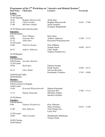 Programme of the 2nd Workshop on “Auxetics and Related Systems” Date/Time Chairman Friday: 13:00 Lunch 14:30 Opening 14:45 Bogdan Maruszewski 15:45 Vitaly Novikov 17:00 Mirosław Dudek 18:30 Dinner and welcome party Saturday: 8:00 Breakfast 9:00 Peter Pikhitsa 10:00 Gaoyuan Wei 11:15 Attila Imre 12:30 Lunch 14:00 Fabrizio Scarpa 16:15 Andrew Alderson 18:30 Banquet Sunday: 8:00 Breakfast 9:00 Posters Jarosław Rybicki 12:30 Lunch 14:00 Rod Lakes 16:15 Chris Smith 18:00 Round Table 20:00 Bonfire Monday: 8:00 Breakfast 9:00 Excursion to Rogalin 14:00 Lunch 15:00 Krzysztof Wojciechowski 17:15 Hajime Kimizuka 18:30 Dinner Tuesday: 8:00 Breakfast 9:00 Tadeusz Paszkiewicz 11:00 Kim Alderson 12:30 Lunch 14:00 Nikos Gouskos 16:00 Closing 18:00 Dinner Lecturer Attila Imre Bogdan Maruszewski Jacek Dziedzic Grzegorz Bergmanski Rod Lakes Andrew Alderson Krzysztof Wojciechowski Peter Pikhitsa Joseph Grima Chris Smith Tadeusz Paszkiewicz Fabrizio Scarpa Frank Nazare Naveen Ravirala Konstantin Tretiakov Hajime Kimizuka Gaoyuan Wei Miroslaw Dudek Jaroslaw Rybicki Kim Alderson Nikos Gouskos Teik-Cheng Lim Larry Peel Manabendra Mukherjee Tomasz Strek Tea break 16:45 – 17:00 11:00 – 11:15 16:00 – 16:15 16:00 – 16:15 17:45 – 18:00 17:00 – 17:15 10:45 – 11:00