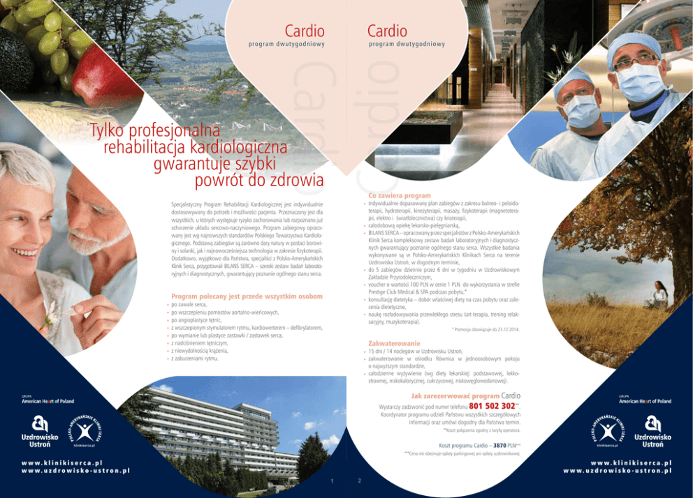Cardio Cardio program dwutygodniowy Cardio Cardio program dwutygodniowy Tylko profesjonalna rehabilitacja kardiologiczna gwarantuje szybki powrót do zdrowia zawiera program . Co indywidualnie dopasowany plan zabiegów z zakresu balneo- i peloido- Specjalistyczny Program Rehabilitacji Kardiologicznej jest indywidualnie dostosowywany do potrzeb i możliwości pacjenta. Przeznaczony jest dla wszystkich, u których występuje ryzyko zachorowania lub rozpoznano już schorzenie układu sercowo-naczyniowego. Program zabiegowy opracowany jest wg najnowszych standardów Polskiego Towarzystwa Kardiologicznego. Podstawą zabiegów są zarówno dary natury w postaci borowiny i solanki, jak i najnowocześniejsza technologia w zakresie fizykoterapii. Dodatkowo, wyjątkowo dla Państwa, specjaliści z Polsko-Amerykańskich Klinik Serca, przygotowali BILANS SERCA – szeroki zestaw badań laboratoryjnych i diagnostycznych, gwarantujący poznanie ogólnego stanu serca. . . . . . . polecany jest przede wszystkim osobom . Program po zawale serca, . po wszczepieniu pomostów aortalno-wieńcowych, . po angioplastyce tętnic, . z wszczepionym stymulatorem rytmu, kardiowerterem – defibrylatorem, . po wymianie lub plastyce zastawki / zastawek serca, . z nadciśnieniem tętniczym, . z niewydolnością krążenia, . z zaburzeniami rytmu. terapii, hydroterapii, kinezyterapii, masaży, fizykoterapii (magnetoterapii, elektro i światłolecznictwa) czy krioterapii, całodobową opiekę lekarsko-pielęgniarską, BILANS SERCA – opracowany przez specjalistów z Polsko-Amerykańskich Klinik Serca kompleksowy zestaw badań laboratoryjnych i diagnostycznych gwarantujący poznanie ogólnego stanu serca. Wszystkie badania wykonywane są w Polsko-Amerykańskich Klinikach Serca na terenie Uzdrowiska Ustroń, w dogodnym terminie, do 5 zabiegów dziennie przez 6 dni w tygodniu w Uzdrowiskowym Zakładzie Przyrodoleczniczym, voucher o wartości 100 PLN w cenie 1 PLN do wykorzystania w strefie Prestige Club Medical & SPA podczas pobytu,* konsultację dietetyka – dobór właściwej diety na czas pobytu oraz zalecenia dietetyczne, naukę rozładowywania przewlekłego stresu (art-terapia, trening relaksacyjny, muzykoterapia). * Promocja obowiązuje do 23.12.2014. . Zakwaterowanie dni / 14 noclegów w Uzdrowisku Ustroń, . 15zakwaterowanie w ośrodku Równica w jednoosobowym pokoju o najwyższym standardzie, . całodzienne wyżywienie (wg diety lekarskiej: podstawowej, lekkostrawnej, niskokalorycznej, cukrzycowej, niskowęglowodanowej). Jak zarezerwować program Cardio Wystarczy zadzwonić pod numer telefonu 801 502 302**. Koordynator programu udzieli Państwu wszystkich szczegółowych informacji oraz umówi dogodny dla Państwa termin. **Koszt połączenia zgodny z taryfą operatora. Koszt programu Cardio – 3870 PLN*** klinikiserca.pl klinikiserca.pl ***Cena nie obejmuje opłaty parkingowej ani opłaty uzdrowiskowej. w w w. k l i n i k i s e r c a . p l w w w. u z d r o w i s k o - u s t r o n . p l w w w. k l i n i k i s e r c a . p l w w w. u z d r o w i s k o - u s t r o n . p l 1 2