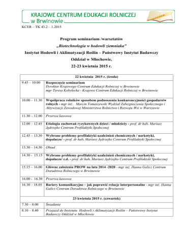 KCER – TK 43.2 – 1.2015 Program seminarium /warsztatów „Biotechnologia w hodowli ziemniaka” Instytut Hodowli i Aklimatyzacji Roślin – Państwowy Instytut Badawczy Oddział w Młochowie, 22-23 kwietnia 2015 r. 22 kwietnia 2015 r. (środa) 9.45 – 10.00 Rozpoczęcie seminarium Dyrektor Krajowego Centrum Edukacji Rolniczej w Brwinowie mgr Teresa Kobyłecka - Krajowe Centrum Edukacji Rolniczej w Brwinowie 10.00 – 11.30 Współpraca rolników sposobem podnoszenia konkurencyjności gospodarstw rolnych - mgr inż.. Marcin Tomaszewski Wydział Zabezpieczenia Społecznego i Aktywizacji Zawodowej Ministerstwa Rolnictwa i Rozwoju Wsi w Warszawie 11.30 – 12.00 Przerwa kawowa 12.00 – 12.45 Etiologia zachowań ryzykownych dzieci / młodzieży - prof. dr hab. Mariusz Jędrzejko Centrum Profilaktyki Społecznej 12.45 – 13.30 Wybrane problemy profilaktyki uzależnień chemicznych / narkotyki, dopalacze/ - prof. dr hab. Mariusz Jędrzejko Centrum Profilaktyki Społecznej 13.30 – 14.30 Obiad 14.30 - 15.15 Wybrane problemy profilaktyki uzależnień chemicznych / narkotyki, dopalacze/ c.d. - prof. dr hab. Mariusz Jędrzejko Centrum Profilaktyki Społecznej 15.15 – 16.00 Główne założenia PROW na lata 2014 -2020 - mgr inż. Hanna Galicz Centrum Doradztwa Rolniczego w Brwinowie 16.00 - 16.30 Przerwa kawowa 16.30 – 18.05 Bariery komunikacyjne – jak poprawić relacje interpersonalne - mgr inż. Hanna Galicz Centrum Doradztwa Rolniczego w Brwinowie 23 kwietnia 2015 r. (czwartek) 7.30 – 8.00 Śniadanie 8.10 – 8.40 Przejazd do Instytutu Hodowli i Aklimatyzacji Roślin – Państwowy Instytut Badawczy Oddział w Młochowie 8.45 – 9.05 Historia Instytutu Hodowli i Aklimatyzacji Roślin - Państwowy Instytut Badawczy Oddział w Młochowie, powitanie uczestników – prof. dr hab. Waldemar Marczewski IHAR –PIB Oddział w Młochowie 9.05 - 9.50 Jak dzikie i prymitywne uprawiane gatunki Solanum mogą poprawić odmiany ziemniaka – prof. dr hab. Ewa Zimoch – Guzowska IHAR – PIB Oddział w Młochowie 9.55 – 10.40 Mechanizmy odporności roślin na patogeny – dr hab. Jadwiga Śliwka IHAR – PIB Oddział w Młochowie 10.45 – 11.00 Przerwa kawowa 11.00 – 12.30 Zapoznanie ze strukturą organizacyjną, osiągnięciami naukowymi IHAR - PIB Oddział w Młochowie, zwiedzenie pracowni; Wirusy ziemniaka – mgr Anna Grupa Kolekcja In vitro - mgr Dorota Strzelczyk - Żyta Choroby bakteryjne i grzybowe ziemniaka – dr hab. Regina Lebecka, dr hab. Jadwiga Śliwka 12.35 – 13.10 Wykorzystanie zjawiska allelopatii w praktyce rolniczej – dr Dorota Sołtys – Kalina IHAR –PIB Oddział w Młochowie 13.15 – 14.00 Blaski i cienie identyfikacji genów cech ilościowych – prof. dr hab. Waldemar Marczewski IHAR –PIB Oddział w Młochowie 14.00 – 14.45 Wymagania egzaminacyjne z przykładami dla kwalifikacji R 03 w zawodach rolnik, technik rolnik i technik agrobiznesu – mgr inż. Monika Wrzesińska – Kopcik egzaminator CKE, mgr Teresa Kobyłecka KCER w Brwinowie. 14.45 Podsumowanie seminarium , analiza arkuszy ewaluacyjnych mgr Teresa Kobyłecka - Krajowe Centrum Edukacji Rolniczej w Brwinowie 15.00 Obiad Osoba odpowiedzialna: Teresa Kobyłecka tel. (22) 729 73 02 wew.24 kom. 784 929 842 e –mail [email protected] Miejsce zakwaterowania i szkolenia : Krajowe Centrum Edukacji Rolniczej, Centrum Doradztwa Rolniczego - hotel ul. Pszczelińska 99 05 -840 Brwinów