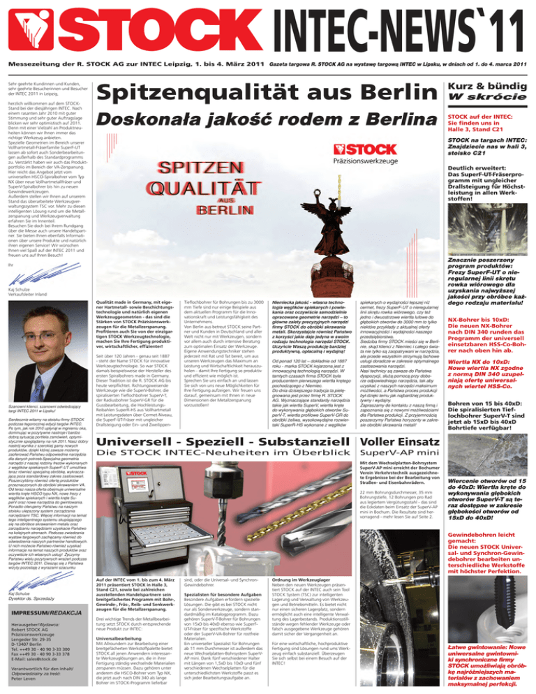 INTEC-NEWS`11 Messezeitung der R. STOCK AG zur INTEC Leipzig, 1. bis 4. März 2011 Gazeta targowa R. STOCK AG na wystawę targową INTEC w Lipsku, w dniach od 1. do 4. marca 2011 Sehr geehrte Kundinnen und Kunden, sehr geehrte Besucherinnen und Besucher der INTEC 2011 in Leipzig, herzlich willkommen auf dem STOCKStand bei der diesjährigen INTEC. Nach einem rasanten Jahr 2010 mit guter Stimmung und sehr guter Auftragslage blicken wir sehr optimistisch auf 2011. Denn mit einer Vielzahl an Produktneuheiten können wir Ihnen immer das richtige Werkzeug anbieten. Spezielle Geometrien im Bereich unserer Vollhartmetall-Fräserfamilie SuperF-UT lassen ab sofort auch Sonderbearbeitungen außerhalb des Standardprogramms zu. Verstärkt haben wir auch das Produktportfolio im Bereich der VA-Zerspanung. Hier reicht das Angebot jetzt vom universellen HSCO-Spiralbohrer vom Typ NX über neue Vollhartmetallfräser und SuperV-Spiralbohrer bis hin zu neuen Gewindewerkzeugen. Außerdem stellen wir Ihnen auf unserem Stand das überarbeitete Werkzeugverwaltungssystem TSC vor. Mehr zu diesen intelligenten Lösung rund um die Metallzerspanung und Werkzeugverwaltung erfahren Sie im Innenteil. Besuchen Sie doch bei Ihrem Rundgang über die Messe auch unsere Handelspartner. Sie bieten Ihnen ebenfalls Informationen über unsere Produkte und natürlich ihren eigenen Service! Wir wünschen Ihnen viel Spaß auf der INTEC 2011 und freuen uns auf Ihren Besuch! Spitzenqualität aus Berlin Doskonała jakość rodem z Berlina Qualität made in Germany, mit eigener Hartmetall- sowie Beschichtungstechnologie und natürlich eigenen Werkzeuggeometrien - das sind die Stärken von STOCK Präzisionswerkzeugen für die Metallzerspanung. Profitieren auch Sie von der einzigartigen STOCK Werkzeugtechnologie, machen Sie Ihre Fertigung produktiver, wirtschaftlicher, effizienter! Kaj Schulze Dyrektor ds. Sprzedaży IMPRESSUM/REDAKCJA Herausgeber/Wydawca: Robert STOCK AG Präzisionswerkzeuge Lengeder Str. 29-35 D-13407 Berlin Tel. ++49 30 - 40 90 3-33 300 Fax ++49 30 - 40 90 3-33 378 E-Mail: [email protected] Verantwortlich für den Inhalt/ Odpowiedzialny za treść: Peter Leven STOCK auf der INTEC: Sie finden uns in Halle 3, Stand C21 Deutlich erweitert: Das SuperF-UT-Fräserprogramm mit ungleicher Drallsteigung für Höchstleistung in allen Werkstoffen! Kaj Schulze Verkaufsleiter Inland Serdecznie witamy na stoisku firmy STOCK podczas tegorocznej edycji targów INTEC. Po tym, jak rok 2010 upłynął w mgnieniu oka, dominując w pozytywne nastroje i bardzo dobrą sytuację portfela zamówień, optymistycznie spoglądamy na rok 2011. Nasz dobry nastrój wynika z szerokiej gamy nowych produktów, dzięki której zawsze możemy zaoferować Państwu odpowiednie narzędzia dla danych potrzeb.Specjalna geometria narzędzi z naszej rodziny frezów wykonanych z węglików spiekanych SuperF-UT umożliwa teraz również specjalną obróbkę, wykraczającą poza standardowy zakres zastosowań. Poszerzyliśmy również ofertę produktów przeznaczonych do obróbki skrawaniem VA. Od teraz nasza oferta obejmuje uniwersalne wiertła kręte HSCO typu NX, nowe frezy z węglików spiekanych i wiertła kręte SuperV oraz nowe narzędzia do gwintowania. Ponadto oferujemy Państwu na naszym stoisku ulepszony system zarządzania narzędziami TSC. Więcej informacji na temat tego inteligentnego systemu skupiającego się na obróbce skrawaniem metalu oraz zarządzaniu narzędziami uzyskacie Państwo na kolejnych stronach. Podczas zwiedzania wystaw targowych zachęcamy również do odwiedzenia naszych partnerów handlowych. U nich możecie Państwo również uzyskać informacje na temat naszych produktów oraz oczywiście ich własnych usług! Życzymy Państwu wielu pozytywnych wrażeń podczas targów INTEC 2011. Ciesząc się z Państwa wizyty pozostaję z wyrazami szacunku W skrócie STOCK na targach INTEC: Znajdziecie nas w hali 3, stoisko C21 Ihr Szanowni klienci, szanowni odwiedzający targi INTEC 2011 w Lipsku! Kurz & bündig Seit über 120 Jahren - genau seit 1887 - steht der Name STOCK für innovative Werkzeugtechnologie. So war STOCK damals beispielsweise der Hersteller des ersten Spiralbohrers made in Germany. Dieser Tradition ist die R. STOCK AG bis heute verpflichtet. Richtungsweisende Werkzeuge wie die SuperV-Bohrer, die spiralisierten Tieflochbohrer SuperV-T, der Radiusbohrer SuperV-GR für die Gussbearbeitung, die HochleistungsReibahlen SuperR-HS aus Vollhartmetall mit Leistungsdaten über Cermet-Niveau, die SuperF-UT-Fräser mit ungleicher Drallsteigung oder Ein- und Zweilippen- Tieflochbohrer für Bohrungen bis zu 3000 mm Tiefe sind nur einige Beispiele aus dem aktuellen Programm für die Innovationskraft und Leistungsfähigkeit des Unternehmens. Von Berlin aus betreut STOCK seine Partner und Kunden in Deutschland und aller Welt nicht nur mit Werkzeugen, sondern vor allem auch durch intensive Beratung zum optimalen Einsatz der Werkzeuge. Eigene Anwendungstechniker stehen jederzeit mit Rat und Tat bereit, um aus unseren Werkzeugen das Maximum an Leistung und Wirtschaftlichkeit herauszuholen - damit Ihre Fertigung so produktiv und effizient wie möglich ist. Sprechen Sie uns einfach an und lassen Sie sich von uns neue Möglichkeiten für Ihre Fertigung aufzeigen. Wir freuen uns darauf, gemeinsam mit Ihnen in neue Dimensionen der Metallzerspanung vorzustoßen! Niemiecka jakość - własna technologia węglików spiekanych i powlekania oraz oczywiście samodzielnie opracowane geometrie narzędzi – to główne zalety precyzyjnych narzędzi firmy STOCK do obróbki skrawania metali. Skorzystajcie również Państwo z korzyści jakie daje jedyna w swoim rodzaju technologia narzędzi STOCK. Uczyńcie Waszą produkcję bardziej produktywną, opłacalną i wydajną! Od ponad 120 lat – dokładnie od 1887 roku - marka STOCK kojarzona jest z innowacyjną technologią narzędzi. W tamtych czasach firma STOCK była producentem pierwszego wiertła kręte