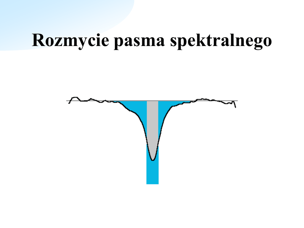 Rozmycie pasma spektralnego Rozmycie pasma spektralnego Z doświadczenia wiemy, że absorpcja lub emisja promieniowania przez badaną substancję występuje nie tylko przy częstości rezonansowej, tj. częstości odpowiadającej różnicy energii poziomów kwantowych, lecz również przy częstościach jej bliskich. Rozmycie pasma jest konsekwencją: • niedoskonałości aparatury pomiarowej oraz • konsekwencją pewnych praw fizyki Niedoskonałości aparatury pomiarowej • Niepełna monochromatyzacja promieniowania • Skończona szerokość szczelin wejściowych i wyjściowych • Niejednorodność pola magnetycznego w metodzie NMR Niezależne od aparatury przyczyny rozmycia pasma spektralnego • Zasada nieoznaczoności Heisenberga • Efekt Dopplera • Efekt Lorentza • Oddziaływania międzycząsteczkowe Zasada nieoznaczoności Heisenberga Czas życia cząsteczki na danym poziomie energetycznym i rozmycie energii tego poziomu spełniają zależność Et ~ 1034 J s Równanie to ilustruje sytuację, że stan n posiada dokładnie określoną energię tylko wtedy gdy t jest nieskończony. Skoro to nigdy nie ma miejsca to wszystkie poziomy energetyczne są rozmyte na pewną rozciągłość co w rezultacie daje poszerzenie linii. Np. Gdy czas życia stanu wynosi t 108 s to E 1026 J 0.0005 cm1 Naturalne poszerzenie linii jest bardzo małe w porównaniu z wkładem pochodzącym od innych przyczyn Odkrycie efektu Dopplera • Christian Doppler jako pierwszy w 1842 r. zaproponował wyjaśnienie występowania efektu polegającego na okresowej zmianie koloru światła gwiazd w układzie podwójnym jako skutek ich ruchu kołowego. • Naukowe badanie efektu Dopplera po raz pierwszy przeprowadził Christoph Ballot w 1845 r. Poprosił on grupę muzyków (trębaczy), aby wsiedli do pociągu i grali jeden ton. Słuchał go i zaobserwował, że dźwięk instrumentów staje się wyższy, kiedy pociąg zbliża się do niego. Gdy źródło muzyki się oddala, jego ton staje się niższy. Zmiana wysokości dźwięku była dokładnie taka, jak wyliczył uprzednio Doppler. • Niezależnie od Dopplera podobny efekt został zaobserwowany w 1848 r. przez Armanda Fizeau dla fal elektromagnetycznych. Efekt Dopplera Atomy i cząsteczki poruszając się chaotycznie w fazie objętościowej emitują w kierunku obserwatora (detektora) lub absorbują z danego kierunku promieniowanie o częstości innej niż częstość wynikająca z różnicy energii poziomów. Jest to efekt analogiczny do znanej z akustyki zmiany częstości dźwięku wysyłanego przez ruchomy obiekt Obiekty nieruchome Długość fali 1 2 3 Obaj obserwatorzy widzą jednakowe długości fal Źródło poruszające się w kierunku obserwatora po lewej stronie 1 2 3 3 Rejestruje krótsze fale 2 1 Rejestruje dłuższe fale Efekt Dopplera • Idea zjawiska jest następująca: – Źródło emituje EM promieniowanie o określonej długości (l) – Obserwator widzi długość lobs • Efekt Doppler’a “mówi” lobs < l jeśli źródło porusza się do obserwatora lobs > l jeśli źródło porusza się od obserwatora Efekt Dopplera Zależność Doppler’a : wersja dla światła Jeżeli źródło emituje EM promieniowanie o długości l, to widoczna zmiana w długości obserwowanej (lobs - l), wynosi: (lobs - l) / l = v/c v - prędkością względną w kierunku obserwatora c - prędkość światła Efekt Dopplera Dla promieniowania elektromagnetycznego (promieni świetlnych) Ruch do obserwujemy krótsze fale (przesunięcie do błękitu) a 1 a c 1 Ruch od obserwujemy dłuższe fale (przesunięcie do czerwieni) a 1 a c 1 a średnia prędkość poruszania się atomów a częstość obserwowana częstość odpowiadająca różnicy poziomów energetycznych Efekt Dopplera Bezładny ruch translacyjny cząsteczek powoduje rozmycie poziomów Gdy cząsteczka porusza się w stronę detektora wzrasta, l maleje Gdy cząsteczka oddala się od detektora maleje, l wzrasta Profil pasma powstający wskutek efektu Dopplera Szerokość pasma w połowie jego wysokości 2 2kBT ln 2 c M 1 2 M masa cząsteczki Rozszerzenie Dopplera linii widmowej zależy od temperatury i masy cząsteczki Przykładowe zastosowania • Zmiana barwy światła pochodzącego z oddalających się galaktyk • Wyznaczanie temperatury gwiazd Efekt Lorentza (poszerzenie ciśnieniowe) Wzrost ciśnienia i temperatury powoduje zderzenia cząsteczek co skraca czas życia stanu wzbudzonego. Zderzenia w fazie objętościowej powodują deformację powłok elektronowych i w konsekwencji niewielką zmianę energii poziomów oraz skrócenie czasu życia poziomu wzbudzonego 2 1 czas pomiędzy zderzeniami