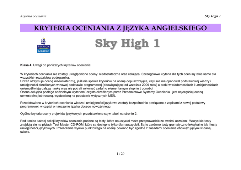 Kryteria oceniania Sky High 1 KRYTERIA OCENIANIA Z JĘZYKA ANGIELSKIEGO Sky High 1 Klasa 4. Uwagi do poniższych kryteriów oceniania: W kryteriach oceniania nie zostały uwzględnione oceny: niedostateczna oraz celująca. Szczegółowe kryteria dla tych ocen są takie same dla wszystkich rozdziałów podręcznika. Uczeń otrzymuje ocenę niedostateczną, jeśli nie spełnia kryteriów na ocenę dopuszczającą, czyli nie ma opanował podstawowej wiedzy i umiejętności określonych w nowej podstawie programowej (obowiązującej od września 2009 roku) a braki w wiadomościach i umiejętnościach uniemożliwiają dalszą naukę oraz nie potrafi wykonać zadań o elementarnym stopniu trudności Ocena celująca podlega oddzielnym kryteriom, często określanym przez Przedmiotowe Systemy Oceniania i jest najczęściej oceną semestralną lub roczną, wystawianą na podstawie wytycznych MEN. Przedstawione w kryteriach oceniania wiedza i umiejętności językowe zostały bezpośrednio powiązane z zapisami z nowej podstawy programowej, w części o nauczaniu języka obcego nowożytnego. Ogólne kryteria oceny projektów językowych przedstawione są w tabeli na stronie 2. Pod koniec każdej sekcji kryteriów oceniania podane są testy, które nauczyciel może przeprowadzić ze swoimi uczniami. Wszystkie testy znajdują się na płytach Test Master CD-ROM, które są dostępne tylko dla nauczycieli. Są to zarówno testy gramatyczno-leksykalne jak i testy umiejętności językowych. Przeliczenie wyniku punktowego na ocenę powinno być zgodne z zasadami oceniania obowiązującymi w danej szkole. 1 / 20 Kryteria oceniania Sky High 1 KRYTERIA OCENIANIA POZIOM PODSTAWOWY OGÓLNE KRYTERIA OCENIANIA OCENA PROJEKTÓW POZIOM PONADPODSTAWOWY Ocena dopuszczająca Ocena dostateczna Ocena dobra Ocena bardzo dobra ☼ niewielka samodzielność ☼ odtwórcza wiedza ☼ skuteczne próby opanowania materiału ☼ wiedza i umiejętności na poziomie minimalnym, umożliwiającym dalsze przyswajanie materiału ☼ wolne tempo wypowiedzi ☼ proste zdania ☼ właściwa reakcja językowa na prostą wypowiedź rozmówcy ☼ poprawne mówienie z uwzględnieniem zasad właściwej wymowy, zapewniających zrozumienie wypowiedzi ☼ dopuszczalne błędy językowe, które nie zakłócają rozumienia ☼ logiczna konstrukcja wypowiedzi ☼ niezbyt urozmaicone konstrukcje do wyrażania opinii ☼ błędy językowe, które nie zakłócają komunikacji; poprawna wymowa i intonacja ☼ wypowiedź w pełni zrozumiała ☼ poprawny wybór formy i stylu wypowiedzi ☼ wypowiedź ciekawa, płynna, bogata w treść i słownictwo ☼ poprawna wymowa i intonacja, zbliżona do wypowiedzi rodzimych użytkowników języka ☼ sporadyczne błędy językowe, które nie zakłócają komunikacji ☼ wypowiedź w całości zrozumiała ☼ bezbłędny wybór formy i stylu wypowiedzi Projekt oparty o podstawowe słownictwo i wyrażenia. Praca w większości odtwórcza, zawierająca liczne błędy, które jednak nie zakłócają odbioru. Projekt zbudowany w oparciu o proste zdania. Praca zawierająca sporo błędów językowych. Widoczny większy stopień samodzielności. Ograniczone słownictwo. Praca ciekawa, ale nie wyczerpująca tematu i możliwości leksykalnych. Zdania proste, ale w większości poprawne. Pojedyncze błędy językowe. Praca bardzo interesująca, wykonana z dużą starannością. Wyczerpany temat i wykorzystane możliwości leksykalne. Użyte w pełni poprawne konstrukcje gramatyczne. 2 / 20 Kryteria oceniania Lekcje 1-5 Sky High 1 1 Hello, I'm Rob. 2 Her name's Jodie. 3 How old are you? 4 The English language 5 Revision Uczeń posługuje się bardzo podstawowym zasobem środków językowych, umożliwiających realizację pozostałych wymagań ogólnych w zakresie tematów: człowiek, życie rodzinne i towarzyskie. Cele kształcenia z podstawy programowej 2009: OCENA DOPUSZCZAJĄCA OCENA DOSTATECZNA OCENA DOBRA OCENA BARDZO DOBRA Uczeń przedstawia się. Potrafi przywitać się i przedstawić: Hi / Hello! I'm... . Potrafi przywitać się, przedstawić: Hi / Hello! I’m..., My name’s… Potrafi przywitać się, przedstawić, zapytać o imię: Hi / Hello! I’m..., My name’s…, What’s your name? Potrafi przywitać się, przedstawić, zapytać o imię: Hi / Hello! I’m..., My name’s…, What’s your name? Prowadzi swobodny dialog, wita osoby: Welcome to… Uczeń przedstawia członków swojej rodziny. Wymienia członków swojej rodziny. Krótko opisuje swoją rodzinę: This is my mother Ann. Dokładnie opisuje swoją rodzinę. Dokładnie opisuje rodzinę, rozmawia na temat rodziny, zadaje pytania o imiona innych osób: What’s his / her name? Uczeń mówi, co posiada. Częściowo poprawnie uzupełnia zdania przymiotnikami dzierżawczymi: my, your, his, her. W większości poprawnie uzupełnia zdania przymiotnikami dzierżawczymi: my, your, his, her. Zasadniczo poprawnie uzupełnia zdania przymiotnikami dzierżawczymi: my, his, her. Poprawnie uzupełnia zdania i stosuje w wypowiedzi przymiotniki dzierżawcze: my, his, her. Znajomość środków językowych Zna większość liczebników 150, ale popełnia liczne błędy przy ich zapisywaniu. Zna i potrafi zapisać większość liczebników 1-50. Zna wszystkie liczebniki 1-50, przy zapisywaniu popełnia sporadyczne błędy w pisowni. Całkowicie poprawnie stosuje i zapisuje liczebniki 1-50. 3 / 20 Kryteria oceniania Sky High 1 Uczeń opisuje ludzi. Zna kilka spośród poznanych nazw krajów anglojęzycznych. Zna większość poznanych nazw krajów anglojęzycznych i odpowiadających im narodowości. Zna nazwy poznanych krajów anglojęzycznych i odpowiadające im narodowości. Potrafi podać kraj pochodzenia osób. Zna nazwy poznanych krajów anglojęzycznych i odpowiadające im narodowości. Potrafi podać kraj pochodzenia osób oraz ich narodowość. Uczeń podaje swój wiek. Uczeń prosi o informacje. Odpowiada na pytanie o wiek: I’m ten. Pyta o wiek: How o