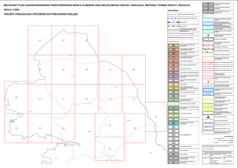 SKALA 1:2000 01W -15W Tereny infrastruktury technicznej - 01K -09K Tereny infrastruktury technicznej Kanalizacja OZNACZENIA: Tereny infrastruktury technicznej - 01C Inne: Granice rysunku planu w skali 1:1000 Obiekty i obszary wpisane do rejestru Granice gminy przestrzennego miasta Alwerni - obszar wpisany przestrzennego miasta Alwerni - obszar wpisany Obiekty wpisane do gminnej ewidencji zagospodarowania Nieprzekraczalne linie zabudowy 01 02 1 03 Stanowiska archeologiczne autostrady A4 01MN -405MN Tereny zabudowy mieszkaniowej jednorodzinnej 01MN/U -74MN/U Tereny zabudowy mieszkaniowej 01MW -04MW Tereny zabudowy mieszkaniowej wielorodzinnej NIEPORAZ 01MW/U Tereny zabudowy mieszkaniowej 01U -58U 01Up -05Up 04 05 06 07 01US -07US 08 Tereny sportu i rekreacji 01U/P -29U/P Strefy techniczne linii elektroenergetycznych 01P -02P REGULICE 110kV 01PE -02PE Tereny powierzchniowej eksploatacji kruszyw 01R -139R Tereny rolnicze 01RM -60RM Tereny zabudowy zagrodowej w gospodarstwach rolnych, hodowlanych i ogrodniczych GROJEC Stacje transformatorowe SN/nN 01RZ -301RZ "REGULICE" 09 01ZL - 168ZL 10 11 12 13 14 01ZM Granice rezerwatu przyrody "Dolina Potoku Rudno" Tereny zabudowy zagrodowej w Granice otuliny rezerwatu przyrody "Dolina Potoku Rudno" Tereny przeznaczone do zalesienia Krajobrazowego 01ZN Tereny zieleni - rezerwat przyrody "Dolina Potoku Rudno" Krajobrazowego 01ZP -12ZP 01ZPp 21 01ZC -06ZC Tereny cmentarzy 01WS -81WS 18 15 16 17 20 Strefy sanitarne cmentarzy - 50 m 01KD-A -06KD-A Strefy sanitarne cmentarzy - 150 m 01KD-G -03KD-G ALWERNIA 01KD-Z -20KD-Z 01KD-L -27KD-L /2015 RADY MIEJSKIEJ W ALWERNI 01KD-D -141KD-D Z DNIA 2015 ROKU 01KDW -276KDW 19 01KS -11KS 01KK -19KK 01E 01G -05G Miejscowy plan zagospodarowania przestrzennego miasta Alwernia oraz Tereny kolejowe MP-1867 Tereny infrastruktury technicznej Elektroenergetyka Tereny infrastruktury technicznej Gazownictwo Rysunek planu Data: SL-0514 mgr Dorota Bakun