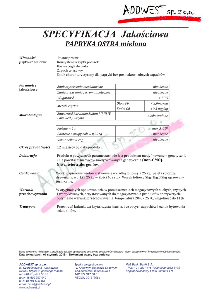 __________________________________ SPECYFIKACJA Jakościowa PAPRYKA OSTRA mielona Własności fizyko-chemiczne Postać proszek Konsystencja sypki proszek Barwa ceglasto ruda Zapach właściwy Smak charakterystyczny dla papryki bez posmaków i obcych zapachów Parametry jakościowe Zanieczyszczenia mechaniczne nieobecne Zanieczyszczenia ferromagnetyczne nieobecne < 11% Wilgotność Metale ciężkie: Mikrobiologia Ołów Pb < 2,0mg/kg Kadm Cd < 0.3 mg/kg Zawartość barwnika Sudan I,II,III,IV Para Red ,Biksyna niedozwolone Pleśnie w 1g max 5×104 Bakterie z grupy coli w 0,001g nieobecne Salmonella w 25g nieobecne Okres przydatności 12 miesięcy od daty produkcji. Deklaracja Produkt o powyższych parametrach nie jest produktem modyfikowanym genetycznie i nie powstał z surowców modyfikowanych genetycznie (non-GMO). Nie zawiera alergenów. Opakowania Worki papierowe wielowarstwowe z wkładką foliową a 25 kg, paleta zbiorcza drewniana, worki a 25 kg w ilości 40 sztuk. Worek foliowy 5kg ,1kg,0,5kg zgrzewany termicznie. Warunki przechowywania W oryginalnych opakowaniach, w pomieszczeniach magazynowych suchych, czystych i wentylowanych, przystosowanych do magazynowania produktów spożywczych. optymalne warunki przechowywania: temperatura 200C - 25 0C, wilgotność do 11%. Transport Przestrzeń ładunkowa kryta, czysta i sucha, bez obcych zapachów i oznak bytowania szkodników. Dane zawarte w niniejszym Certyfikacie Jakości opracowane zostały na postawie Certyfikatów i Norm Jakościowych Producentów lub Dostawców. Data aktualizacji: 01 stycznia 2016r. Dokument ważny bez podpisu _____________________________________________________________________________________________________ ADDWEST sp. z o.o. ul. Czereśniowa 3 Wielkawieś 62-060 Stęszew, powiat poznański tel.:+48 (61) 813 58 16 tel.:+ 48 609 797 040 tel.:+48 791 536 164 email: [email protected] www.addwest.pl Spółka zarejestrowana w Krajowym Rejestrze Sądowym pod numerem: 0000362541 NIP 777 317 68 51 REGON 301517084 ING Bank Śląski S.A. PLN 19 1050 1416 1000 0090 9862 6139 Kapitał Zakładowy 1 980 000.00 PLN