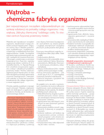 Farmakoterapia Wa˛troba – chemiczna fabryka organizmu Jest najważniejszym narządem odpowiedzialnym za syntezę substancji na potrzeby całego organizmu i największą „fabryką chemiczną” ludzkiego ciała. To również centrum fizycznej przemiany materii. Wątroba jest największym narządem organizmu, zbudowanym z tysięcy komórek zwanych hepatocytami. Odgrywa ważną rolę w układzie pokarmowym, wydzielniczym i wydalniczym, uczestnicząc w metabolizmie tłuszczów, węglowodanów i białek. Szczególne znaczenie mają wytwarzane przez nią: żółć, niezbędna do trawienia tłuszczów, i fibrynogen uczestniczący w procesie krzepnięcia krwi. Poza tym, wątroba magazynuje żelazo i witaminy A, D, E, niewielkie ilości B12 i C. Poprzez filtrację krwi umożliwia oczyszczanie organizmu z toksyn i szkodliwych produktów przemiany materii. Pomimo zdolności regeneracyjnych hepatocytów, ich zbyt duże obciążenie powoduje ograniczenie czynności fizjologicznych i niewydolność wątroby, co może mieć poważne konsekwencje dla całego organizmu, a nawet zagrażać życiu. Choroby wątroby są jednymi z najczęstszych schorzeń. Niestety, większość osób nimi dotkniętych w ogóle nie jest świadoma choroby, aż do bardzo zaawansowanego stadium. Pierwszym niepokojącym objawem niewydolności wątroby są wzdęcia po posiłkach, mdłości, uczucie sytości i kłucia lub ból po prawej stronie brzucha promieniujący aż pod żebra. Przejawami przewlekłych chorób wątroby mogą być: osłabienie, łatwe męczenie się, brak apetytu, zmiany skórne, a także niedokrwistość i zaburzenia krzepnięcia krwi. Ponadto, mogą wystąpić zaburzenia miesiączkowania i płodności u kobiet, a u mężczyzn problemy z potencją 8 oraz objawy feminizacji (występowanie cech żeńskich, np. zmiana sylwetki i wyglądu zewnętrznych narządów płciowych, podwyższenie skali głosu). Przyczyny niewydolności wątroby to: •niewłaściwa dieta (zbyt obfite i tłuste posiłki), •nadużywanie alkoholu, •nadużywanie lub przewlekłe stosowanie niektórych leków (fenytoiny, paracetamolu, diklofenaku, flukonazolu, erytromycyny, amiodaronu, statyn, ranitydyny), •toksyny środowiskowe (chlor i metale ciężkie zanieczyszczające wodę), •wirusy (wirusowe zapalenia – żółtaczki typu A, B, C, E, cytomegalia), •pasożyty (motylica wątrobowa), •zatrucia toksynami z grzybów lub zepsutym pokarmem. Ze względu na to, że wielu z wymienionych czynników nie można całkowicie wyeliminować, warto zainteresować się profilaktyką chorób wątroby. Do działań profilaktycznych zalicza się: •dietę lekkostrawną, bogatą w gruboziarniste pieczywo, owoce i warzywa zawierające nienasycone kwasy tłuszczowe i witaminy; •ograniczenie ilości dań tłustych i smażonych na rzecz duszonych, gotowanych i pieczonych; •spożywanie posiłków powoli, regularnie (4–5 dziennie), w rozsądnych ilościach; •unikanie nadmiaru soli (zaleca się przyprawianie potraw ziołami), ostrych przypraw i cukru (można zastąpić go przekąskami owocowowarzywnymi); •utrzymywanie masy ciała odpowiedniej do wieku i wzrostu; •zachowywanie odpowiedniej higieny, przede wszystkim mycie warzyw i owoców przed spożyciem oraz częste mycie rąk; •ograniczenie ilości alkoholu, kawy, napojów gazowanych i rzucenie palenia; •stosowanie tylko niezbędnych leków, przez czas konieczny do wyleczenia; •badania kontrolne w przypadku farmakoterapii niektórymi antybiotykami i podczas stosowania doustnych środków antykoncepcyjnych; •stosowanie preparatów zawierających naturalne substancje budulcowe, przyspieszające regenerację i wspomagające pracę wątroby. Składniki preparatów stosowanych w dolegliwościach wątrobowych W leczeniu i profilaktyce chorób wątroby zaleca się stosowanie leków pochodzenia naturalnego. Należą do nich preparaty zawierające: •wyciąg z ostropestu plamistego, •wyciąg z karczocha, •wyciąg z orczy boldo, •wyciąg z ostryża długiego (kurkumy), •fosfolipidy z nasion soi, •aminokwasy. Ostropest plamisty (Silybum marianum L.) Owoce ostropestu (Fructus Silybi mariani) są surowcem farmaceutycznym. W suchej owocni i łupinie nasiennej roślina kumuluje sylimarynę – grupę flawonolignanów, czyli związków zaliczanych do flawonoidów. Substancje te rzadko występują w świecie roślin. W skład sylimaryny wchodzą: sylibina w dwóch formach izomerycznych A i B (kompleks określany jako sylibinina), izosylibinina w dwóch formach izomerycznych A i B (kompleks tzw. izosylibininy), sylikrystyna (syn. sylichrystyna) i sylidianina (syn. sylidionina). Działanie lecznicze na wątrobę przypisywane jest głównie sylibinie. Ostropest plamisty należy do grupy roślin leczniczych, których wpływ na organizm ludzki jest bardzo dobrze Farmakoterapia interakcji pomiędzy sylimaryną a lekami syntetycznymi. Ze wzglądu na aktywność cytoprotekcyjną, antykancerogenną i przeciwzapalną, substancja ta może mieć zastosowanie w dermatologii. Ostropest plamisty udokumentowany. Flawonolignany wykazują działanie antyhepatotoksyczne i ochronne na wątrobę, polegające na stabilizowaniu membran hepatocytów i niedopuszczaniu do łączenia się toksyn z powierzchnią komórek. Przypuszczalnie sylimaryna wpływa stymulująco na rybosomalne RNA komórek wątroby oraz zwiększa syntezę białek hepatocytowych. Ponadto, stabilizuje komórki tuczne, chroni przed promieniowaniem, które powoduje zahamowanie syntezy wątrobowego i śledzionowego DNA i RNA. Wykazuje też działanie antagonistyczne w stosunku do toksyn muchomora sromotnikowego: falotoksyn i amatotoksyn. Działanie odtruwające przejawia się obniżeniem stężenia bilirubiny we krwi oraz normalizowaniem parametrów (AST, ALT, GGT). Preparaty zawierające kompleks flawonolignanów są zalecane w długotrwałej terapii chorób wątroby wywołanych alkoholizmem, a także w leczeniu wirusowego zapalenia wątrob