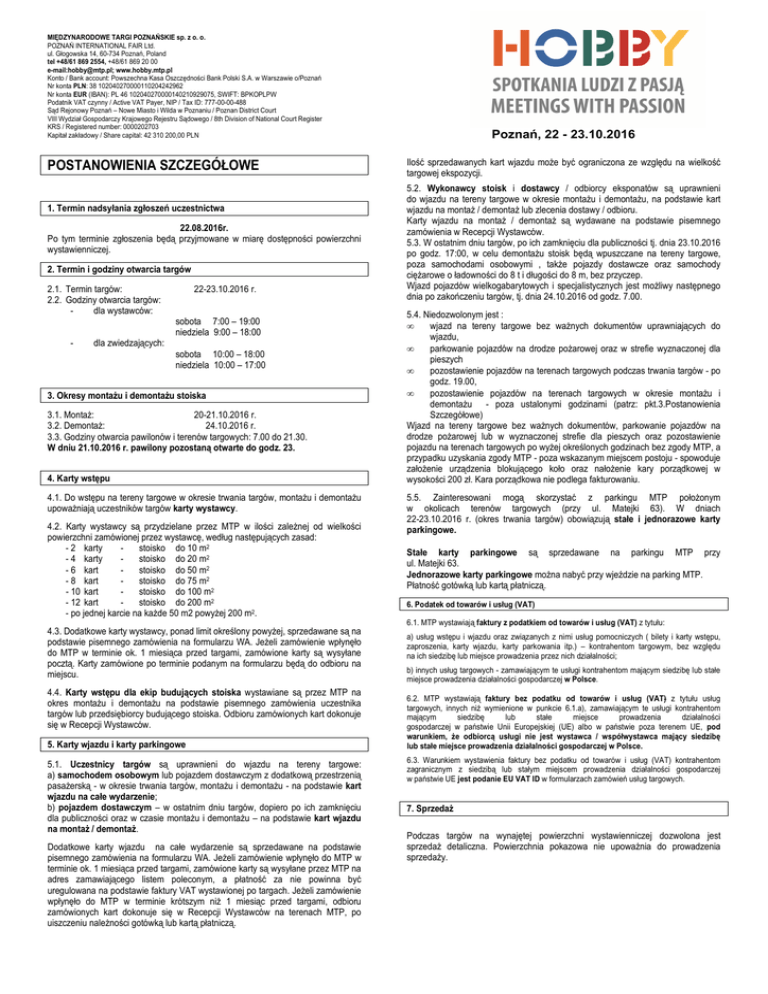 MIĘDZYNARODOWE TARGI POZNAŃSKIE sp. z o. o. POZNAŃ INTERNATIONAL FAIR Ltd. ul. Głogowska 14, 60-734 Poznań, Poland tel +48/61 869 2554, +48/61 869 20 00 e-mail:[email protected]; www.hobby.mtp.pl Konto / Bank account: Powszechna Kasa Oszczędności Bank Polski S.A. w Warszawie o/Poznań Nr konta PLN: 38 102040270000110204242962 Nr konta EUR (IBAN): PL 46 102040270000140210929075, SWIFT: BPKOPLPW Podatnik VAT czynny / Active VAT Payer, NIP / Tax ID: 777-00-00-488 Sąd Rejonowy Poznań – Nowe Miasto i Wilda w Poznaniu / Poznan District Court VIII Wydział Gospodarczy Krajowego Rejestru Sądowego / 8th Division of National Court Register KRS / Registered number: 0000202703 Kapitał zakładowy / Share capital: 42 310 200,00 PLN POSTANOWIENIA SZCZEGÓŁOWE 1. Termin nadsyłania zgłoszeń uczestnictwa 22.08.2016r. Po tym terminie zgłoszenia będą przyjmowane w miarę dostępności powierzchni wystawienniczej. 2. Termin i godziny otwarcia targów 2.1. Termin targów: 2.2. Godziny otwarcia targów: dla wystawców: 22-23.10.2016 r. sobota 7:00 – 19:00 niedziela 9:00 – 18:00 - dla zwiedzających: sobota 10:00 – 18:00 niedziela 10:00 – 17:00 3. Okresy montażu i demontażu stoiska 3.1. Montaż: 20-21.10.2016 r. 3.2. Demontaż: 24.10.2016 r. 3.3. Godziny otwarcia pawilonów i terenów targowych: 7.00 do 21.30. W dniu 21.10.2016 r. pawilony pozostaną otwarte do godz. 23. 4. Karty wstępu 4.1. Do wstępu na tereny targowe w okresie trwania targów, montażu i demontażu upoważniają uczestników targów karty wystawcy. 4.2. Karty wystawcy są przydzielane przez MTP w ilości zależnej od wielkości powierzchni zamówionej przez wystawcę, według następujących zasad: - 2 karty stoisko do 10 m2 - 4 karty stoisko do 20 m2 - 6 kart stoisko do 50 m2 - 8 kart stoisko do 75 m2 - 10 kart stoisko do 100 m2 - 12 kart stoisko do 200 m2 - po jednej karcie na każde 50 m2 powyżej 200 m2. Poznań, 22 - 23.10.2016 Ilość sprzedawanych kart wjazdu może być ograniczona ze względu na wielkość targowej ekspozycji. 5.2. Wykonawcy stoisk i dostawcy / odbiorcy eksponatów są uprawnieni do wjazdu na tereny targowe w okresie montażu i demontażu, na podstawie kart wjazdu na montaż / demontaż lub zlecenia dostawy / odbioru. Karty wjazdu na montaż / demontaż są wydawane na podstawie pisemnego zamówienia w Recepcji Wystawców. 5.3. W ostatnim dniu targów, po ich zamknięciu dla publiczności tj. dnia 23.10.2016 po godz. 17:00, w celu demontażu stoisk będą wpuszczane na tereny targowe, poza samochodami osobowymi , także pojazdy dostawcze oraz samochody ciężarowe o ładowności do 8 t i długości do 8 m, bez przyczep. Wjazd pojazdów wielkogabarytowych i specjalistycznych jest możliwy następnego dnia po zakończeniu targów, tj. dnia 24.10.2016 od godz. 7.00. 5.4. Niedozwolonym jest : • wjazd na tereny targowe bez ważnych dokumentów uprawniających do wjazdu, • parkowanie pojazdów na drodze pożarowej oraz w strefie wyznaczonej dla pieszych • pozostawienie pojazdów na terenach targowych podczas trwania targów - po godz. 19.00, • pozostawienie pojazdów na terenach targowych w okresie montażu i demontażu - poza ustalonymi godzinami (patrz: pkt.3.Postanowienia Szczegółowe) Wjazd na tereny targowe bez ważnych dokumentów, parkowanie pojazdów na drodze pożarowej lub w wyznaczonej strefie dla pieszych oraz pozostawienie pojazdu na terenach targowych po wyżej określonych godzinach bez zgody MTP, a przypadku uzyskania zgody MTP - poza wskazanym miejscem postoju - spowoduje założenie urządzenia blokującego koło oraz nałożenie kary porządkowej w wysokości 200 zł. Kara porządkowa nie podlega fakturowaniu. 5.5. Zainteresowani mogą skorzystać z parkingu MTP położonym w okolicach terenów targowych (przy ul. Matejki 63). W dniach 22-23.10.2016 r. (okres trwania targów) obowiązują stałe i jednorazowe karty parkingowe. Stałe karty parkingowe są sprzedawane na parkingu MTP przy ul. Matejki 63. Jednorazowe karty parkingowe można nabyć przy wjeździe na parking MTP. Płatność gotówką lub kartą płatniczą. 6. Podatek od towarów i usług (VAT) 6.1. MTP wystawiają faktury z podatkiem od towarów i usług (VAT) z tytułu: 4.3. Dodatkowe karty wystawcy, ponad limit określony powyżej, sprzedawane są na podstawie pisemnego zamówienia na formularzu WA. Jeżeli zamówienie wpłynęło do MTP w terminie ok. 1 miesiąca przed targami, zamówione karty są wysyłane pocztą. Karty zamówione po terminie podanym na formularzu będą do odbioru na miejscu. 4.4. Karty wstępu dla ekip budujących stoiska wystawiane są przez MTP na okres montażu i demontażu na podstawie pisemnego zamówienia uczestnika targów lub przedsiębiorcy budującego stoiska. Odbioru zamówionych kart dokonuje się w Recepcji Wystawców. 5. Karty wjazdu i karty parkingowe 5.1. Uczestnicy targów są uprawnieni do wjazdu na tereny targowe: a) samochodem osobowym lub pojazdem dostawczym z dodatkową przestrzenią pasażerską - w okresie trwania targów, montażu i demontażu - na podstawie kart wjazdu na całe wydarzenie; b) pojazdem dostawczym – w ostatnim dniu targów, dopiero po ich zamknięciu dla publiczności oraz w czasie montażu i demontażu – na podstawie kart wjazdu na montaż / demontaż. Dodatkowe karty wjazdu na całe wydarzenie są sprzedawane na podstawie pisemnego zamówienia na formularzu WA. Jeżeli zamówienie wpłynęło do MTP w terminie ok. 1 miesiąca przed targami, zamówione karty są wysyłane przez MTP na adres zamawiającego listem poleconym, a płatność za nie powinna być uregulowana na podstawie faktury VAT wystawionej po targach. Jeżeli zamówienie wpłynęło do MTP w terminie krótszym niż 1 miesiąc przed targami, odbioru zamówionych kart dokonuje się w Recepcji Wystawców na terenach MTP, po uiszczeniu należności gotówką lub kartą płatniczą. a) usług wstępu i wjazdu oraz związanych z nimi usług pomocniczych ( bilety i karty ws