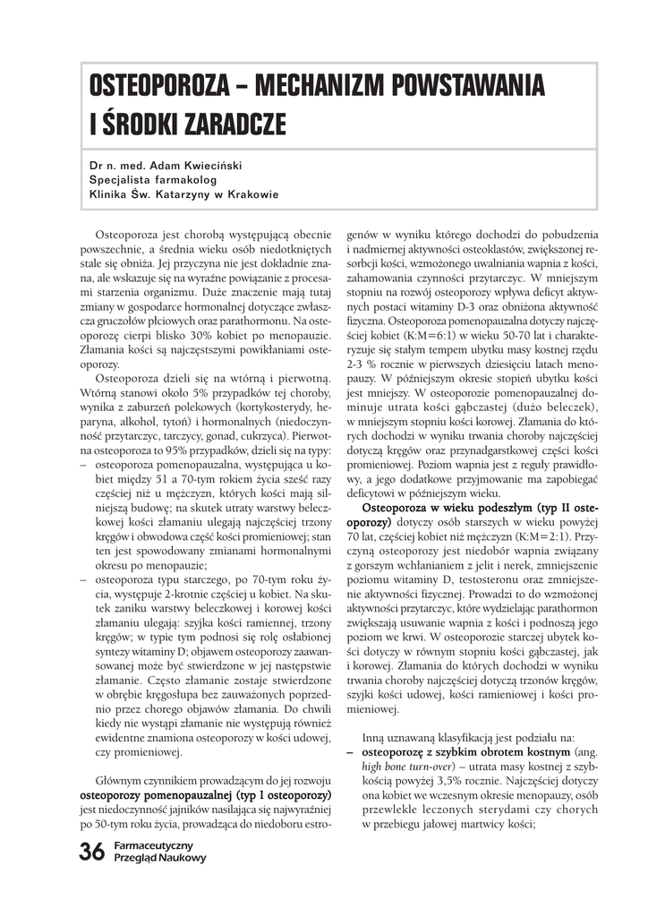 OSTEOPOROZA MECHANIZM POWSTAWANIA I RODKI ZARADCZE Nr 9/2007 Dr n. med. Adam Kwieciñski Specjalista farmakolog Klinika w. Katarzyny w Krakowie Osteoporoza jest chorobą występującą obecnie powszechnie, a średnia wieku osób niedotkniętych stale się obniża. Jej przyczyna nie jest dokładnie znana, ale wskazuje się na wyraźne powiązanie z procesami starzenia organizmu. Duże znaczenie mają tutaj zmiany w gospodarce hormonalnej dotyczące zwłaszcza gruczołów płciowych oraz parathormonu. Na osteoporozę cierpi blisko 30% kobiet po menopauzie. Złamania kości są najczęstszymi powikłaniami osteoporozy. Osteoporoza dzieli się na wtórną i pierwotną. Wtórną stanowi około 5% przypadków tej choroby, wynika z zaburzeń polekowych (kortykosterydy, heparyna, alkohol, tytoń) i hormonalnych (niedoczynność przytarczyc, tarczycy, gonad, cukrzyca). Pierwotna osteoporoza to 95% przypadków, dzieli się na typy: – osteoporoza pomenopauzalna, występująca u kobiet między 51 a 70-tym rokiem życia sześć razy częściej niż u mężczyzn, których kości mają silniejszą budowę; na skutek utraty warstwy beleczkowej kości złamaniu ulegają najczęściej trzony kręgów i obwodowa część kości promieniowej; stan ten jest spowodowany zmianami hormonalnymi okresu po menopauzie; – osteoporoza typu starczego, po 70-tym roku życia, występuje 2-krotnie częściej u kobiet. Na skutek zaniku warstwy beleczkowej i korowej kości złamaniu ulegają: szyjka kości ramiennej, trzony kręgów; w typie tym podnosi się rolę osłabionej syntezy witaminy D; objawem osteoporozy zaawansowanej może być stwierdzone w jej następstwie złamanie. Często złamanie zostaje stwierdzone w obrębie kręgosłupa bez zauważonych poprzednio przez chorego objawów złamania. Do chwili kiedy nie wystąpi złamanie nie występują również ewidentne znamiona osteoporozy w kości udowej, czy promieniowej. Głównym czynnikiem prowadzącym do jej rozwoju osteoporozy pomenopauzalnej (typ I osteoporozy) jest niedoczynność jajników nasilająca się najwyraźniej po 50-tym roku życia, prowadząca do niedoboru estro- !$ Farmaceutyczny Przegl¹d Naukowy genów w wyniku którego dochodzi do pobudzenia i nadmiernej aktywności osteoklastów, zwiększonej resorbcji kości, wzmożonego uwalniania wapnia z kości, zahamowania czynności przytarczyc. W mniejszym stopniu na rozwój osteoporozy wpływa deficyt aktywnych postaci witaminy D-3 oraz obniżona aktywność fizyczna. Osteoporoza pomenopauzalna dotyczy najczęściej kobiet (K:M=6:1) w wieku 50-70 lat i charakteryzuje się stałym tempem ubytku masy kostnej rzędu 2-3 % rocznie w pierwszych dziesięciu latach menopauzy. W późniejszym okresie stopień ubytku kości jest mniejszy. W osteoporozie pomenopauzalnej dominuje utrata kości gąbczastej (dużo beleczek), w mniejszym stopniu kości korowej. Złamania do których dochodzi w wyniku trwania choroby najczęściej dotyczą kręgów oraz przynadgarstkowej części kości promieniowej. Poziom wapnia jest z reguły prawidłowy, a jego dodatkowe przyjmowanie ma zapobiegać deficytowi w późniejszym wieku. Osteoporoza w wieku podeszłym (typ II osteoporozy) dotyczy osób starszych w wieku powyżej 70 lat, częściej kobiet niż mężczyzn (K:M=2:1). Przyczyną osteoporozy jest niedobór wapnia związany z gorszym wchłanianiem z jelit i nerek, zmniejszenie poziomu witaminy D, testosteronu oraz zmniejszenie aktywności fizycznej. Prowadzi to do wzmożonej aktywności przytarczyc, które wydzielając parathormon zwiększają usuwanie wapnia z kości i podnoszą jego poziom we krwi. W osteoporozie starczej ubytek kości dotyczy w równym stopniu kości gąbczastej, jak i korowej. Złamania do których dochodzi w wyniku trwania choroby najczęściej dotyczą trzonów kręgów, szyjki kości udowej, kości ramieniowej i kości promieniowej. Inną uznawaną klasyfikacją jest podziału na: – osteoporozę z szybkim obrotem kostnym (ang. high bone turn-over) – utrata masy kostnej z szybkością powyżej 3,5% rocznie. Najczęściej dotyczy ona kobiet we wczesnym okresie menopauzy, osób przewlekle leczonych sterydami czy chorych w przebiegu jałowej martwicy kości; OSTEOPOROZA MECHANIZM POWSTAWANIA I RODKI ZARADCZE – osteoporozę z wolnym obrotem kostnym (ang. low bone turn-over) – utrata masy kostnej z szybkością poniżej 3,5% rocznie, najczęściej dotyczy osób w wieku podeszłym, z cukrzycą, z niewielkimi zaburzeniami hormonalnymi. Obecnie w Polsce panuje dość duże zamieszanie dotyczące tego, jaki lekarz, o jakiej specjalizacji powinien leczyć osteoporozę – czy ma to być lekarz rodzinny, ortopeda, reumatolog czy jeszcze ktoś inny. Kości kojarzą się z ortopedią, stąd część pacjentów trafia właśnie do nich, niektórzy są leczeni przez reumatologów z powodu dominujących w obrazie chorobowym objawów bólowych, znaczna część osób próbuje leczyć się u lekarzy rodzinnych, bo po prostu nie wiedzą, komu „podlega” ta choroba. Sytuacje komplikuje jeszcze fakt, że sami lekarze nie zawsze wiedzą, kto powinien zajmować się tą chorobą, stąd powszechnie spotyka się różnych lekarzy stosujących różne metody leczenia. Nic dziwnego, że w tej sytuacji bardzo często są popełniane błędy – nie należy do rzadkości nawet w mieście akademickim, że rozpoznanie osteoporozy stawiane jest tylko na podstawie zwykłego zdjęcia rentgenowskiego kręgosłupa, a z drugiej strony bardzo rzadko pacjentka np. po złamaniu ręki w nadgarstku słyszy od lekarza zaopatrującego złamanie, że może być ono właśnie skutkiem osteoporozy i że powinna się poddać specjalistycznym badaniom, bo złamanie może się powtórzyć. Osteoporoza wg definicji Światowej Organizacji Zdrowia przyjętej w 1994 roku to „choroba tkanki kostnej charakteryzująca się małą masą kostną oraz zaburzeniami mikroarchitektoniki kości, co zwiększa ich podatność na złamania”. To s