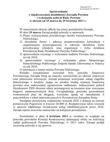 Załącznik Nr 3 do protokołu Nr VII/2011 Sprawozdanie z międzysesyjnej działalności Zarządu Powiatu i wykonania uchwał Rady Powiatu w okresie od 25 marca do 29 kwietnia 2011 r. W omawianym okresie odbyły się cztery posiedzenia Zarządu. W dniu 29 marca Zarząd podjął uchwały w sprawach: 1) Planu wykorzystania powiatowego zasobu nieruchomości Powiatu Nidzickiego, 2) określenia formy i zakresu przeprowadzania konsultacji z organizacjami pozarządowymi w zakresie określenia trybu powoływania członków oraz organizacji i trybu działania Powiatowej Rady Działalności Pożytku Publicznego, 3) sprawozdania rocznego z wykonania budżetu Powiatu Nidzickiego za rok 2010, 4) sprawozdania rocznego z wykonania planu finansowego Samodzielnego Publicznego Zespołu Opieki Zdrowotnej w Nidzicy za rok 2010, 5) informacji o stanie mienia Powiatu Nidzickiego. Ponadto przedmiotem rozważań były potrzeby finansowe Powiatowego Zarządu Dróg na remonty nawierzchni po okresie zimowym oraz planowane inwestycje. Zarząd proponuje wstrzymać zakup ciągnika planowanego z kredytu, mając na uwadze trudną sytuację finansową powiatu oraz maksymalne ograniczenie zadłużenia. Jednocześnie polecił Dyrektorowi PZD złożenie oferty przetargowej na koszenie traw szerszemu kręgowi zainteresowanych firm. Uwzględniając potrzebę prowadzenia wzmożonych prac na drogach, wyrażono zgodę na zatrudnienie 6 pracowników z robót interwencyjnych w Powiatowym Zarządzie Dróg. Następnie pozytywnie rozpatrzono wniosek ZOZ o dotację na remont pomieszczeń Pogotowia w kwocie 28.000 zł. Rozpatrywano także wniosek w sprawie odpłatnego świadczenia usług rehabilitacyjnych przez ZOZ. Zarząd zajmie stosowne stanowisko na kolejnym posiedzeniu. Posiedzenie w dniu 4 kwietnia 2011 r. zwołano ze względu na potrzebę powołania Komisji Konkursowej opiniującej oferty na realizację zadań publicznych Powiatu Nidzickiego w 2011 roku. Zarząd podjął stosowną uchwałę w tej sprawie. Kolejne posiedzenie odbyło się 7 kwietnia 2011 r. Rozważano ponownie temat odpłatnego świadczenia usług rehabilitacyjnych przez nidzicki ZOZ. Zarząd stwierdził, że samorząd powiatowy nie ma delegacji ustawowych do podejmowania decyzji w tej sprawie. Ponadto Zarząd wnioskował do Dyrektor ZOZ o obniżenie kosztów dzierżawy dla powiatowych jednostek funkcjonujących w budynku Przychodni Obwodowej. W dalszej części obrad omówiono wniosek Nidzickiego Ośrodka Kultury o dofinansowanie działalności. Proponowano dyrektorowi NOK, aby złożył wniosek o dofinansowanie konkretnej imprezy, a Zarząd rozpatrzy go na następnym posiedzeniu. Zarząd zapoznał się z protokołami z przeglądów inwestycji drogowych zrealizowanych w ostatnich latach, przeprowadzonych w obecności wykonawców. Zawarte w nich usterki naprawione zostaną w ramach gwarancji. Powrócono także do skargi p. ……………………… na Starostę Nidzickiego. Po zapoznaniu się z ustaleniami Komisji Bezpieczeństwa i Porządku Powiatu Nidzickiego oraz w związku z faktem, iż p. ……………. skargi nie wycofał, Zarząd skierował skargę do rozpatrzenia przez Radę Powiatu. W materiałach sesyjnych przesłany został stosowny projekt uchwały Rady Powiatu. Na zakończenie posiedzenia rozpatrzono wnioski finansowe o zmiany w budżecie, które uwzględnione zostały w projekcie uchwały Rady Powiatu na dzisiejszą sesję. Ostatnie posiedzenie Zarządu odbyło się w dniu 19 kwietnia 2011 r. Przede wszystkim poświęcone było tematyce sesyjnej. Omówiono na nim projekty uchwał Rady Powiatu. Ponadto Zarząd rozpatrzył pismo p. …………………………. zawierające prośbę o pomoc. Zarząd po konsultacjach z Wójtem Gminy Janowo i Dyrektorem Zespołu Szkół Rolniczych i Ogólnokształcących stwierdził, iż rodzina Państwa ……………………… nieprawnie zamieszkuje w nieruchomości należącej do ZSRiO. Ustalono, że po uregulowaniu zadłużenia za energię elektryczną, do lokalu zostanie podłączony nowy licznik na kartę. Zarząd uważa, że należy pomagać mieszkańcom, ale trzeba podjąć wszelkie formalne kroki, aby zwolnić zajmowany lokal. Następnie Zarząd negatywnie rozpatrzył wniosek Wójta Gminy Janowo o dotację na wydatki ponoszone w związku z gminnym składowiskiem odpadów. Zgodnie z ustawowymi zapisami gmina odpowiada za utrzymanie czystości i eksploatację własnych składowisk odpadów komunalnych. W dalszej kolejności Zarząd wyraził zgodę na przystąpienie do projektu partnerskiego w ramach polsko-szwajcarskiego programu blokowego, w ramach którego realizowane będą spotkania i wizyty studyjne celem tworzenia partnerstw i wzmacniania współpracy. Można również stworzyć produkt turystyczny, regionalny i podnieść atrakcyjność powiatu. Finansowanie projektu to bezzwrotna pomoc szwajcarska, przy 2% udziale organizacji pozarządowej (Nida). Powiat wystąpi w nim w roli partnera. Następnie Zarząd wyraził zgodę na przetransportowanie 3800 ton na trasie Napiwoda – Natać Mała dla firmy ………………………………. W dalszej kolejności dyrektor PZD zapoznał Zarząd z pismem PKP informującym o planowanych z funduszy kolei remontach przejazdów kolejowych w Nidzicy w ciągu ul. Olsztyńskiej w 2011 r. i ul. Działdowskiej w 2012 r. Zarząd podjął również uchwałę w sprawie wyboru ofert złożonych w ramach otwartego konkursu ofert na wsparcie realizacji zadań publicznych w 2011 roku, jak również rozpatrzył kolejne wnioski finansowe o zmiany w budżecie, które zawarte zostały w projekcie uchwały Rady Powiatu przygotowanym na dzisiejszą sesję.