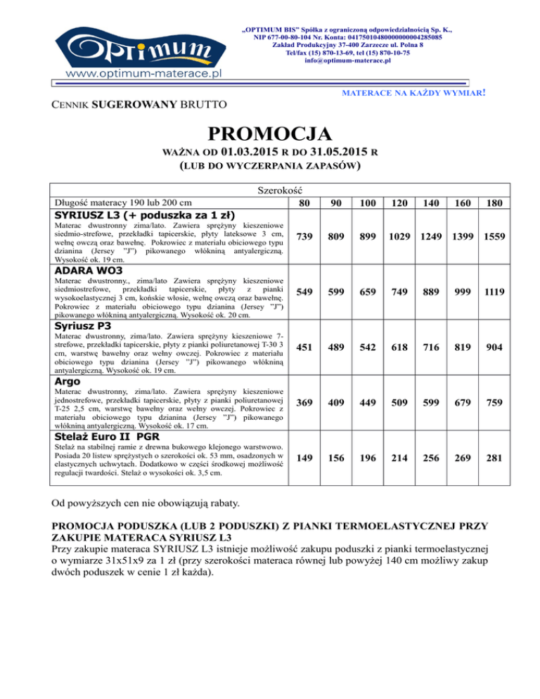 „OPTIMUM BIS” Spółka z ograniczoną odpowiedzialnością Sp. K., NIP 677-00-80-104 Nr. Konta: 04175010480000000004285085 Zakład Produkcyjny 37-400 Zarzecze ul. Polna 8 Tel/fax (15) 870-13-69, tel (15) 870-10-75 [email protected] MATERACE NA KAŻDY WYMIAR! CENNIK SUGEROWANY BRUTTO PROMOCJA WAŻNA OD 01.03.2015 R DO 31.05.2015 R (LUB DO WYCZERPANIA ZAPASÓW) Długość materacy 190 lub 200 cm Szerokość 80 90 100 120 140 160 180 739 809 899 1029 1249 1399 1559 549 599 659 749 889 999 1119 451 489 542 618 716 819 904 369 409 449 509 599 679 759 149 156 196 214 256 269 281 SYRIUSZ L3 (+ poduszka za 1 zł) Materac dwustronny zima/lato. Zawiera sprężyny kieszeniowe siedmio-strefowe, przekładki tapicerskie, płyty lateksowe 3 cm, wełnę owczą oraz bawełnę. Pokrowiec z materiału obiciowego typu dzianina (Jersey ”J”) pikowanego włókniną antyalergiczną. Wysokość ok. 19 cm. ADARA WO3 Materac dwustronny., zima/lato Zawiera sprężyny kieszeniowe siedmiostrefowe, przekładki tapicerskie, płyty z pianki wysokoelastycznej 3 cm, końskie włosie, wełnę owczą oraz bawełnę. Pokrowiec z materiału obiciowego typu dzianina (Jersey ”J”) pikowanego włókniną antyalergiczną. Wysokość ok. 20 cm. Syriusz P3 Materac dwustronny, zima/lato. Zawiera sprężyny kieszeniowe 7strefowe, przekładki tapicerskie, płyty z pianki poliuretanowej T-30 3 cm, warstwę bawełny oraz wełny owczej. Pokrowiec z materiału obiciowego typu dzianina (Jersey ”J”) pikowanego włókniną antyalergiczną. Wysokość ok. 19 cm. Argo Materac dwustronny, zima/lato. Zawiera sprężyny kieszeniowe jednostrefowe, przekładki tapicerskie, płyty z pianki poliuretanowej T-25 2,5 cm, warstwę bawełny oraz wełny owczej. Pokrowiec z materiału obiciowego typu dzianina (Jersey ”J”) pikowanego włókniną antyalergiczną. Wysokość ok. 17 cm. Stelaż Euro II PGR Stelaż na stabilnej ramie z drewna bukowego klejonego warstwowo. Posiada 20 listew sprężystych o szerokości ok. 53 mm, osadzonych w elastycznych uchwytach. Dodatkowo w części środkowej możliwość regulacji twardości. Stelaż o wysokości ok. 3,5 cm. Od powyższych cen nie obowiązują rabaty. PROMOCJA PODUSZKA (LUB 2 PODUSZKI) Z PIANKI TERMOELASTYCZNEJ PRZY ZAKUPIE MATERACA SYRIUSZ L3 Przy zakupie materaca SYRIUSZ L3 istnieje możliwość zakupu poduszki z pianki termoelastycznej o wymiarze 31x51x9 za 1 zł (przy szerokości materaca równej lub powyżej 140 cm możliwy zakup dwóch poduszek w cenie 1 zł każda).