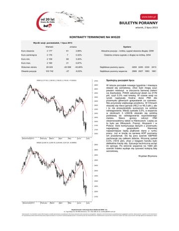 BIULETYN PORANNY wtorek, 2 lipca 2013 KONTRAKTY TERMINOWE NA WIG20 Wyniki sesji: poniedziałek, 1 lipca 2013 Wartość zmiana System: Kurs otwarcia 2 177 61 2,88% Aktualna pozycja – krótka, sygnał otwarcia długiej- 2299 Kurs zamknięcia 2 176 7 0,32% Ostatnia zmiana sygnału z długiej na krótką- 2454 Kurs min. 2 159 69 3,30% Kurs max. 2 190 21 0,97% Wolumen obrotu 29 425 -22 058 -42,85% Otwarte pozycje 103 742 -27 -0,03% Najbliższe poziomy oporu: 2200 2245 2334 2413 Najbliższe poziomy wsparcia: 2066 2027 1993 1861 FW20 (2,177.00, 2,190.00, 2,159.00, 2,176.00, +7.00000) Spokojny początek lipca 2700 2650 2600 2550 2500 2450 2400 2350 2300 2250 2200 2150 2100 2050 December 2013 February March April May June July WIG20 (2,246.74, 2,258.19, 2,230.86, 2,237.25, -8.38989) 2650 2600 W istocie początek nowego tygodnia i miesiąca okazał się wzrostowy, choć byki mogą czuć pewien niedosyt w otoczeniu barwnej zieleni na Zachodzie. FW20 zakończył dzień na 2176 pkt, czyli 0,3% nad kreską. W czasie sesji na rynek napływały finalne dane PMI dla przemysłu głównych gospodarek za czerwiec. Nie przyniosły większego przełomu. W Chinach okazały się nieco gorsze (48,2 vs 48,3 pkt.), ale i to nie przeszkodziło surowcom na solidne odreagowanie. Miedź zyskała 3,5%, a wsparcie w okolicach 3 USD/lb okazało się solidną podstawą do odreagowania wyprzedanego metalu. Nieco gorszy odczyt PMI obserwowaliśmy także w Niemczech. Lepiej za to było we Włoszech, Francji, Hiszpanii i w Polsce. Dziś kontynuacja danych z przemysłu największej gospodarki. Niemniej najważniejsze będą piątkowe dane z rynku pracy. Już w środę za sprawą ADP poznamy ich przedsmak. Do tej pory szeroki S&P500 zachowuje się całkiem dobrze. Wczoraj zyskał 0,5% (1615 pkt), choć z biegiem handlu byki delikatnie traciły siły. Sytuacja techniczna wciąż im sprzyja. Po obronie wsparcia na 1560 pkt szeroki indeks wydaje się rysować kolejną falę wzrostową. 2550 Krystian Brymora 2500 2450 2400 2350 2300 2250 2200 2150 December 2013 February March April May June July Wydział Analiz i Informacji Dom Maklerski BDM S.A. ul. 3‐go Maja 23, 40‐096 Katowice, Tel.: 032 208 14 12, [email protected] Opracowanie ma charakter czysto informacyjny i zostało opracowany na podstawie informacji uznanych przez autorów za wiarygodne . Zawarte w nim komentarze są subiektywnymi poglądami autorów. Opracowanie i zawarte w nim komentarze nie są podstawą żadnej rekomendacji kupna bądź sprzedaży w rozumieniu obowiązującego prawa i nie powinny być tak interpretowane. Publikowanie w prasie lub w Internecie całości lub części opracowania wymaga zgody sporządzających raport. BIULETYN PORANNY wtorek, 2 lipca 2013 RYNEK AKCJI Wyniki sesji: poniedziałek, 1 lipca 2013 52 tygodnie Indeks Kurs otwarcia Kurs zamknięcia Zmiana [%] Kurs min. Kurs max. Zakres wahań Wartość obrotów [mln PLN] Kurs max. Kurs min. WIG20 2 634,2 2 089,1 2 246,74 2 237,25 -0,37% 2 230,86 2 258,19 27,3 552 sWIG80 12 049,4 9 149,7 11 674,27 11 756,83 0,34% 11 639,30 11 756,83 117,5 29 mWIG40 2 991,6 2 204,6 2 779,25 2 809,58 1,18% 2 775,86 2 812,56 36,7 97 WIG PL 49 248,4 38 688,9 45 305,88 45 461,06 0,04% 45 305,88 45 613,40 307,5 WIG 48 572,8 38 810,2 44 759,97 44 769,00 0,05% 44 577,75 44 991,35 413,6 Spółka Cena [PLN] Mkt Cap [mln PLN] 42,17 BANK HANDLOWY BOGDANKA BRE BZ WBK zmiana % 682 zmiana % względem WIG20 dzienna 1M 3M 6M dzienna 1M 3M 6M 3 500 -1,0% -0,8% -1,5% -8,7% -0,6% 9,2% 4,4% 6,1% 92,20 12 047 -0,9% -7,2% -2,4% -7,9% -0,5% 2,8% 3,4% 6,9% 102,00 3 469 1,0% -20,8% -15,6% -26,0% 1,4% -10,8% -9,8% -11,2% 380,00 16 014 -0,8% -3,5% 8,3% 15,5% -0,4% 6,4% 14,1% 30,3% 279,30 26 127 -0,3% -4,3% 10,2% 15,9% 0,1% 5,6% 16,0% 30,7% EUROCASH 58,00 8 021 -1,2% -11,6% 9,5% 31,2% -0,8% -1,7% 15,4% 46,0% GTC 8,13 2 597 -0,9% -4,4% 4,2% -17,0% -0,5% 5,6% 10,1% -2,2% JSW 66,00 7 749 2,9% -17,7% -28,3% -30,2% 3,3% -7,7% -22,4% -15,4% ASSECOPOL KERNEL 47,88 3 815 -0,3% -16,6% -20,5% -29,5% 0,1% -6,6% -14,7% -14,7% KGHM 125,80 25 160 4,0% -15,2% -19,9% -34,9% 4,3% -5,2% -14,1% -20,0% LOTOS 36,75 4 773 2,4% -14,5% -11,3% -13,2% 2,7% -4,5% -5,5% 1,6% PEKAO 146,15 38 360 -2,6% -12,1% -7,6% -13,8% -2,2% -2,1% -1,8% 1,0% PGE 15,23 28 476 -1,1% -15,9% -7,0% -19,4% -0,7% -5,9% -1,1% -4,6% PGNIG 5,86 34 574 1,0% -5,0% 6,5% 11,4% 1,4% 5,0% 12,4% 26,2% PKNORLEN 47,69 20 397 2,3% -10,0% -7,0% -8,3% 2,7% 0,0% -1,2% 6,5% PKOBP 34,64 43 300 -2,7% -0,5% 0,0% -7,3% -2,3% 9,5% 5,8% 7,6% PZU 405,30 34 999 -1,1% -11,9% -0,1% -7,9% -0,7% -1,9% 5,7% 6,9% SYNTHOS 4,56 6 034 0,0% -15,1% -27,4% -16,3% 0,4% -5,1% -21,6% -1,5% TAURON 4,33 7 589 0,5% -0,2% -0,9% -10,0% 0,8% 9,8% 4,9% 4,8% TPSA 7,53 10 057 -1,6% -7,5% 12,4% -38,1% -1,2% 2,5% 18,2% -23,3% Komentarz po sesji Komentarz przed sesją: KGHM pomaga WIG20 Utrzymać 2200 pkt. Dzisiejsza sesja przyniosła uspokojenie nastrojów na rozhuśtanym warszawskim parkiecie. Po szalonych ostatnich trzech sesjach dziś zarówno zmienność, jak i obroty były dużo niższe dając wytchnienie inwestorom. Mimo sporego wzrostu w piątek nie było widać dziś chętnych do mocniejszej realizacji zysków i w mojej ocenie głównym źródłem podaży były ponownie przede wszystkim koszykowe zlecenia sprzedaży, które od kilku dni starają się zepchnąć indeks niżej. Choć przez cały dzień WIG20 dzielnie walczył o lekkie wzrosty, podaż wykorzystała do ataku końcowy fixing, na którym ucierpiały akcje PKO oraz Pekao i przez który ostatecznie indeks stracił na wartości 0,37%. Absolutną gwiazdą sesji w gronie blue chips był KGHM. Po piątkowym mocnym wzroście na rynku srebra dziś techniczny opór złamała miedź, i dzięki wzroście surowca o 3% na rynku towarowym nasz koncern odnotował dziś 3,9% zwyżkę przy najwyższym na rynku obrocie. Jednocześnie na wykresie KGHM przełamany został najbliższy techniczny poziom oporu i moim zdaniem mamy szansę na kontynuację pozytywnego trendu zarówno na rynku 