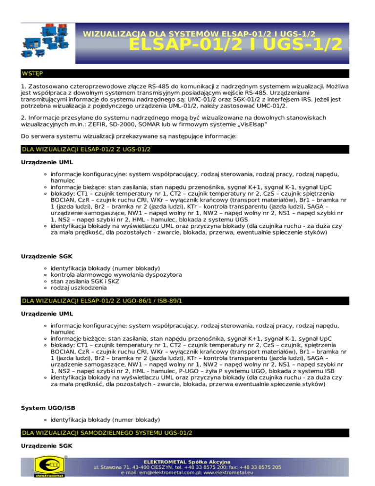 WIZUALIZACJA DLA SYSTEMÓW ELSAP-01/2 I UGS-1/2 ELSAP-01/2 I UGS-1/2 WSTĘP 1. Zastosowano czteroprzewodowe złącze RS-485 do komunikacji z nadrzędnym systemem wizualizacji. Możliwa jest współpraca z dowolnym systemem transmisyjnym posiadającym wejście RS-485. Urządzeniami transmitującymi informacje do systemu nadrzędnego są: UMC-01/2 oraz SGK-01/2 z interfejsem IRS. Jeżeli jest potrzebna wizualizacja z pojedynczego urządzenia UML-01/2, należy zastosować UMC-01/2. 2. Informacje przesyłane do systemu nadrzędnego mogą być wizualizowane na dowolnych stanowiskach wizualizacyjnych m.in.: ZEFIR, SD-2000, SOMAR lub w firmowym systemie „VisElsap” Do serwera systemu wizualizacji przekazywane są następujące informacje: DLA WIZUALIZACJI ELSAP-01/2 Z UGS-01/2 Urządzenie UML informacje konfiguracyjne: system współpracujący, rodzaj sterowania, rodzaj pracy, rodzaj napędu, hamulec informacje bieżące: stan zasilania, stan napędu przenośnika, sygnał K+1, sygnał K-1, sygnał UpC blokady: CT1 – czujnik temperatury nr 1, CT2 – czujnik temperatury nr 2, CzS – czujnik spiętrzenia BOCIAN, CzR – czujnik ruchu CRI, WKr – wyłącznik krańcowy (transport materiałów), Br1 – bramka nr 1 (jazda ludzi), Br2 – bramka nr 2 (jazda ludzi), KTr – kontrola transparentu (jazda ludzi), SAGA – urządzenie samogaszące, NW1 – napęd wolny nr 1, NW2 – napęd wolny nr 2, NS1 – napęd szybki nr 1, NS2 – napęd szybki nr 2, HML - hamulec, blokada z systemu UGS identyfikacja blokady na wyświetlaczu UML oraz przyczyna blokady (dla czujnika ruchu - za duża czy za mała prędkość, dla pozostałych - zwarcie, blokada, przerwa, ewentualnie spieczenie styków) Urządzenie SGK identyfikacja blokady (numer blokady) kontrola alarmowego wywołania dyspozytora stan zasilania SGK i SKZ rodzaj uszkodzenia DLA WIZUALIZACJI ELSAP-01/2 Z UGO-86/1 / ISB-89/1 Urządzenie UML informacje konfiguracyjne: system współpracujący, rodzaj sterowania, rodzaj pracy, rodzaj napędu, hamulec informacje bieżące: stan zasilania, stan napędu przenośnika, sygnał K+1, sygnał K-1, sygnał UpC blokady: CT1 – czujnik temperatury nr 1, CT2 – czujnik temperatury nr 2, CzS – czujnik, spiętrzenia BOCIAN, CzR – czujnik ruchu CRI, WKr – wyłącznik krańcowy (transport materiałów), Br1 – bramka nr 1 (jazda ludzi), Br2 – bramka nr 2 (jazda ludzi), KTr – kontrola transparentu (jazda ludzi), SAGA – urządzenie samogaszące, NW1 – napęd wolny nr 1, NW2 – napęd wolny nr 2, NS1 – napęd szybki nr 1, NS2 – napęd szybki nr 2, HML - hamulec, P-UGO – żyła P systemu UGO, blokada z systemu ISB identyfikacja blokady na wyświetlaczu UML oraz przyczyna blokady (dla czujnika ruchu - za duża czy za mała prędkość, dla pozostałych - zwarcie, blokada, przerwa ewentualnie spieczenie styków) System UGO/ISB identyfikacja blokady (numer blokady) DLA WIZUALIZACJI SAMODZIELNEGO SYSTEMU UGS-01/2 Urządzenie SGK ELEKTROMETAL Spółka Akcyjna ul. Stawowa 71, 43-400 CIESZYN, tel. +48 33 8575 200; fax: +48 33 8575 205 e-mail: [email protected]; www.elektrometal.eu identyfikacja blokady (numer blokady) kontrola alarmowego wywołania dyspozytora stan zasilania SGK i SKZ rodzaj uszkodzenia 1 do 8 urządzeń (UML + SGK) dołączonych do magistrali ELSAPUMCUMLSGK (ITR)UMLSGK (ITR)Serwer systemu wizualizacjiModemModemSeparatorKoncentratorModemModemSeparatorStanowiska systemu wizual.UMCUMLUGO/ISBUMLUGO/ISB1 do 8 urządzeń (UML + UGO/ISB) dołączonych do magistrali ELSAPSGK(IRS)Dla samodzielnych systemów UGS-01/2 ELEKTROMETAL Spółka Akcyjna ul. Stawowa 71, 43-400 CIESZYN, tel. +48 33 8575 200; fax: +48 33 8575 205 e-mail: [email protected]; www.elektrometal.eu