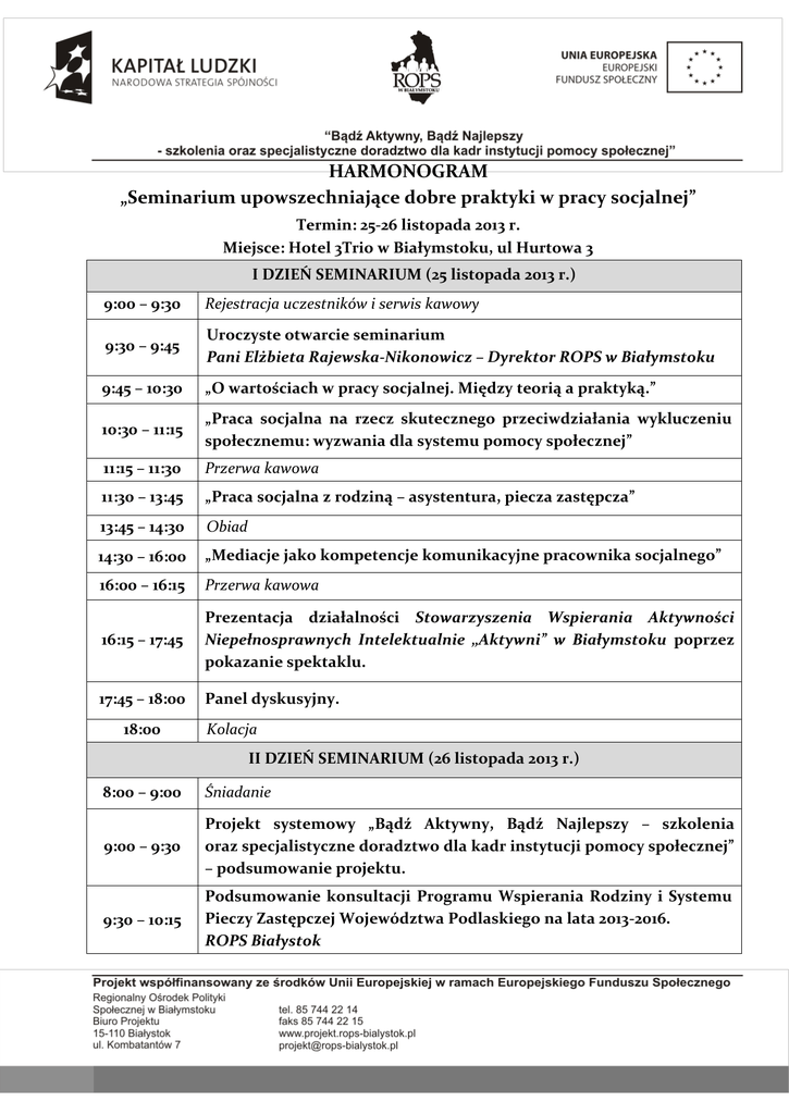 HARMONOGRAM „Seminarium upowszechniające dobre praktyki w pracy socjalnej” Termin: 25-26 listopada 2013 r. Miejsce: Hotel 3Trio w Białymstoku, ul Hurtowa 3 I DZIEŃ SEMINARIUM (25 listopada 2013 r.) 9:00 – 9:30 Rejestracja uczestników i serwis kawowy 9:30 – 9:45 Uroczyste otwarcie seminarium Pani Elżbieta Rajewska-Nikonowicz – Dyrektor ROPS w Białymstoku 9:45 – 10:30 „O wartościach w pracy socjalnej. Między teorią a praktyką.” 10:30 – 11:15 „Praca socjalna na rzecz skutecznego przeciwdziałania wykluczeniu społecznemu: wyzwania dla systemu pomocy społecznej” 11:15 – 11:30 Przerwa kawowa 11:30 – 13:45 „Praca socjalna z rodziną – asystentura, piecza zastępcza” 13:45 – 14:30 Obiad 14:30 – 16:00 „Mediacje jako kompetencje komunikacyjne pracownika socjalnego” 16:00 – 16:15 Przerwa kawowa 16:15 – 17:45 Prezentacja działalności Stowarzyszenia Wspierania Aktywności Niepełnosprawnych Intelektualnie „Aktywni” w Białymstoku poprzez pokazanie spektaklu. 17:45 – 18:00 Panel dyskusyjny. 18:00 Kolacja II DZIEŃ SEMINARIUM (26 listopada 2013 r.) 8:00 – 9:00 Śniadanie 9:00 – 9:30 Projekt systemowy „Bądź Aktywny, Bądź Najlepszy – szkolenia oraz specjalistyczne doradztwo dla kadr instytucji pomocy społecznej” – podsumowanie projektu. 9:30 – 10:15 Podsumowanie konsultacji Programu Wspierania Rodziny i Systemu Pieczy Zastępczej Województwa Podlaskiego na lata 2013-2016. ROPS Białystok 10:15 – 11:45 Konferencja Grupy Rodzinnej. Innowacyjne Metody Pracy z Rodziną. Pan Jarosław Przeperski – Prezes Fundacji Nadzieja Dla Rodzin 11:45 - 12:00 Przerwa kawowa 12:00 – 12:45 Wystąpienie Wojewody Podlaskiego i wręczenie Pracownikom Socjalnym „Odznaczeń państwowych nadanych przez Prezydenta RP" 12:45 – 13:30 Wręczenie wyróżnień Pracownikom Socjalnym z województwa podlaskiego przez Regionalny Ośrodek Polityki Społecznej w Białymstoku za wieloletnią pracę w pomocy społecznej. 13:30 – 14:15 Prezentacja Dobrych Praktyk w pracy socjalnej na przykładzie doświadczeń zawodowych wyróżnionych Pracowników Socjalnych. 14:15 – 14:45 Film upowszechniający pracę socjalną: „Najważniejszy jest człowiek” 14:45 – 15:00 Panel dyskusyjny i zakończenie spotkania. 15:00 Obiad W trakcie seminarium harmonogram może ulec zmianie!
