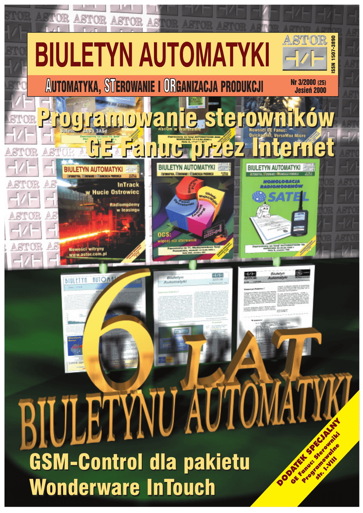 D A G O D GSM-Control dla pakietu Wonderware InTouch E T F E Pr an K og uc S P : st ram St EC e r. I- ow row JA VI a L II ln nik N e Y i Programowanie sterowników GE Fanuc przez Internet 3 Biuletyn Automatyki ASTOR 3/2000 (25) Szanowni Państwo! Spis treści: Z wielką przyjemnością oddajemy w Państwa ręce dwudziesty piąty już numer Biuletynu Automatyki, który otwiera siódmy rok wydawania pisma. Pierwszy numer naszego kwartalnika, czarno-biały i ośmiostronicowy, ukazał się jesienią 1994 roku w nakładzie 250 egzemplarzy. Ten krótki z pozoru okres – sześć lat – stanowi w dziejach Biuletynu całą epokę. Pismo nie tylko trzykrotnie zwiększyło objętość, otrzymało profesjonalną szatę graficzną i praktycznie z numeru na numer zwiększa nakład (obecnie 8500 egzemplarzy!), ale przede wszystkim zyskało całą rzeszę stałych Czytelników i stało się szeroko znane i popularne w branży automatyki przemysłowej. Wielu spośród Państwa mieliśmy także zaszczyt i przyjemność gościć na naszych łamach jako Autorów, przedstawiając zaprojektowane i zrealizowane przez Państwa instalacje automatyki – do chwili obecnej zaprezentowaliśmy w Biuletynie już blisko 90 instalacji, działających w najróżniejszych gałęziach przemysłu – od przemysłu spożywczego po ciężki. W niniejszym numerze zamieszczamy m.in. artykuł na temat systemu zarządzania budynkiem opartego na oprogramowaniu Wonderware InTouch (str. 6); zachęcamy także do zapoznania się z metodami zdalnego alarmowania i powiadamiania operatorów systemów SCADA o przebiegu procesów technologicznych (str. 9). W numerze znajdą Państwo także jak zwykle dodatek – raport, tym razem poświęcony mniej znanym cechom i możliwościom sterowników GE Fanuc i oprogramowania narzędziowego VersaPro. NOWOŚCI GE FANUC: Sterowniki GE Fanuc w sieci Ethernet . . . str. 4 Nowy panel operatorski z serii TIU . . . . . .str. 4 INSTALACJE AUTOMATYKI W POLSCE: Quickpanel w oczyszczalni ścieków w Wolbromiu . . . . . . . . . . . . . . . . . . . . . . str. 5 InTouch 7.1 w Porcie Lotniczym Wrocław S.A. . . . . . . . . . . . . . . . . . . . . . .str. 6 InTouch w dydaktycznym modelu systemu monitoringu . . . . . . . . . . . . . . . . . . . . . . .str. 8 TO WARTO WIEDZIEĆ: GSM−Control i SCADAlarm . . . . . . . . . . . str. 9 InTouch: Technologia ActiveX . . . . . . . . .str. 12 PYTANIA I ODPOWIEDZI: InTouch: Logowanie historyczne . . . . . . str. 11 INSTALACJE AUTOMATYKI NA ŚWIECIE: Rurociąg SantaFe Pacific . . . . . . . . . . . str. 13 Wodociągi w Mansfield . . . . . . . . . . . . . .str. 13 Ludzie Astora (25) . . . . . . . . . . . . . . . . . . str. 15 RAPORT SPECJALNY: GE FANUC: Sterowniki Programowalne . .str. I−VIII Zapraszamy zatem do lektury! Justyna Ryś (ASTOR Kraków) ASTOR Sp. z o.o. Partnerzy handlowi: Autoryzowany dystrybutor GE Fanuc, Wonderware i Satel l Białystok: Promar PHUP, ul. Wołyńska 36, 15-206 Białystok, tel. (085) 743 31 69, tel./fax (085) 743 31 51 l Bielsko-Biała: Optimus-Seko, ul. Jutrzenki 20 43-300 Bielsko-Biała, tel. (033) 814 01 01, fax (033) 814 00 71 l Gdańsk: Vircon s.c., ul. Polanki 12 80-308 Gdańsk, tel./fax (058) 552 14 90 l Katowice: Abikom, ul. Rolna 43, 40-555 Katowice tel./fax (032) 201 18 66, 201 18 67 l Kraków: Abis s.c., ul. Smoleńsk 29, 31-112 Kraków tel./fax (012) 429 55 08 l Stargard Szczeciński: Infel, ul. I Brygady 35 p. 308 73-110 Stargard Szczeciński, tel. (091) 577 69 95 l Toruń: Anko-System, ul. Młodzieżowa 31, 87-100 Toruń tel. (056) 654 95 52 do 59, fax (056) 622 63 44 l Wrocław: Microtech International Ltd. sp. z o.o., ul. Parkowa 57 51-616 Wrocław, tel./fax (071) 372 80 19, 372 80 48, 348 36 66 l Zamość: Atex sp. z o.o., ul. Hrubieszowska 173, 22-400 Zamość tel. (084) 638 64 41 do 43, fax (084) 638 67 82 ul. Smoleńsk 29, 31-112 Kraków tel. (012) 429 55 31, fax (012) 429 55 81 http://www.astor.com.pl serwis GE Fanuc: [email protected] serwis Wonderware: [email protected] serwis Satel: [email protected] Oddział Gdańsk: ul. Polanki 12, 80-308 Gdańsk tel./fax (058) 552 23 14, tel. (058) 552 25 42 e-mail: [email protected] Oddział Poznań: ul. Romana Maya 1, 61-372 Poznań tel. (061) 650 29 87, tel./fax (061) 650 29 88 e-mail: [email protected] Oddział Warszawa: ul. Arkuszowa 135, 01-934 Warszawa tel. (022) 817 91 70, fax (022) 817 92 89 e-mail: [email protected] 4 Nowości GE Fanuc Sterowniki GE Fanuc w sieci Ethernet Z końcem sierpnia 2000 roku firma GE Fanuc wprowadziła na rynek nowy produkt o numerze katalogowym IC200SET001 – konwerter VersaMax SE (ang. Serial to Ethernet), umożliwiający włączenie urządzenia wyposażonego w port szeregowy RS-232 lub RS-485 do sieci Ethernet. Konwerter obsługuje następujące protokoły: n po stronie portu szeregowego: Modbus RTU, SNP i ASCII Serial, n po stronie sieci Ethernet: Modbus TCP/IP i SRTP n EGD* (w przyszłości), dzięki czemu możliwa jest komunikacja za pośrednictwem sieci Ethernet pomiędzy: n sterownikami GE Fanuc, n sterownikami GE Fanuc a oprogramowaniem narzędziowym VersaPro (czyli programowanie i konfigurowanie sterowników poprzez sieć), n sterownikami GE Fanuc a oprogramowaniem wizualizacyjnym, np. Wonderware InTouch. VersaMax SE wyposażony jest w interfejs sieci Ethernet 10Base-T (skrętka) oraz dwa porty szeregowe: RS-232 (ze złączem RJ45 lub śrubowym) i RS–485 (ze złączem śrubowym) do podłączania innych urządzeń. Port RS-485 umożliwia podłączenie jednego lub wielu urządzeń w ramach jednej sieci (maksymalnie 32; nie obejmuje protokołu SNP). Rodzaj wykorzystywanego portu szeregowego wybierany jest za pomocą przełącznika na płycie czołowej konwertera. W przedniej części modułu znajduje się również przycisk do restartu urządzenia oraz zestaw diod sygnalizujących stan urządzenia. VersaMax Nano wraz z podłączonym Konwerter konwerterem RS232/485 na Ethernet zasilany jest prądem stałym o napięciu od 9 do 30 VDC. Urz