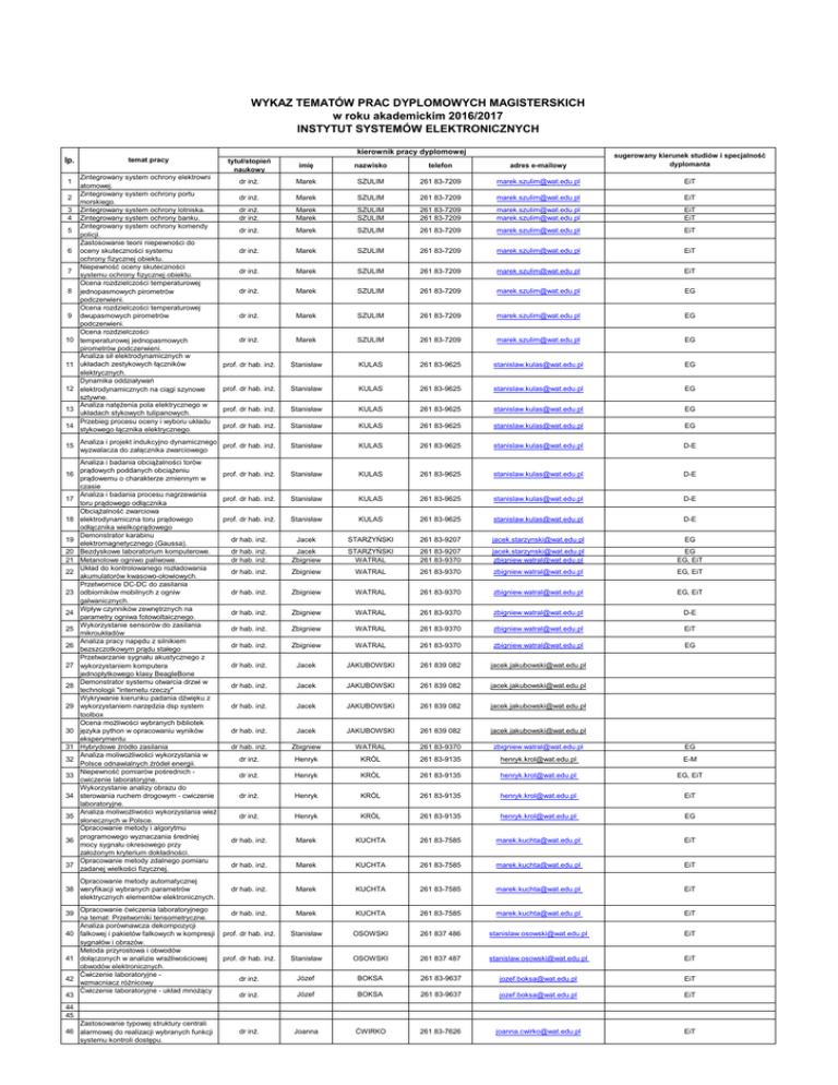 Wykaz tematów prac dyplomowych magisterskich w roku 2016/2017