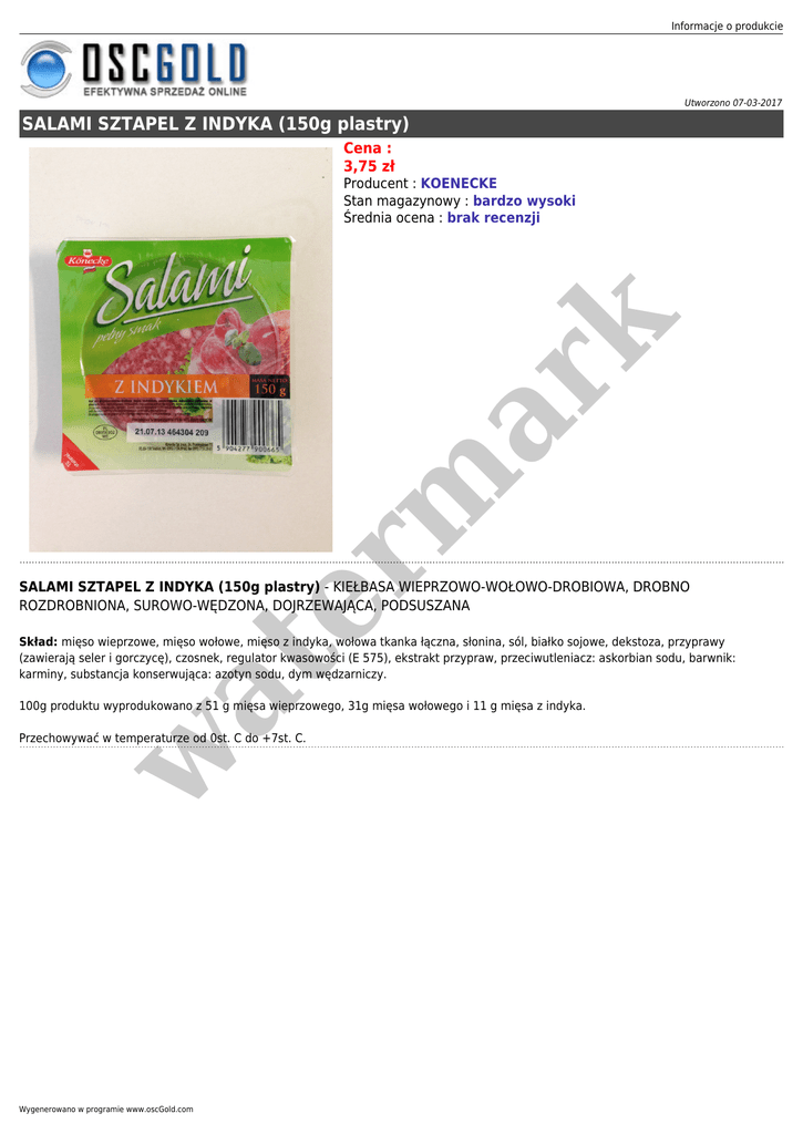 Informacje o produkcie Utworzono 07-03-2017 SALAMI SZTAPEL Z INDYKA (150g plastry) Cena : 3,75 zł er m ar k Producent : KOENECKE Stan magazynowy : bardzo wysoki Średnia ocena : brak recenzji SALAMI SZTAPEL Z INDYKA (150g plastry) - KIEŁBASA WIEPRZOWO-WOŁOWO-DROBIOWA, DROBNO ROZDROBNIONA, SUROWO-WĘDZONA, DOJRZEWAJĄCA, PODSUSZANA at Skład: mięso wieprzowe, mięso wołowe, mięso z indyka, wołowa tkanka łączna, słonina, sól, białko sojowe, dekstoza, przyprawy (zawierają seler i gorczycę), czosnek, regulator kwasowości (E 575), ekstrakt przypraw, przeciwutleniacz: askorbian sodu, barwnik: karminy, substancja konserwująca: azotyn sodu, dym wędzarniczy. 100g produktu wyprodukowano z 51 g mięsa wieprzowego, 31g mięsa wołowego i 11 g mięsa z indyka. w Przechowywać w temperaturze od 0st. C do +7st. C. Wygenerowano w programie www.oscGold.com