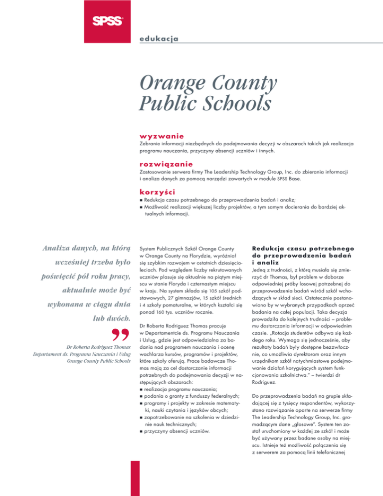 edukacja Orange County Public Schools w y z wanie Zebranie informacji niezbędnych do podejmowania decyzji w obszarach takich jak realizacja programu nauczania, przyczyny absencji uczniów i innych. r oz w i ązanie Zastosowanie serwera firmy The Leadership Technology Group, Inc. do zbierania informacji i analiza danych za pomocą narzędzi zawartych w module SPSS Base. ko r z yści Analiza danych, na którą wcześniej trzeba było poświęcić pół roku pracy, aktualnie może być „ wykonana w ciągu dnia Redukcja czasu potrzebnego do przeprowadzenia badań i analiz; Możliwość realizacji większej liczby projektów, a tym samym docierania do bardziej aktualnych informacji. System Publicznych Szkół Orange County w Orange County na Florydzie, wyróżniał się szybkim rozwojem w ostatnich dziesięcioleciach. Pod względem liczby rekrutowanych uczniów plasuje się aktualnie na piątym miejscu w stanie Floryda i czternastym miejscu w kraju. Na system składa się 105 szkół podstawowych, 27 gimnazjów, 15 szkół średnich i 4 szkoły pomaturalne, w których kształci się ponad 160 tys. uczniów rocznie. lub dwóch. Dr Roberta Rodriguez Thomas Departament ds. Programu Nauczania i Usług Orange County Public Schools Dr Roberta Rodriguez Thomas pracuje w Departamentcie ds. Programu Nauczania i Usług, gdzie jest odpowiedzialna za badania nad programem nauczania i ocenę wachlarza kursów, programów i projektów, które szkoły oferują. Prace badawcze Thomas mają za cel dostarczanie informacji potrzebnych do podejmowania decyzji w następujących obszarach: realizacja programu nauczania; podania o granty z funduszy federalnych; programy i projekty w zakresie matematyki, nauki czytania i języków obcych; zapotrzebowanie na szkolenia w dziedzinie nauk technicznych; przyczyny absencji uczniów. Re d u kc j a c z a s u p o t r z e b n e g o d o p r z e p r owa d z e n i a b a d a ń i analiz Jedną z trudności, z którą musiała się zmierzyć dr Thomas, był problem w doborze odpowiedniej próby losowej potrzebnej do przeprowadzenia badań wśród szkół wchodzących w skład sieci. Ostatecznie postanowiono by w wybranych przypadkach oprzeć badania na całej populacji. Taka decyzja prowadziła do kolejnych trudności – problemu dostarczania informacji w odpowiednim czasie. „Rotacja studentów odbywa się każdego roku. Wymaga się jednocześnie, aby rezultaty badań były dostępne bezzwłocznie, co umożliwia dyrektorom oraz innym urzędnikom szkół natychmiastowe podejmowanie działań korygujących system funkcjonowania szkolnictwa.” – twierdzi dr Rodriguez. Do przeprowadzenia badań na grupie składającej się z tysięcy respondentów, wykorzystano rozwiązanie oparte na serwerze firmy The Leadership Technology Group, Inc. gromadzącym dane „głosowe”. System ten został uruchomiony w każdej ze szkół i może być używany przez badane osoby na miejscu. Istnieje też możliwość połączenia się z serwerem za pomocą linii telefonicznej czynnej 24h na dobę, tak aby respondenci mogli dzwonić nawet z odległych miejsc. Dr Thomas zadbała, by system dopasowany był do harmonogramów respondentów, i zarówno studenci, kadra nauczycielska, jak i mieszkańcy miasteczka akademickiego mogli się wypowiedzieć w dogodnym dla nich czasie. Dane z serwera są następnie przekazywane do SPSS Base i wykorzystywane przez Thomas w celu wykrycia prawidłowości. Przy pomocy modułu SPSS Base może ona badać korelację, policzyć częstości, analizować regresje, a także utworzyć raport dla kierownictwa – wszystko w ciągu kilku dni. M o ż l i wo ś ć r e a l i z a c j i w i ę k sz e j l i c z by p r o j e k t ów, a t y m s a my m d o c i e r a n i a d o b a r d z i e j a k t u a l nyc h informacji SPSS Polska ul. Racławicka 58 30–017 Kraków tel./faks 012.636.96.80 tel./faks 012.636.07.91 tel./faks 012.636.45.35 e–mail: info @ spss.pl www.spss.pl www.analizadanych.pl www.webmining.pl Ponieważ poszczególne fazy analizy stały się znacznie łatwiejsze, dr Thomas może powtarzać badania, aby sprawdzić poprawność wyników wcześniejszych studiów i realizować rocznie większą liczbę projektów. Pozwala to na lepsze zrozumienie kadrze zarządzającej w Orange County Public Schools wielu czynników wpływających na rozbudowany i skomplikowany system szkół. Aby odświeżyć swoją wiedzę z zakresu możliwości wykorzystania rozwiązań SPSS dr Thomas uczęszczała w 2002 r. na dwie odrębne sesje szkoleniowe organizowane przez firmę SPSS i chce wziąć udziału w dodatkowych kursach w kolejnych latach. Była ona pod szczególnym wrażeniem umiejętności przekazywania wiedzy i kompetencji osób prowadzących szkolenia, zwłaszcza że sama pracuje jako pedagog. „Muszę się jeszcze wiele nauczyć o możliwościach oferowanych przez narzędzie SPSS Base, Kiedy bierze się udział w kursie po raz pierwszy, uczestnik stara się poznać i udoskonalić umiejętności posługiwania się zestawem tych funkcji, które pozwolą mu roz- wiązać konkretny problem. Dopiero później zdaje sobie sprawę, że może wykorzystywać produkt w znacznie szerszym kontekście.” – mówi. Dla dr Thomas szczególnie użyteczne okazało się wykorzystanie funkcji „wytnij” oraz „wklej” w języku poleceń SPSS Syntax, które umożliwia powtórne użycie tego samego polecenia, także w zmodyfikowanej formie. Dzięki niej zaoszczędziła wiele czasu w pracy nad swoimi ostatnimi projektami. Przydatne okazały się także inne umiejętności zdobyte podczas szkolenia, przede wszystkim scalanie plików oraz tworzenie interaktywnych wykresów.