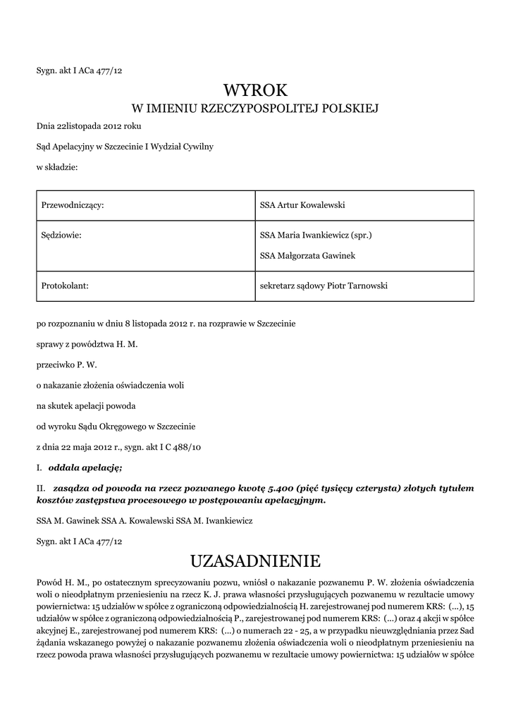 Sygn. akt I ACa 477/12 WYROK W IMIENIU RZECZYPOSPOLITEJ POLSKIEJ Dnia 22listopada 2012 roku Sąd Apelacyjny w Szczecinie I Wydział Cywilny w składzie: Przewodniczący: SSA Artur Kowalewski Sędziowie: SSA Maria Iwankiewicz (spr.) SSA Małgorzata Gawinek Protokolant: sekretarz sądowy Piotr Tarnowski po rozpoznaniu w dniu 8 listopada 2012 r. na rozprawie w Szczecinie sprawy z powództwa H. M. przeciwko P. W. o nakazanie złożenia oświadczenia woli na skutek apelacji powoda od wyroku Sądu Okręgowego w Szczecinie z dnia 22 maja 2012 r., sygn. akt I C 488/10 I. oddala apelację; II. zasądza od powoda na rzecz pozwanego kwotę 5.400 (pięć tysięcy czterysta) złotych tytułem kosztów zastępstwa procesowego w postępowaniu apelacyjnym. SSA M. Gawinek SSA A. Kowalewski SSA M. Iwankiewicz Sygn. akt I ACa 477/12 UZASADNIENIE Powód H. M., po ostatecznym sprecyzowaniu pozwu, wniósł o nakazanie pozwanemu P. W. złożenia oświadczenia woli o nieodpłatnym przeniesieniu na rzecz K. J. prawa własności przysługujących pozwanemu w rezultacie umowy powiernictwa: 15 udziałów w spółce z ograniczoną odpowiedzialnością H. zarejestrowanej pod numerem KRS: (...), 15 udziałów w spółce z ograniczoną odpowiedzialnością P., zarejestrowanej pod numerem KRS: (...) oraz 4 akcji w spółce akcyjnej E., zarejestrowanej pod numerem KRS: (...) o numerach 22 - 25, a w przypadku nieuwzględniania przez Sad żądania wskazanego powyżej o nakazanie pozwanemu złożenia oświadczenia woli o nieodpłatnym przeniesieniu na rzecz powoda prawa własności przysługujących pozwanemu w rezultacie umowy powiernictwa: 15 udziałów w spółce z ograniczoną odpowiedzialnością H., zarejestrowanej pod numerem KRS: (...), 15 udziałów w spółce z ograniczoną odpowiedzialnością P., zarejestrowanej pod numerem KRS: (...) oraz 4 akcji w spółce akcyjnej E., zarejestrowanej pod numerem KRS: (...) o numerach 22 -25. Powód wywodził swe roszczenia z zawartej z pozwanym w dniu 14 lutego 1997 r. ustnej umowy powiernictwa, która obejmowała w szczególności zarządzanie przez powiernika środkami przekazywanymi mu w ramach sprawowanej przez niego działalności powierniczej, jak również wykonywanie w granicach prawa wszystkich poleceń powierzającego majątek. Powód twierdził, że w dniu 14 listopada 2006 r. miał rozwiązać umowę powiernictwa ze skutkiem natychmiastowym z uwagi na notoryczne, rażące naruszenia postanowień przedmiotowej umowy powiernictwa przez pozwanego. Pozwany P. W. w odpowiedzi na pozew wniósł o oddalenie powództwa w całości jako bezzasadnego oraz o zasądzenie od powoda na jego rzecz kosztów postępowania. Pozwany zaprzeczył w całości twierdzeniom powoda w kwestii rzekomego zlecenia powierniczego, jakie miałoby go łączyć z powodem. Wyrokiem z dnia 22 maja 2012 r. Sąd Okręgowy w Szczecinie oddalił powództwo w całości oraz zasądził od powoda na rzecz pozwanego zwrot całości poniesionych kosztów postępowania, pozostawiając ich szczegółowe wyliczenie referendarzowi sądowemu. Sąd Okręgowy oparł przedmiotowy wyrok na następujących ustaleniach faktycznych: W dniu 12 czerwca 1997 r. powód H. M. oraz A. Z. i K. B. zawarli umowę, na podstawie której założyli „H. spółkę z ograniczoną odpowiedzialnością z siedzibą w O.. Wspólnikami tej spółki byli: P. W., U. i K. J.. Od powstania tej spółki - powód i pozwany byli członkami zarządu. W 1997 r. została również założona spółka akcyjna O. z siedzibą w O.. Obecnie w miejsce powyższej spółki funkcjonuje E. z siedzibą w O.. Od powstania E. S.A. z siedzibą w O. pozwany był prezesem jej jednoosobowego zarządu. W dniu 30 sierpnia 1999 r. pozwany P. W. zawiązał „P. spółkę z ograniczoną odpowiedzialnością z siedzibą w O.. Stosownie do § 6 aktu założycielski tej spółki 40 udziałów w kapitale zakładowym Spółki zostały objęte przez P. W. po 100 zł każdy. Wspólnikami tej spółki są P. W. i U.. Obecnie prezesem zarządu tej spółki jest powód H. M.. W dniu 20 września 1999 r. została zawarta umowa dzierżawy pomiędzy „H. spółką z ograniczoną z siedzibą w O., w imieniu którego działał Zarząd w osobach H. M., K. B. i pełnomocnik S. S. jako wydzierżawiający, a O. z siedzibą w O. reprezentowaną przez Prezesa Zarządu - P. W.. Zarząd „H. spółki z o.o. z siedzibą w O. pismem z dnia 5 października 1999 r. w osobach H. M., K. B. i P. W. jednomyślnie udzielili P. W. pełnomocnictwa do jednoosobowego reprezentowania Spółki w czynnościach cywilnoprawnych związanych z bieżącą działalności Spółki oraz do prowadzenia spraw Spółki. W dniu 23 października 2003 r. pozwany P. W. oświadczył, że reprezentowana przez niego E. spółka z ograniczoną odpowiedzialnością z siedzibą w O. obejmuje w spółce z ograniczoną odpowiedzialnością „H. z siedzibą w O. 108 udziałów o wartości nominalnej 50 zł każdy i łącznej wartości nominalnej 5.400 zł, utworzonych na mocy uchwały numer (...) Nadzwyczajnego Zgromadzenia Wspólników tej Spółki, powziętej dnia 23 października 2003r. Objęte udziały pokryte zostały wkładem pieniężnym. Następnie P. W. dokonywał zbycia kolejnych akcji i udziałów w ww. trzech spółkach. W dniu 10 grudnia 2004 r. Rada Nadzorcza „E. spółka akcyjna z siedzibą w O. w składzie S. S., R. K. i J. J. podjęła uchwałę, na podstawie której Prezes zarządu w osobie P. W. został wybrany na pięcioletnią kadencję, która miała upłynąć 9 grudnia 2009 r. W 2005 r. powstał konflikt pomiędzy P. W., a H. M. na tle sposobu prowadzenia spraw spółek, mających siedzibę w O.. Wyrokiem z dnia 19 lipca 2007 r., w sprawie o sygn. akt I ACa 436/07 Sąd Apelacyjny w Szczecinie zmienił wyrok Sądu Okręgowego w S. z dnia 19 marca 2007 r. w ten sposób, że oddalił powództwo K. J. przeciwko E. spółce akcyjnej w O. i P. W. o ustalenie nabycia w dniu 13 stycznia 2005 r. 11 akcji imie