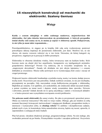 15 niezwykłych konstrukcji od mechaniki do elektroniki. Szalony Geniusz Wstęp Każdy z czasem odnajduje w sobie szalonego naukowca, majsterkowicza lub elektronika. Już jako dziecko interesowałem się przedmiotami, w których przypadku istniał choćby cień szansy na to, że można je zepsuć w efektowny sposób. Podejrzewam, że nie tylko ja mam takie wspomnienia… Prawdopodobieństwo, że sięgasz po tę książkę (lub całą serię wydawniczą), ponieważ potrzebujesz dalszej inspiracji do poznawania elektroniki, jest duże. Możliwe też, że nie chcesz, ale musisz wreszcie wdrożyć się w ten świat. Nieważne, do której kategorii się przypiszesz, sięgnięcie po tę pozycję to dobre posunięcie. Elektronika to obszerna dziedzina wiedzy, która towarzyszy nam na każdym kroku. Któż bowiem może się obejść dziś bez smartfonów, komputerów czy inteligentnych artykułów gospodarstwa domowego? Pewnie Cię zaskoczę, ale te wszystkie urządzenia nie są „magicznymi skrzynkami”. Zasada ich działania nie jest okryta tajemnicą i z czasem dokładnie je zrozumiesz. Musisz tylko poświęcić na to wystarczającą ilość czasu i zacząć od czegoś prostszego. Większość kursów elektroniki bombarduje czytelnika teorią, teorią i na koniec dodaje jeszcze trochę teorii. Oczywiście jest ona potrzebna. Jednak osobiście uważam, że nie jest niezbędna, przynajmniej na początku. Gdy zaczynałem swoją hobbystyczną przygodę z elektroniką, błądziłem po omacku. Coś spaliłem, coś uszkodziłem, ale ostatecznie układ zaczynał działać, a potem czytałem na temat teorii i dopiero wtedy rozumiałem dane zjawisko. Dziwnie i odwrotnie, prawda? Jednak dawało mi to sporą satysfakcję i radość z tworzonych układów ― w końcu przecież sam wymyślałem rozwiązania swoich problemów. Nie polecam nauki elektroniki dla samej wiedzy. Bo jaka to przyjemność sprawdzać prawo Ohma czy testować tranzystory? Dla mnie to wręcz nudne. Dlatego, gdy już miałem za sobą moment fascynacji świecącymi żaróweczkami i migającymi diodkami, poszperałem trochę w internecie i wymarzyłem sobie, że zbuduję robota! To ambitne i skomplikowane zadanie, jednak myśl o tym, że konstrukcja, którą samodzielnie stworzę, będzie się ruszać, sprawiła, iż zapomniałem o czekających mnie trudach. Plan był prosty: chciałem zbudować prostego, programowalnego robota. Na tyle małego, aby swobodnie poruszał się po biurku. Przemyślałem wszystko i zacząłem próbować. Oczywiście na początku była seria niepowodzeń, lecz z czasem wszystko zaczęło działać. Miałem motywację i cel. Najpierw określałem, co chcę zrobić, dopiero później poszukiwałem informacji i teoretycznych podstaw, przedtem robiłem jednak coś w praktyce ― gwarantuję, że tak też się da! Ostatecznie robot powstał, mniej lub bardziej udany, ale działający. Satysfakcja z efektów i motywacja do dalszego działania były ogromne. Chociaż od tamtego czasu minęło osiem lat, budową robotów zajmuję się do dziś ― i nadal czerpię z tego dużo radości. Moje konstrukcje oraz wiele innych znajdziesz na stronie internetowej www.forbot.pl, którą możesz potraktować jako źródło inspiracji. Niniejszą książkę polecam, ponieważ jest ona „odwróconym kursem elektroniki”. Nie nauczysz się z niej teorii, aby później (nie wiadomo gdzie) ją wykorzystać. Z pomocą tego poradnika zbudujesz wiele ciekawych urządzeń, przy okazji ucząc się elektroniki. To dużo ciekawsza droga! Początki mogą być trudne, jednak elektronika to fascynujące hobby. Znajdź dziedzinę, która zainteresuje Cię najbardziej. Może, tak jak w moim przypadku, będzie to budowa robotów? Wybierz projekt, który będzie Twoją motywacją, i czerp z jego realizacji radość i satysfakcję. Wkrótce zauważysz, że w mgnieniu oka nauczyłeś się wielu praktycznych sztuczek i zagadnień teoretycznych, a to wszystko bezboleśnie i w ciekawy sposób. Nie czytaj tej książki, bo to nie plotkarska gazeta, ale eksperymentuj! Próbuj, testuj, zniszcz coś i wyciągnij wnioski. Nie warto czytać kolejnych rozdziałów, jeśli nie masz zamiaru równolegle eksperymentować w praktyce. Własne zabawy z elektroniką nauczą Cię trzy razy więcej w dwa razy krótszym czasie! Zresztą po to uczysz się elektroniki, aby z niej korzystać, prawda? Damian Szymański