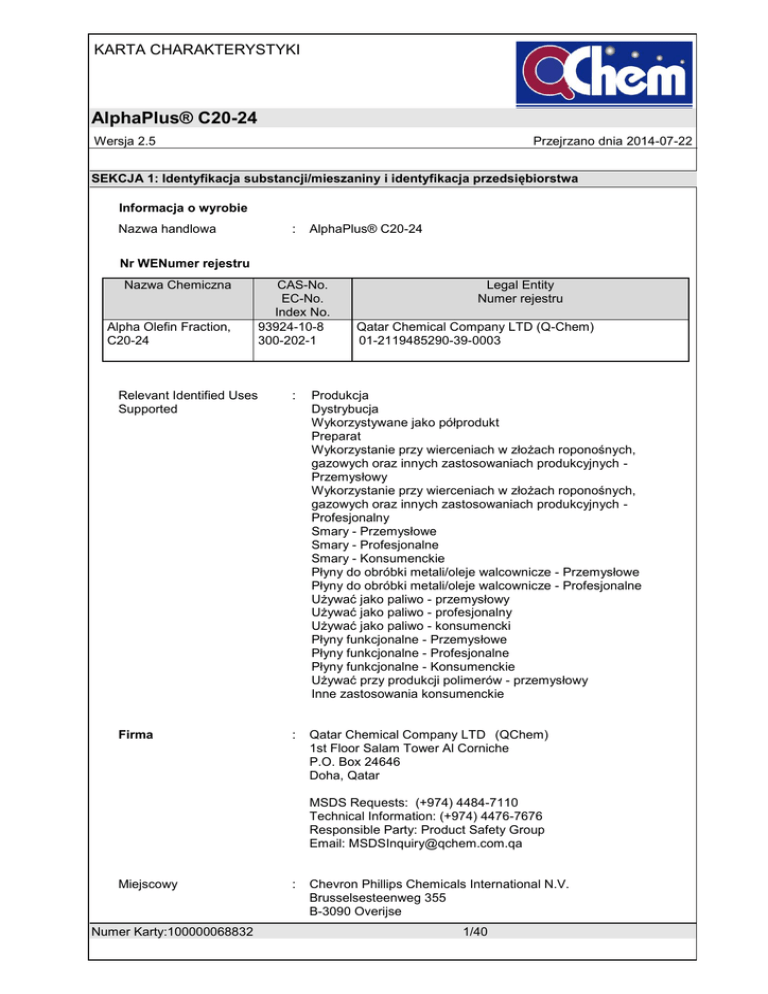 KARTA CHARAKTERYSTYKI AlphaPlus® C20-24 Wersja 2.5 Przejrzano dnia 2014-07-22 SEKCJA 1: Identyfikacja substancji/mieszaniny i identyfikacja przedsiębiorstwa Informacja o wyrobie Nazwa handlowa : AlphaPlus® C20-24 Nr WENumer rejestru Nazwa Chemiczna Alpha Olefin Fraction, C20-24 CAS-No. EC-No. Index No. 93924-10-8 300-202-1 Legal Entity Numer rejestru Qatar Chemical Company LTD (Q-Chem) 01-2119485290-39-0003 Relevant Identified Uses Supported : Produkcja Dystrybucja Wykorzystywane jako półprodukt Preparat Wykorzystanie przy wierceniach w złożach roponośnych, gazowych oraz innych zastosowaniach produkcyjnych Przemysłowy Wykorzystanie przy wierceniach w złożach roponośnych, gazowych oraz innych zastosowaniach produkcyjnych Profesjonalny Smary - Przemysłowe Smary - Profesjonalne Smary - Konsumenckie Płyny do obróbki metali/oleje walcownicze - Przemysłowe Płyny do obróbki metali/oleje walcownicze - Profesjonalne Używać jako paliwo - przemysłowy Używać jako paliwo - profesjonalny Używać jako paliwo - konsumencki Płyny funkcjonalne - Przemysłowe Płyny funkcjonalne - Profesjonalne Płyny funkcjonalne - Konsumenckie Używać przy produkcji polimerów - przemysłowy Inne zastosowania konsumenckie Firma : Qatar Chemical Company LTD (QChem) 1st Floor Salam Tower Al Corniche P.O. Box 24646 Doha, Qatar MSDS Requests: (+974) 4484-7110 Technical Information: (+974) 4476-7676 Responsible Party: Product Safety Group Email: [email protected] Miejscowy Numer Karty:100000068832 : Chevron Phillips Chemicals International N.V. Brusselsesteenweg 355 B-3090 Overijse 1/40 KARTA CHARAKTERYSTYKI AlphaPlus® C20-24 Wersja 2.5 Przejrzano dnia 2014-07-22 Belgium MSDS Requests: (800) 852-5530 Technical Information: (832) 813-4862 Responsible Party: Product Safety Group Email:[email protected] Numer telefonu alarmowego: Zdrowie: 866.442.9628 (Ameryka Północna) 1.832.813.4984 (dla rozmów międzynarodowych) Transport: North America: CHEMTREC 800.424.9300 or 703.527.3887 Asia: +800 CHEMCALL (+800 2436 2255) EUROPE: BIG +32.14.584545 (phone) or +32.14583516 (telefax) South America SOS-Cotec Inside Brazil: 0800.111.767 Outside Brazil: +55.19.3467.1600 Wydział Odpowiedzialny Adres e-mail Strona Internetowa : : : Grupa bezpieczeństwa i toksyczności produktu [email protected] www.CPChem.com SEKCJA 2: Identyfikacja zagrożeń Klasyfikacja substancji lub mieszaniny ROZPORZĄDZENIE (WE) NR 1272/2008 Zagrożenie spowodowane aspiracją, Kategoria 1 H304: Połknięcie i dostanie się przez drogi oddechowe może grozić śmiercią. Klasyfikacja (67/548/EWG, 1999/45/WE) Produkt szkodliwy R65: Działa szkodliwie; może powodować uszkodzenie płuc w przypadku połknięcia. Elementy oznakowania Oznakowanie (ROZPORZĄDZENIE (WE) NR 1272/2008) Piktogramy określające rodzaj zagrożenia : Hasło ostrzegawcze : Niebezpieczeństwo Zwroty wskazujące rodzaj zagrożenia : H304 Zwroty wskazujące środki ostrożności : Reagowanie: P301 + P310 Połknięcie i dostanie się przez drogi oddechowe może grozić śmiercią. W PRZYPADKU POŁKNIĘCIA: Natychmiast skontaktować się z OŚRODKIEM ZATRUĆ lub z lekarzem. NIE wywoływać wymiotów. P331 Magazynowanie: P405 Przechowywać pod zamknięciem. Usuwanie: P501 Zawartość/ pojemnik usuwać do Numer Karty:100000068832 2/40 KARTA CHARAKTERYSTYKI AlphaPlus® C20-24 Wersja 2.5 Przejrzano dnia 2014-07-22 autoryzowanego zakładu utylizacji odpadów. Niebezpieczne składniki muszą być wymienione na etykiecie: ALKENES, C20-24 .ALPHA. 93924-10-8 SEKCJA 3: Skład/informacja o składnikach Synonimy : NAO 20-24 C20-24 Alpha Olefin Fraction Wzór cząsteczkowy : UVCB Mieszaniny Składniki niebezpieczne Nazwa Chemiczna CAS-No. EC-No. Index No. Alpha Olefin Fraction, C20-24 93924-10-8 300-202-1 Klasyfikacja (67/548/EWG) Xn; R65 Klasyfikacja (ROZPORZĄDZEN IE (WE) NR 1272/2008) Asp. Tox. 1; H304 Stężenie [wt%] 100 Pełen tekst zwrotów R zawartych w tej Sekcji umieszczonow w Sekcji 16. Pełny tekst zwrotów H przytoczonych w tej Sekcji znajduje się w Sekcji 16. SEKCJA 4: Środki pierwszej pomocy Porady ogólne : Usunąć z zagrożonej strefy. Przedstawić lekarzowi dołączoną Kartę Charakterystyki Substancji Niebezpiecznej. Objawy mogą się pojawić dopiero w kilka godzin po zatruciu. Nie pozostawiać osoby poszkodowanej bez opieki. W przypadku wdychania : Osobie nieprzytomnej zapewnić wygodną pozycję i zasięgnąć porady medycznej. Jeśli objawy utrzymują się, wezwać lekarza. W przypadku kontaktu z oczami : Zapobiegawczo przemyć oczy wodą. Usunąć szkła (szkło) kontaktowe. Zabezpieczyć nieuszkodzone oko. W trakcie przemywania należy szeroko otwierać oczy. Jeśli podrażnienie oczu utrzymuje się, skonsultować się ze specjalistą. W przypadku połknięcia : Zachować drożność dróg oddechowych. NIE prowokować wymiotów. Nie podawać mleka lub napoju alkoholowego. Nieprzytomnej osobie nigdy nie podawać nic doustnie. Jeśli objawy utrzymują się, wezwać lekarza. Zabrać poszkodowanego niezwłocznie do szpitala. Numer Karty:100000068832 3/40 KARTA CHARAKTERYSTYKI AlphaPlus® C20-24 Wersja 2.5 Przejrzano dnia 2014-07-22 SEKCJA 5: Postępowanie w przypadku pożaru Temperatura zapłonu : 183 °C (183 °C) Metoda: PMCC Temperatura samozapłonu : 239 °C (239 °C) Niewłaściwe środki gaśnicze : Silny strumień wody. Specjalny sprzęt ochronny dla strażaków : W razie konieczności w trakcie akcji gaśniczej założyć aparat oddechowy z zamkniętym obiegiem. Dalsze informacje : Standardowa procedura w przypadku pożaru z udziałem substancji chemicznych. Użycie środków gaśniczych odpowiednich dla lokalnych warunków i dla środowiska. Ochrona przed pożarem i eksplozją : Zapewnić odpowiedni wyciąg wentylacyjny w miejscu tworzenia się pyłu. Niebezpieczne produkty rozkładu : Tlenki węgla. SEKCJA 6: Postępowanie w przypadku niezamierzonego uwolnienia do środowiska Indywidualne środki ostrożności. : Użyć środków ochrony osobistej. Uni