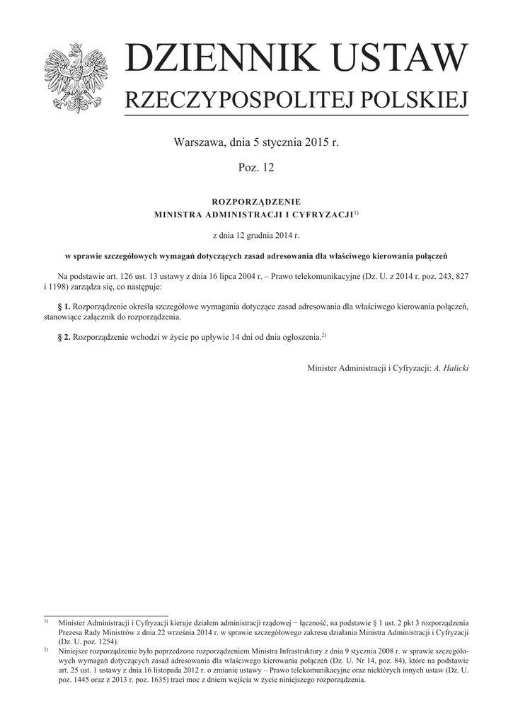 DZIENNIK USTAW RZECZYPOSPOLITEJ POLSKIEJ Warszawa, dnia 5 stycznia 2015 r. Poz. 12 ROZPORZĄDZENIE MINISTRA ADMINISTRACJI I CYFRYZACJI 1) z dnia 12 grudnia 2014 r. w sprawie szczegółowych wymagań dotyczących zasad adresowania dla właściwego kierowania połączeń Na podstawie art. 126 ust. 13 ustawy z dnia 16 lipca 2004 r. – Prawo telekomunikacyjne (Dz. U. z 2014 r. poz. 243, 827 i 1198) zarządza się, co następuje: § 1. Rozporządzenie określa szczegółowe wymagania dotyczące zasad adresowania dla właściwego kierowania połączeń, stanowiące załącznik do rozporządzenia. § 2. Rozporządzenie wchodzi w życie po upływie 14 dni od dnia ogłoszenia.2) Minister Administracji i Cyfryzacji: A. Halicki 1) 2) Minister Administracji i Cyfryzacji kieruje działem administracji rządowej − łączność, na podstawie § 1 ust. 2 pkt 3 rozporządzenia Prezesa Rady Ministrów z dnia 22 września 2014 r. w sprawie szczegółowego zakresu działania Ministra Administracji i Cyfryzacji (Dz. U. poz. 1254). Niniejsze rozporządzenie było poprzedzone rozporządzeniem Ministra Infrastruktury z dnia 9 stycznia 2008 r. w sprawie szczegółowych wymagań dotyczących zasad adresowania dla właściwego kierowania połączeń (Dz. U. Nr 14, poz. 84), które na podstawie art. 25 ust. 1 ustawy z dnia 16 listopada 2012 r. o zmianie ustawy – Prawo telekomunikacyjne oraz niektórych innych ustaw (Dz. U. poz. 1445 oraz z 2013 r. poz. 1635) traci moc z dniem wejścia w życie niniejszego rozporządzenia. Dziennik Ustaw –2– Poz. 12 Załącznik do rozporządzenia Ministra Administracji i Cyfryzacji z dnia 12 grudnia 2014 r. (poz. 12) SZCZEGÓŁOWE WYMAGANIA DOTYCZĄCE ZASAD ADRESOWANIA DLA WŁAŚCIWEGO KIEROWANIA POŁĄCZEŃ § 1. Informacja adresowa o numerze abonenta wywołującego powinna być niezmienna na całej drodze połączeniowej, z zastrzeżeniem § 2. § 2. Numer zastępujący numer abonenta (numer techniczny) powinien być wykorzystywany przy: 1) realizowaniu połączenia na numery alarmowe z telekomunikacyjnego urządzenia końcowego bez użycia przez abonenta wielofunkcyjnej, inteligentnej karty identyfikacyjnej (Subscriber Identity Module), zwanej dalej „kartą SIM”, lub 2) używaniu przez abonenta, w przypadku braku zasięgu, w połączeniu na numery alarmowe, karty SIM zalogowanej w sieci innej niż sieć wykorzystywana przez dostawcę usług, z którym abonent wywołujący zawarł umowę o świadczenie usług telekomunikacyjnych. § 3. Dla numeracji służącej realizacji uprawnień abonentów do przenoszenia przydzielonego numeru pomiędzy dostawcami usług, dla przypadków, gdy występuje zmiana sieci, ustala się: 1) następujące zasady adresowania dla właściwego kierowania połączeń w zakresie numeracji służącej realizacji uprawnień abonenta do przenoszenia przydzielonego numeru pomiędzy dostawcami usług: a) numer rutingowy (NR NP) zamieszcza się w parametrze Called Party Number1) wiadomości IAM (Initial Address Message)2) przed numerem abonenta B (tryb połączony „concatenated”), b) parametr NoA (Nature of Address)3) przyjmuje wartość 3, c) adresowanie metodą „en-bloc”4), d) numer rutingowy (NR NP) dołącza się po odpytaniu bazy dla numerów przeniesionych; dopuszcza się dołączenie numeru rutingowego (NR NP) po odpytaniu bazy dla numerów nieprzeniesionych; 2) następujący format numeru rutingowego (NR NP): NR NP (5 cyfr) = „C hex”5) + XYZT, gdzie: a) dla numerów geograficznych: XY = AB = wskaźnik strefy numeracyjnej SN (X=1–9), ZT6) = numer HOST (HOST – ID)7) w danej SN (dla danego AB), b) dla numerów niegeograficznych: XYZT – numer sieci (X = 0). § 4. Dla numeracji służącej realizacji wywołań do trzycyfrowych numerów AUS i numeru alarmowego 112 ustala się: 1) następujące zasady kierowania ruchu: a) połączenia do trzycyfrowych numerów AUS oraz numeru alarmowego 112 mogą być realizowane po odebraniu numeru tylko w formatach: – XYZ (3 cyfry) – z łącza abonenckiego, – WSNd (2 cyfry) + „C hex” + IDL (3 cyfry) + XYZ (3 cyfry) – z łącza międzycentralowego, w tym łącza międzyoperatorskiego, b) numer kierowania alarmowego (NKA), związany z położeniem abonenta w obszarze gminy, jest wprowadzany w centrali obsługującej zakończenie sieci, z którego nastąpiło wywołanie alarmowe, c) w centrali obsługującej zakończenie sieci, z którego nastąpiło wywołanie alarmowe, następuje konwersja z trzycyfrowego numeru AUS i numeru alarmowego 112 odebranego od abonenta na numer w formacie WSNd + „C hex” + IDL + XYZ, Dziennik Ustaw –3– Poz. 12 d) NKA powinien być niezmienny na całej drodze połączeniowej, e) zamiana NKA na numer krajowy KNA (numer podkładowy) następuje w centrali bezpośrednio obsługującej jednostkę, do której kierowane jest wywołanie alarmowe na trzycyfrowy numer AUS lub numer alarmowy 112; 2) następujący format NKA: NKA = WSNd (2 cyfry) + „C hex” + IDL (3 cyfry) + XYZ (3 cyfry), gdzie: WSNd (Wskaźnik Strefy Numeracyjnej docelowej) – oznacza strefę numeracyjną, w jakiej znajduje się jednostka, do której kierowane jest wywołanie alarmowe, IDL (Identyfikator Docelowej Lokalizacji) – wskazuje jednostkę, do której kierowane jest wywołanie alarmowe, występującą w danej lokalizacji w danej strefie numeracyjnej, XYZ – oznacza wybrany trzycyfrowy numer AUS i numer alarmowy 112. Obja śn i e n i a : 1) Parametr Called Party Number – parametr stosowany w Systemie Sygnalizacji ITU-T nr 7 (SS7), zawarty w wiadomości IAM, zawierający w szczególności zakodowany numer abonenta wywoływanego. 2) Wiadomość IAM (Initial Address Message) – wiadomość zawarta w protokole ISUP (ISDN User Part), przesyłana w procesie zestawiania połączenia. 3) Parametr NoA (Nature of Address) – wskaźnik określający typ adresu. 4) Adresowanie metodą „en-bloc” – sposób adresowania polegający na równoczesnym przekazywaniu wszystkich cyfr numeru ab