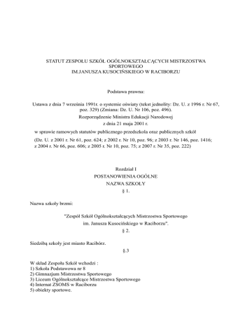 STATUT ZESPOŁU SZKÓŁ OGÓLNOKSZTAŁCĄCYCH MISTRZOSTWA SPORTOWEGO IM.JANUSZA KUSOCIŃSKIEGO W RACIBORZU Podstawa prawna: Ustawa z dnia 7 września 1991r. o systemie oświaty (tekst jednolity: Dz. U. z 1996 r. Nr 67, poz. 329) (Zmiana: Dz. U. Nr 106, poz. 496). Rozporządzenie Ministra Edukacji Narodowej z dnia 21 maja 2001 r. w sprawie ramowych statutów publicznego przedszkola oraz publicznych szkół (Dz. U. z 2001 r. Nr 61, poz. 624; z 2002 r. Nr 10, poz. 96; z 2003 r. Nr 146, poz. 1416; z 2004 r. Nr 66, poz. 606; z 2005 r. Nr 10, poz. 75; z 2007 r. Nr 35, poz. 222) Rozdział I POSTANOWIENIA OGÓLNE NAZWA SZKOŁY § 1. Nazwa szkoły brzmi: "Zespół Szkół Ogólnokształcących Mistrzostwa Sportowego im. Janusza Kusocińskiego w Raciborzu". § 2. Siedzibą szkoły jest miasto Racibórz. §.3 W skład Zespołu Szkół wchodzi : 1) Szkoła Podstawowa nr 8 2) Gimnazjum Mistrzostwa Sportowego 3) Liceum Ogólnokształcące Mistrzostwa Sportowego 4) Internat ZSOMS w Raciborzu 5) obiekty sportowe. INNE INFORMACJE O SZKOLE § 4. Zespół Szkół powstał na mocy decyzji Nr -IV-5090/1/77 Kuratora Oświaty i Wychowania w Katowicach z dnia 1 sierpnia 1977 r. jako Szkoła Mistrzostwa Sportowego im. Janusza Kusocińskiego w Raciborzu. Na mocy decyzji Nr O-IV-5090/1/79 Kuratora Oświaty i Wychowania w Katowicach z dnia 20 kwietnia 1979 r. Szkoła otrzymała nazwę Zespół Szkół Ogólnokształcących Mistrzostwa Sportowego im. Janusza Kusocińskiego w Raciborzu. Dopuszcza się stosowanie skróconej nazwy ZSOMS. § 5. 1.ZSOMS w Raciborzu jest oświatową placówką publiczną działającą w formie centrum szkolenia sportowego o obwodzie terytorium Rzeczpospolitej Polski, ze szczególnym uwzględnieniem województwa śląskiego, której organem prowadzącym jest Województwo Śląskie. 2.Nadzór pedagogiczny sprawuje Śląski Kurator Oświaty w Katowicach. 3.Nadzór nad organizacją finansowania sportowego Zespołu Szkół sprawuje Ministerstwo Sportu poprzez Polski Związek Pływacki i Polski Związek Lekkiej Atletyki. Kształcenie, szkolenie sportowe oraz opieka wychowawcza realizowana jest w oparciu o następujące obiekty : 3.1 budynki dydaktyczne 3.2 kryta pływalnia a) basen 25 metrowy b) siłownia c) salka do ćwiczeń specjalistycznych d) gabinety odnowy biologicznej i masażu (w tym sauna sucha i parowa) 3.3 hala z bieżnią tartanową 3.4 sala gimnastyczna 3.5 kompleks lekkoatletyczny "Bliżej sportu" 3.6 internat ze stołówką dla uczniów zamiejscowych 3.7 świetlica szkolna ze stołówką. Rozdział II CELE I ZADANIA SZKOŁY § 6. Szkoła realizuje cele i zadania określone w Ustawie o systemie oświaty z dnia 7 września 1991 r. z późn. zmianami. 1. Szkoła organizuje i zapewnia bezpłatne i obowiązkowe uczestniczenie w procesie dydaktycznym na poziomie szkoły podstawowej , gimnazjum i liceum w klasach pływackich ,triathlonu, lekkoatletycznych, interdyscyplinarnych (wielosportowych), siatkarskich, zapaśniczych, piłkarskich, badmintonowych oraz informatycznych. 2. Szkoła Podstawowa nr 8 , Gimnazjum Mistrzostwa Sportowego i Liceum Ogólnokształcące Mistrzostwa Sportowego zapewniają harmonijne kształcenie dydaktyczne młodzieży uzdolnionej sportowo z realizacją programu treningowego prowadzonych dyscyplin sportowych. 3. Propaguje i realizuje model wychowania oparty o idee olimpijskie i współzawodnictwa sportowego. 4. Przygotowuje zawodników- uczniów do reprezentowania Polski, Regionu i Szkoły na zawodach najwyższej rangi: 4.1 Igrzysk Olimpijskich 4.2 Mistrzostwa Świata i Europy 4.3 Mistrzostwa Polski w różnych kategoriach wiekowych. 5. Organizuje powszechną naukę pływania oraz zajęcia korekcyjne i prozdrowotne dla dzieci 6. Rozpoznaje i kształtuje środowisko wychowawcze ucznia poprzez : 6.1 wywiady, rozmowy i konsultacje wychowawcy z rodzicami, 6.2 spotkania pedagoga szkolnego z rodzicami, 6.3 nawiązywanie kontaktów z poradnią psychologiczno-pedagogiczną. 6.4 Sprawuje opiekę nad uczniami ZSOMS poprzez : a) działalność internatu b) działalność świetlicy, c) organizację dożywiania d) systematyczną opiekę lekarską, e) organizowanie opieki nad uczniami niepełnosprawnymi uczęszczającymi do szkoły. 7. Szkoła umożliwia uczniom uczestnictwo w zajęciach religii. 8. Szkoła umożliwia rozwijanie zainteresowań uczniów poprzez : 8.1 udział w kołach przedmiotowych i kółkach zainteresowań prowadzonych przez szkołę i placówki pozaszkolne 8.2 uczestnictwo w konkursach, olimpiadach i zawodach. 9. Szkoła zapewnia uczniom pomoc pedagogiczną, opiekuńczą, psychologiczną i medyczną poprzez : 9.1 możliwość stałego kontaktu z pedagogiem szkolnym, 9.2 Samorząd Uczniowski 9.3 możliwość interwencji w Ośrodku Pomocy Społecznej, Sądzie Rejonowym Rodzinnym i Nieletnich i Poradni Zdrowia Psychicznego 9.4 kontakt z Poradnią Psychologiczno-Pedagogiczną 9.5 prowadzenie gabinetu pielęgniarskiego. 10. Szkoła umożliwia uczniom szkoły podstawowej zdobycie wiedzy i umiejętności niezbędnych do uzyskania świadectwa ukończenia szkoły podstawowej i podjęcie dalszej nauki w gimnazjum. 11. Umożliwia uczniom gimnazjum zdobycie wiedzy pozwalającej na kontynuację nauki w szkole średniej. 12. Umożliwia uczniom liceum ogólnokształcącego przystąpienie do matury. 13. Kształtuje środowisko wychowawcze sprzyjające realizowaniu celów i zasad określonych w programie wychowawczym i programie profilaktyki. 14. Sprawuje opiekę nad uczniami odpowiednio do ich potrzeb, warunków oraz możliwości szkoły. 15. W Szkole istnieją klasy: 15.1 nauczanie początkowe klasy I-III o rozszerzonym wychowaniu fizycznym 15.2 klasy IV-VI SP o profilu pływackim , piłki nożnej, badmintona i ogólnym 15.3 Gimnazjum Mistrzostwa Sportowego - klasy o profilu pływackim ,lekkoatletycznym ,piłki nożnej ,zapasów, badmintona i interdyscyplinarnym(wieloportowym) 15.4 Liceum Ogólnokształcące Mistrzostwa Sportowego realizuje : ogólny profil kształcen