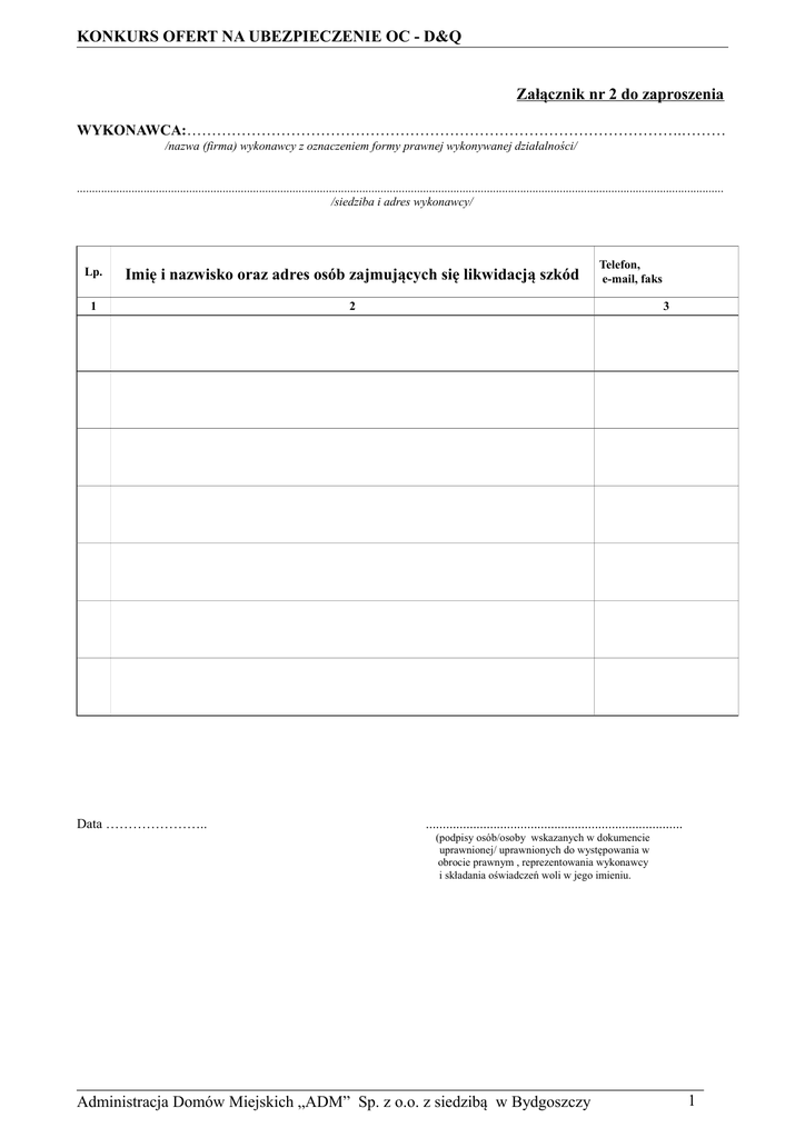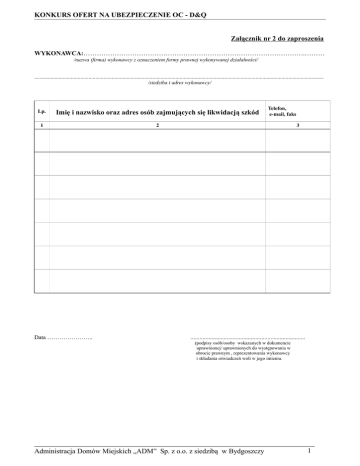 KONKURS OFERT NA UBEZPIECZENIE OC - D&Q Załącznik nr 2 do zaproszenia WYKONAWCA:……………………………………………………………………………………….……… /nazwa (firma) wykonawcy z oznaczeniem formy prawnej wykonywanej działalności/ ..................................................................................................................................................................................................................... /siedziba i adres wykonawcy/ Lp. Imię i nazwisko oraz adres osób zajmujących się likwidacją szkód 1 2 Data ………………….. Telefon, e-mail, faks 3 ............................................................................ (podpisy osób/osoby wskazanych w dokumencie uprawnionej/ uprawnionych do występowania w obrocie prawnym , reprezentowania wykonawcy i składania oświadczeń woli w jego imieniu. Administracja Domów Miejskich „ADM” Sp. z o.o. z siedzibą w Bydgoszczy 1 Administracja Domów Miejskich „ADM” Sp. z o.o. z siedzibą w Bydgoszczy 2