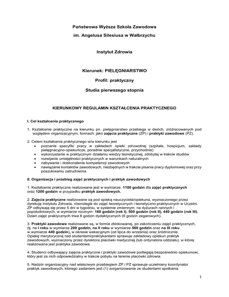 Państwowa Wyższa Szkoła Zawodowa im. Angelusa Silesiusa w Wałbrzychu Instytut Zdrowia Kierunek: PIELĘGNIARSTWO Profil: praktyczny Studia pierwszego stopnia KIERUNKOWY REGULAMIN KSZTAŁCENIA PRAKTYCZNEGO I. Cel kształcenia praktycznego 1. Kształcenie praktyczne na kierunku pn. pielęgniarstwo przebiega w dwóch, zróżnicowanych pod względem organizacyjnym, formach: jako zajęcia praktyczne (ZP) i praktyki zawodowe (PZ). 2. Celem kształcenia praktycznego w/w kierunku jest poznanie specyfiki pracy w zakładach opieki zdrowotnej (szpitale, hospicjum, zakłady pielęgnacyjno-opiekuńcze, poradnie specjalistyczne, przychodnie) wykorzystanie w praktycznym działaniu wiedzy teoretycznej, zdobytej w trakcie studiów rozwijanie umiejętności praktycznych w warunkach naturalnych nabywanie i doskonalenie kompetencji zawodowych nawiązanie kontaktów zawodowych, niezbędnych w trakcie pisania pracy dyplomowej oraz przy poszukiwaniu zatrudnienia. II. Organizacja i przebieg zajęć praktycznych i praktyk zawodowych 1. Kształcenie praktyczne realizowane jest w wymiarze: 1100 godzin dla zajęć praktycznych oraz 1200 godzin w przypadku praktyk zawodowych. 2. Zajęcia praktyczne realizowane są pod opieką nauczyciela/opiekuna, wyznaczonego przez dyrekcję Instytutu Zdrowia, równolegle do zajęć teoretycznych i teoretyczno-praktycznych w Uczelni. ZP odbywają się przez 5 dni w tygodniu, w systemie zmiennym: na dyżurach rannych i popołudniowych, w wymiarze rocznym: 160 godzin (rok I), 500 godzin (rok II), 440 godzin (rok III). Dzień zajęć praktycznych trwa 8 godzin dydaktycznych (6 godzin zegarowych). 3. Praktyki zawodowe realizowane są, w formie zblokowanej, po zakończeniu zajęć praktycznych, (tj. na I roku w wymiarze 200 godzin, na II roku w wymiarze 560 godzin oraz na III roku w wymiarze 440 godzin), w okresie wakacyjnym (od lipca do września) oraz śródrocznie. Opiekę merytoryczną nad studentami/praktykantami sprawuje zakładowy opiekun praktyk zawodowych, wyznaczony przez dyrektora placówki medycznej (lub ordynatora oddziału), w której realizowana jest praktyka zawodowa. 4. Studenci odbywający zajęcia praktyczne i praktyki zawodowe podlegają bezpośrednio opiekunowi, który jest za nich odpowiedzialny w trakcie pobytu na terenie placówki zdrowia. 5. Nadzór organizacyjny nad właściwym przebiegiem ZP i PZ sprawuje uczelniany koordynator praktyk zawodowych, którego zadaniem jest (1) zorganizowanie ze studentami spotkania 1 informacyjnego, dotyczącego warunków realizacji praktyk zawodowych, (2) przygotowanie dokumentacji kształcenia praktycznego, (3) przygotowanie w porozumieniu z Zakładami Opieki Zdrowotnej oraz dyrekcją Instytutu Zdrowia harmonogramu zajęć praktycznych i praktyk zawodowych, (4) bieżąca koordynacja przebiegu praktyk zawodowych, (5) zatwierdzanie złożonej przez studenta dokumentacji ze zrealizowanej praktyki zawodowej (6) utrzymywanie stałego kontaktu z Zakładami Opieki Zdrowotnej oraz (7) przygotowanie rocznego sprawozdania z przebiegu kształcenia praktycznego. 6. Miejscem realizacji zajęć praktycznych i praktyk zawodowych są: szpitale (Specjalistyczny Szpital im. dra Alfreda Sokołowskiego w Wałbrzychu, Specjalistyczny Szpital Ginekologiczno - Położniczy im. E. Biernackiego w Wałbrzychu, Regionalny Szpital Specjalistyczny Latawiec SPZOZ w Świdnicy, Szpital Powiatowy SPZOZ w Kamiennej Górze) przychodnie (Przychodnia Specjalistyczna Regina i Walenty Śliwa. Spółka Jawna, Nowe Miasto Spółka z o.o. Centrum Medyczne „Nowe Miasto”, Niepubliczny Zakład Opieki Zdrowotnej „UNIMED” Spółka z o.o., Ośrodek Diagnostyczno-Leczniczy przy Górniczej Fundacji Ochrony Zdrowia w Wałbrzychu, Niepubliczny Zakład Opieki Zdrowotnej „Przychodnia Piaskowa Góra”, Edmund Kryś „Przychodnia Podgórze”, Samodzielny Publiczny Zakład Opieki Zdrowotnej, Miejski Ośrodek Zdrowia w Świebodzicach) hospicjum (Polskie Towarzystwo Opieki Paliatywnej Oddział w Wałbrzychu) ośrodki opieki pielęgniarskiej (domowej, środowiskowej, edukacyjnej: szkoły, przedszkola, żłobki) III. Zakładane efekty kształcenia W trakcie kształcenia praktycznego – zajęć praktycznych i praktyk zawodowych- realizowane są efekty kształcenia modułu C i D (podstaw opieki pielęgniarskiej i opieki specjalistycznej), zgodne ze standardem kształcenia dla kierunku pielęgniarstwo (Rozporządzenie Ministra Nauki i Szkolnictwa Wyższego z dn. 9 maja 2012., Dz.U. z dnia 5 czerwca 2012 r., poz.631, załącznik Nr 4). IV. Obowiązki i prawa studenta-praktykanta 1. Obowiązkiem studenta jest: posiadanie ubezpieczenia OC oraz NW rozszerzonego o ekspozycję zawodową (zakażenie wirusem HIV i żółtaczką), posiadanie szczepienia przeciwko WZW typu B, posiadanie książeczki zdrowia dla celów sanitarno-epidemiologicznych z aktualnym wpisem lekarza o zdolności do zajęć praktycznych, obowiązującym przez cały czas trwania zajęć i udostępnianie jej do wglądu: opiekunowi praktyk, pracownikom Stacji SanitarnoEpidemiologicznej. W przypadku kontroli, za brak książeczki lub aktualnego wpisu lekarza o zdolności do zajęć, odpowiedzialność (również finansową) ponosi student zmiana odzieży na ochronną (mundurek szpitalny, obuwie szpitalne, rękawiczki jednorazowe, identyfikator z imieniem i nazwiskiem oraz nazwą uczelni) zapoznanie się z przepisami BHP, specyfiką i funkcjonowaniem oddziału szpitalnego/ placówki medycznej, w której realizowana jest praktyka odbycie i zaliczenie wszystkich zajęć praktycznych (ZP) i praktyk zawodowych (PZ) wynikających z programu studiów - wymagana 100% obecność na zajęciach (nieobecność student winien usprawiedliwić i po uzgodnieniu z opiekunem z ramienia placówki, odpracować) wykonywanie zabiegów pielęgniarskich (zgodnie z zakładanymi efektami kształcenia, zawartymi we właściwych sylabusach), za zgodą i pod nadzorem prowadzącego zajęcia praktyczne lub praktyki zawodowe przestrzeganie regula