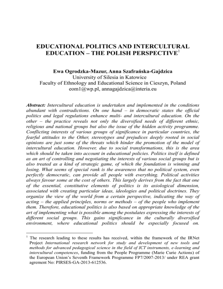 EDUCATIONAL POLITICS AND INTERCULTURAL EDUCATION – THE POLISH PERSPECTIVE1 Ewa Ogrodzka-Mazur, Anna Szafrańska-Gajdzica University of Silesia in Katowice Faculty of Ethnology and Educational Science in Cieszyn, Poland [email protected], [email protected] Abstract: Intercultural education is undertaken and implemented in the conditions abundant with contradictions. On one hand – in democratic states the official politics and legal regulations enhance multi- and intercultural education. On the other – the practice reveals not only the diversified needs of different ethnic, religious and national groups but also the issue of the hidden activity programme. Conflicting interests of various groups of significance in particular countries, the fearful attitudes to the Other, stereotypes and prejudices deeply rooted in social opinions are just some of the threats which hinder the promotion of the model of intercultural education. However, due to social transformations, this is the area which should be taken into account in educational policies. Politics itself is defined as an art of controlling and negotiating the interests of various social groups but is also treated as a kind of strategic game, of which the foundation is winning and losing. What seems of special rank is the awareness that no political system, even perfectly democratic, can provide all people with everything. Political activities always favour some at the cost of others. This largely derives from the fact that one of the essential, constitutive elements of politics is its axiological dimension, associated with creating particular ideas, ideologies and political doctrines. They organize the view of the world from a certain perspective, indicating the way of acting – the applied principles, norms or methods – of the people who implement them. Therefore, educational politics is also based on appropriate knowledge of the art of implementing what is possible among the postulates expressing the interests of different social groups. This gains significance in the culturally diversified environment, where educational politics should be especially focused on. 1 The research leading to these results has received, within the framework of the IRNet Project International research network for study and development of new tools and methods for advanced pedagogical science in the field of ICT instruments, e-learning and intercultural competences, funding from the People Programme (Marie Curie Actions) of the European Union’s Seventh Framework Programme FP7/2007-2013/ under REA grant agrement No: PIRSES-GA-2013-612536. 126 Ewa Ogrodzka-Mazur, Anna Szafrańska-Gajdzica Unfortunately, educational politics in Poland is one of the most neglected/abandoned fields of education. Obviously, this results from excessive influence of politics on the educational sphere in the period of communist Poland. Keywords: politics, educational politics, multi- and intercultural education, culturally diversified environment 1. INTRODUCTION Intercultural education is undertaken and implemented in the conditions abundant in contradictions. On one hand – in democratic countries the official politics and legal regulations foster multi- and intercultural education. However, on the other hand – practice indicates quite differentiated needs of various ethnic, religious or national groups (Lewowicki 2005: 21, Kelley 2010) and the appearing issue of the hidden programme. Conflicting interests of various significant groups in particular countries, attitudes of fear towards the Other, stereotypes rooted in social opinions, and prejudices are just some of the threats which hinder promoting the model of intercultural education. Yet, due to social changes, this is a field which should be taken into account in educational politics. Unfortunately, educational policy in Poland is one of the most neglected/abandoned areas of education. This must be an effect of excessive influence of politics on the educational sphere in the times of communist Poland1. Although the recent years have been full of suggestions for educational changes in a more narrow or broader scale, they cannot be treated as a transparent educational policy. These are rather urgent activities introduced without social consultations. Despite the fact that these activities have become a part of election programmes, their essential value is difficult to assess. They constitute a set of populist slogans rather than the actual description of suggested activities planned by a particular political party in the field of education. Still, educational politics is an area which requires special interest – particularly in the context of functioning of education in the more and more diversified world. It is not possible to implement efficient educational policy without a well-prepared system of diagnoses and prognoses which will allow for realistic/optimal planning of educational changes. It is expected that due to the necessity to consider the postulates of various social groups in the educational policy, its main constituents are strategy and tactics. The analysis of educational politics in multicultural environments may create an impression that other activities are dealt with – compromise and struggle (1989). The presented text is an attempt at indicating the determinants of practising educational politics in culturally diversified environments. These issues have been explored in the publishing series Edukacja Międzykulturowa / Intercultural Education. As a separate thread, educational politics has been discussed by many authors. In 2005, a publication entirely dedicated to these issues was prepared (Lewowicki, Ogrodzka -Mazur 2005). However, educational politics most frequently appear as a secondary motif touched by authors merely on the margin of basic discussion (Gaj dzica 2011, Ogrodzka -Mazur 2014, 2015). Educational Politics and Intercultural Education – Polish Perspective 127 2. DETERMINANTS OF P