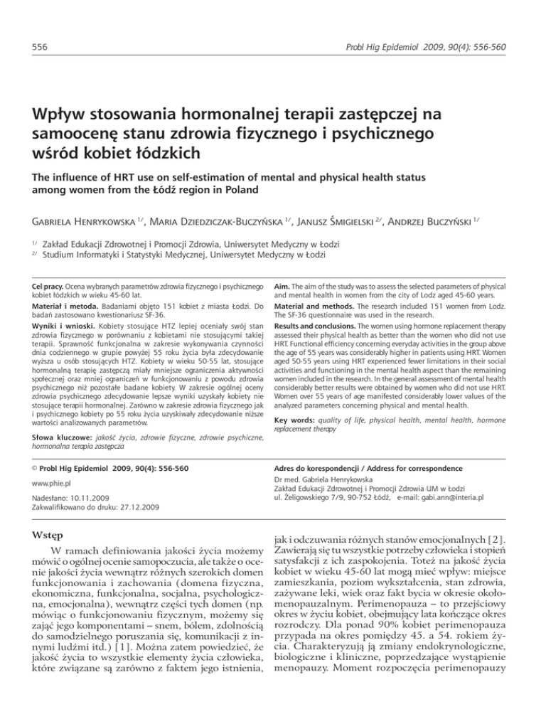 556 Probl Hig Epidemiol 2009, 90(4): 556-560 Wpływ stosowania hormonalnej terapii zastępczej na samoocenę stanu zdrowia fizycznego i psychicznego wśród kobiet łódzkich The influence of HRT use on self-estimation of mental and physical health status among women from the Łódź region in Poland Gabriela Henrykowska 1/, Maria Dziedziczak-Buczyńska 1/, Janusz Śmigielski 2/, Andrzej Buczyński 1/ Zakład Edukacji Zdrowotnej i Promocji Zdrowia, Uniwersytet Medyczny w Łodzi Studium Informatyki i Statystyki Medycznej, Uniwersytet Medyczny w Łodzi 1/ 2/ Cel pracy. Ocena wybranych parametrów zdrowia fizycznego i psychicznego kobiet łódzkich w wieku 45-60 lat. Aim. The aim of the study was to assess the selected parameters of physical and mental health in women from the city of Lodz aged 45-60 years. Materiał i metoda. Badaniami objęto 151 kobiet z miasta Łodzi. Do badań zastosowano kwestionariusz SF-36. Material and methods. The research included 151 women from Lodz. The SF-36 questionnaire was used in the research. Wyniki i wnioski. Kobiety stosujące HTZ lepiej oceniały swój stan zdrowia fizycznego w porównaniu z kobietami nie stosującymi takiej terapii. Sprawność funkcjonalna w zakresie wykonywania czynności dnia codziennego w grupie powyżej 55 roku życia była zdecydowanie wyższa u osób stosujących HTZ. Kobiety w wieku 50-55 lat, stosujące hormonalną terapię zastępczą miały mniejsze ograniczenia aktywności społecznej oraz mniej ograniczeń w funkcjonowaniu z powodu zdrowia psychicznego niż pozostałe badane kobiety. W zakresie ogólnej oceny zdrowia psychicznego zdecydowanie lepsze wyniki uzyskały kobiety nie stosujące terapii hormonalnej. Zarówno w zakresie zdrowia fizycznego jak i psychicznego kobiety po 55 roku życia uzyskiwały zdecydowanie niższe wartości analizowanych parametrów. Results and conclusions. The women using hormone replacement therapy assessed their physical health as better than the women who did not use HRT. Functional efficiency concerning everyday activities in the group above the age of 55 years was considerably higher in patients using HRT. Women aged 50-55 years using HRT experienced fewer limitations in their social activities and functioning in the mental health aspect than the remaining women included in the research. In the general assessment of mental health considerably better results were obtained by women who did not use HRT. Women over 55 years of age manifested considerably lower values of the analyzed parameters concerning physical and mental health. Key words: quality of life, physical health, mental health, hormone replacement therapy Słowa kluczowe: jakość życia, zdrowie fizyczne, zdrowie psychiczne, hormonalna terapia zastępcza © Probl Hig Epidemiol 2009, 90(4): 556-560 www.phie.pl Nadesłano: 10.11.2009 Zakwalifikowano do druku: 27.12.2009 Wstęp W ramach definiowania jakości życia możemy mówić o ogólnej ocenie samopoczucia, ale także o ocenie jakości życia wewnątrz różnych szerokich domen funkcjonowania i zachowania (domena fizyczna, ekonomiczna, funkcjonalna, socjalna, psychologiczna, emocjonalna), wewnątrz części tych domen (np. mówiąc o funkcjonowaniu fizycznym, możemy się zająć jego komponentami – snem, bólem, zdolnością do samodzielnego poruszania się, komunikacji z innymi ludźmi itd.) [1]. Można zatem powiedzieć, że jakość życia to wszystkie elementy życia człowieka, które związane są zarówno z faktem jego istnienia, Adres do korespondencji / Address for correspondence Dr med. Gabriela Henrykowska Zakład Edukacji Zdrowotnej i Promocji Zdrowia UM w Łodzi ul. Żeligowskiego 7/9, 90-752 Łódź, e-mail: [email protected] jak i odczuwania różnych stanów emocjonalnych [2]. Zawierają się tu wszystkie potrzeby człowieka i stopień satysfakcji z ich zaspokojenia. Toteż na jakość życia kobiet w wieku 45-60 lat mogą mieć wpływ: miejsce zamieszkania, poziom wykształcenia, stan zdrowia, zażywane leki, wiek oraz fakt bycia w okresie okołomenopauzalnym. Perimenopauza – to przejściowy okres w życiu kobiet, obejmujący lata kończące okres rozrodczy. Dla ponad 90% kobiet perimenopauza przypada na okres pomiędzy 45. a 54. rokiem życia. Charakteryzują ją zmiany endokrynologiczne, biologiczne i kliniczne, poprzedzające wystąpienie menopauzy. Moment rozpoczęcia perimenopauzy Henrykowska G i wsp. Wpływ stosowania hormonalnej terapii zastępczej na samoocenę stanu zdrowia fizycznego ... Ocena jakości stanu zdrowia fizycznego i psychicznego kobiet w wieku 45-60 lat w aspekcie stosowania hormonalnej terapii zastępczej oraz ocena wpływu terapii na funkcjonalność i jakość życia kobiet Materiał i metody Programem badawczym objęto grupę 151 kobiet w przedziale wiekowym 45-60 roku życia, zamieszkałych na terenie miasta Łodzi. Dla potrzeb dalszej analizy badane podzielono na trzy grupy wiekowe (46-50 lat, 51-55 lat, powyżej 55 roku życia) oraz ze względu na stosowanie hormonalnej terapii zastępczej (HTZ). W badaniu zastosowano metodę „śnieżnej kuli” [5]. Narzędzie badawcze stanowił kwestionariusz ankiety, który składał się z 2 części. Ogólnej dotyczącej stanu społecznego, aktywności zawodowej, dolegliwości psychofizycznych oraz stosowania środków farmakologicznych, w tym hormonalnej terapii zastępczej (HTZ). Drugą część stanowił kwestionariusz stanu zdrowia – SF-36 [6]. Wyniki Kwestionariusz SF-36 rozpatrywano w dwóch aspektach: Ocena zdrowia w sferze fizycznej Skale 1. brak ograniczeń w stanie funkcjonalnym w zakresie wykonywania czynności dnia codziennego np. kąpiel, ubieranie się, odkurzanie, noszenie zakupów, przejście 100m-2km, wejście na pierwsze oraz na trzecie piętro; 2. brak ograniczeń w funkcjonowaniu z powodu zdrowia fizycznego w wykonywaniu czynności dnia codziennego lub zrobienie mniej niż było zamierzone; 3. brak odczuwania bólu w ciągu ostatnich 4 tygodni oraz brak ogranicze