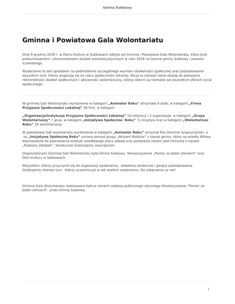 Gmina Subkowy Gminna i Powiatowa Gala Wolontariatu Dnia 9 grudnia 2016 r. w Domu Kultury w Subkowach odbyła się Gminna i Powiatowa Gala Wolontariatu, która była podsumowaniem i uhonorowaniem działań woluntarystycznych w roku 2016 na terenie gminy Subkowy i powiatu tczewskiego. Wydarzenie to jest sposobem na podkreślenie szczególnego wymiaru działalności społecznej oraz podziękowanie wszystkim tym, którzy angażują się na rzecz społeczności lokalnej. Akcja ta stanowi także okazję do pokazania różnorodności działań społecznych i aktywności wolontariuszy, którzy obecni są niemalże we wszystkich sferach życia społecznego. W gminnej Gali Wolontariatu wyróżnienie w kategorii „Animator Roku” otrzymało 9 osób, w kategorii „Firma Przyjazna Społeczności Lokalnej” 26 firm, w kategorii „Organizacja/Instytucja Przyjazna Społeczności Lokalnej” 10 instytucji i 2 organizacje, w kategorii „Grupa Wolontariuszy” 7 grup, w kategorii „Inicjatywa Społeczna Roku” 5 inicjatyw oraz w kategorii „Wolontariusz Roku” 25 wolontariuszy. W powiatowej Gali wolontariatu wyróżnienie w kategorii „Animator Roku” otrzymał Pan Dominik Szupryczyński, a za „Inicjatywę Społeczną Roku” uznano pomysł grupy „Aktywni Rodzice” z naszej gminy, która na osiedlu Witosa doprowadziła do poprawienia estetyki osiedlowego placu zabaw oraz powstania siłowni pod chmurką o nazwie „Radosny Zakątek”. Serdecznie Gratulujemy zwycięzcom. Organizatorami Gminnej Gali Wolontariatu była Gmina Subkowy, Stowarzyszenie „Pomoc za Jeden Uśmiech” oraz Dom Kultury w Subkowach. Wszystkim, którzy przyczynili się do organizacji wydarzenia, składamy serdeczne i gorące podziękowania. Dziękujemy również tym, którzy uczestniczyli w tak wielkim wydarzeniu. Do zobaczenia za rok! Gminna Gala Wolontariatu realizowana była w ramach zadania publicznego zleconego Stowarzyszeniu "Pomoc za Jeden Uśmiech" przez Gminę Subkowy. 1