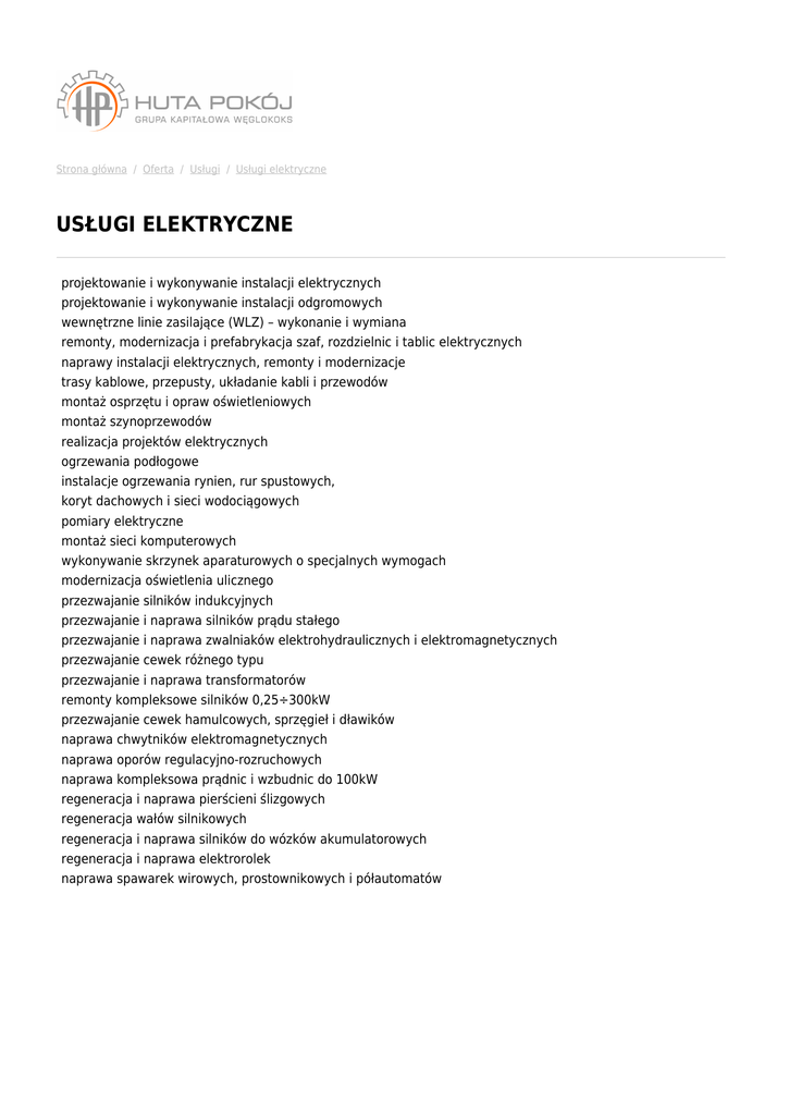 Strona główna / Oferta / Usługi / Usługi elektryczne USŁUGI ELEKTRYCZNE projektowanie i wykonywanie instalacji elektrycznych projektowanie i wykonywanie instalacji odgromowych wewnętrzne linie zasilające (WLZ) – wykonanie i wymiana remonty, modernizacja i prefabrykacja szaf, rozdzielnic i tablic elektrycznych naprawy instalacji elektrycznych, remonty i modernizacje trasy kablowe, przepusty, układanie kabli i przewodów montaż osprzętu i opraw oświetleniowych montaż szynoprzewodów realizacja projektów elektrycznych ogrzewania podłogowe instalacje ogrzewania rynien, rur spustowych, koryt dachowych i sieci wodociągowych pomiary elektryczne montaż sieci komputerowych wykonywanie skrzynek aparaturowych o specjalnych wymogach modernizacja oświetlenia ulicznego przezwajanie silników indukcyjnych przezwajanie i naprawa silników prądu stałego przezwajanie i naprawa zwalniaków elektrohydraulicznych i elektromagnetycznych przezwajanie cewek różnego typu przezwajanie i naprawa transformatorów remonty kompleksowe silników 0,25÷300kW przezwajanie cewek hamulcowych, sprzęgieł i dławików naprawa chwytników elektromagnetycznych naprawa oporów regulacyjno-rozruchowych naprawa kompleksowa prądnic i wzbudnic do 100kW regeneracja i naprawa pierścieni ślizgowych regeneracja wałów silnikowych regeneracja i naprawa silników do wózków akumulatorowych regeneracja i naprawa elektrorolek naprawa spawarek wirowych, prostownikowych i półautomatów
