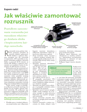 Warsztaty Expom radzi Jak właściwie zamontować rozrusznik sprawdź stan przewodów instalacji elektrycznej Prawidłowe zamontowanie rozrusznika jest warunkiem właściwego działania silnika i bezpieczeństwa każdego samochodu. R ozruszniki muszą spełniać określone parametry potrzebne do rozruchu silników spalinowych. Dla silników z zapłonem iskrowym wymagane jest, aby rozruszniki w temperaturze -20°C pozwoliły na osiągnięcie minimalnej prędkości obrotowej silnika w granicach 60-90 obrotów na minutę. Dla silników z zapłonem samoczynnym są to prędkości wyższe, bo dochodzące do 200 obrotów na minutę. Rozrusznik może być montowany tylko do sprawnej instalacji elektrycznej pojazdu. Przy montażu należy bezwzględnie przestrzegać podstawowych zasad BHP oraz zaleceń producenta pojazdu. Przed montażem trzeba sprawdzić instalację elektryczną pojazdu, najlepiej w autoryzowanym zakładzie elektrotechniki pojazdowej. Chodzi o to, by wykluczyć przyczynę uszkodzenia rozrusznika z powodu złego stanu instalacji elektrycznej pojazdu. Trzeba zwrócić uwagę na prawidłowe podłączenie przewodu masowego, bez którego nie jest możliwe właściwe działanie rozrusznika. Złe podłączenie tego przewodu w najlepszym przypadku może objawiać się spadkiem mocy rozrusznika, a w najgorszym spowodować pożar pojazdu. dokręć śruby mocujące właściwym momentem obrotowym w przypadku VW, Audi i pochodnych wymień dodatkową tulejkę obudowy sprzęgła • • • • • Aby przeprowadzić właściwą instalację rozrusznika należy: • • • Wszelkie prace w instalacji elektrycznej przeprowadzać przy odłączonym sprawdź stan zębów wieńca zębatego wyeliminuj ewentualne przecieki oleju do komory sprzęgła biegunie masowym akumulatora. momentem obrotowym wskazanym Odłączenia akumulatora należy doprzez producenta pojazdu. konać przy wyłączonym zapłonie. • Podłączyć złącza elektryczne oraz Przed montażem należy wyczyścić zabezpieczyć je wazeliną techniczi odtłuścić przyłącza instalacji elekną i odpowiednimi uszczelnieniami trycznej pojazdu podłączanej do rozochronnymi w zależności od typu rusznika. Ślady korozji należy usunąć rozrusznika oraz pojazdu. mechanicznie. • Podłączyć biegun masowy akumulaSprawdzić sprawność akumulatora tora. – najlepiej przeznaczonym do tego celu próbPodłączenie nikiem. Taki test poelektr yczne UWAGA! winno przeprowadzać rozruszni1. Prace wykonaj przy odłączonym biesię pod obciążeniem. ka musi być gunie masowym akumulatora Napięcie na zaciskach pewne. Jeżeli 2. Sprawdź stan akumulatora akumulatora bez obciąpodłączenie żenia powinno mieścić akumulatosię w zakresie 12,6 do 12,7 V. ra jest luźne lub przerwane, spowoduje W przypadku samochodów VW, to przepięcie mogące uszkodzić instalację Audi i pochodnych marek trzeba wyelektryczną pojazdu. Błędne podłączemienić dodatkową tulejkę montowanie przewodów rozrusznika (zwłaszcza ną w obudowie sprzęgła. głównego przewodu prądowego) spowoSprawdzić stan zębów wieńca zębateduje trwałe uszkodzenie instalacji elekgo, a w przypadku uszkodzeń, należy trycznej pojazdu. Firma EXPOM zaleca go przełożyć lub wymienić. wymianę rozrusznika w autoryzowanym Sprawdzić czystość komory sprzęgła. zakładzie elektrotechniki pojazdowej. Opiłki i brudy znajdujące się w koRegenerowane rozruszniki w firmie morze sprzęgła są częstą przyczyną EXPOM Kwidzyn Sp. z o.o. są dokładnie blokowania się zespołów sprzęgająprzetestowane za pomocą specjalistyczcych rozruszniki. nego stanowiska komputerowego kanaUsunąć ewentualne przecieki oleju dyjskiej firmy D&V Electronics. Wyrodo komory sprzęgła przed montażem by EXPOM-u posiadają 24-miesięczną rozrusznika. gwarancję oraz parametry techniczne Umieścić rozrusznik w miejscu moustalone przez oryginalnego producenta. (mie) cowania do silnika, dokręcić śruby Fota FORUM 27