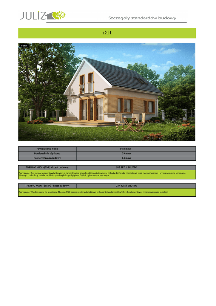 z211 Powierzchnia netto 94,8 mkw Powierzchnia użytkowa 79 mkw Powierzchnia zabudowy 64 mkw THERMO MIDI - (TMI) - koszt budowy: 188 387 zł BRUTTO Zakres prac: Budynek ocieplony i wytynkowany, z zamontowaną stolarką okienną i drzwiową, pokryty dachówką cementową wraz z orynnowanem i wymurowanymi kominami. Wewnątrz ocieplony ze ścianami i stropami wyłożonymi płytami OSB-3 i gipsowo-kartonowymi THERMO MAXI - (TMA) - koszt budowy: 237 425 zł BRUTTO Zakres prac: W odniesieniu do standardu Thermo Midi zakres zawiera dodatkowo wykonanie fundamentów/płyty fundamentowej i rozprowadzenie instalacji Porównanie kosztów ogrzewania budynku wykonanego w technologii szkieletu drewnianego JULIZ oraz budynku w technologii tradycyjnej według wymagań WT 2017 Projekt z211 Powierzchnia netto budynku 94,8 mkw Zapotrzebowanie na energię potrzebną do ogrzania budynku Budynek w technologii szkieletu drewnianego JULIZ Budynek w technologii tradycyjnej (wg wymagań WT2014) 50 kWh(m²rok) Rodzaj Ogrzewania koszt 1 kwh z jednostki opałowej 90 kWh(m²rok) Sprawność jednostki grzewczej % Roczne zapotrzebowanie energetyczne budynku z uwzględnieniem sprawności jednostki grzewczej Budynek w technologii tradycyjnej (kwh) Budynek w technologii szkieletowej JULIZ (kwh) Roczny koszt ogrzewania Budynek w technologii tradycyjnej Budynek w technologii szkieletowej JULIZ gaz ziemny - piec kondensacyjny 0,25 105% 8126 4514 2031 1129 gaz ziemny - piec zamknięta kom. spalania 0,25 90% 9480 5267 2370 1317 gaz płynny propan butan 0,43 90% 9480 5267 4076 2265 olej opałowy 0,34 92% 9274 5152 3153 1752 eko groszek 0,11 80% 10665 5925 1173 652 energia elektryczna 0,65 99% 8618 4788 5602 3112 pompa ciepła 0,65 400% 2133 1185 1386 770 Budynek w technologii tradycyjnej Budynek w technologii szkieletowej JULIZ 6000 5000 4000 3000 2000 1000 0 piec kondensacyjny gaz płynny olej opałowy eko groszek energia elektryczna pompa ciepła THERMO MIDI - TMI THERMO MAXI- TMA Tynk silikatowy – jeden kolor (bez boniowań i dodatkowych elementów dekoracyjnych) Podkład pod tynk wraz z siatką 1. Ściana zewnętrzna 2. Ściana wewnętrzna Izolacja termiczna styropian elewacyjny 150mm Płyta drewnopochodna OSB/MFP 12mm Konstrukcja drewniana z drewna iglastego KVH/C24 140mm Izolacja termiczna - wełna mineralna 0,037 W/(mK) 140mm Płyta drewnopochodna OSB/MFP 12mm Folia paroizolacyjna PE 0,2mm Płyta gipsowo-kartonowa (bez szpachlowania) 12,5mm Płyta gipsowo-kartonowa (bez szpachlowania) 12,5mm Płyta drewnopochodna OSB/MFP 12mm Konstrukcja drewniana z drewna iglastego KVH/C24 100mm Izolacja termiczna - wełna mineralna 0,037 W/(mK) 100mm Płyta drewnopochodna OSB/MFP 12mm Płyta gipsowo-kartonowa (bez szpachlowania) 12,5mm TMI TMA ▪ ▪ ▪ ▪ ▪ ▪ ▪ ▪ ▪ ▪ ▪ ▪ ▪ ▪ ▪ ▪ ▪ ▪ ▪ ▪ ▪ ▪ ▪ ▪ ▪ ▪ ▪ ▪ ▪ ▪ TMI Dachówka cementowa BRAAS 5. Dach pokrycie Obróbki blacharskie (w kolorze dachu) Rynny i rury spustowe PCV Podbitka drewniana impregnowana Dymowe prefabrykowane (piec c.o.) 6. Systemy kominowe Wentylacyjne prefabrykowane lub stalowe Ponad połacią dachową wykończonie tynkiem Okna PVC 5-komorowe z podwójnym przeszkleniem (U=1,0 W/m2K) w kolorze białym DRUTEX (rozwierno-uchylne) Parapety zewnętrzne stalowe w kolorach RAL Okna dachowe obrotowe z kołnierzem FAKRO 7. Stolarka okienna i drzwiowa Drzwi wejściowe drewniane antywyważeniowe CAL model Jagienka Brama garażowa segmentowa ocieplana w kolorze białym KRISPOL Drzwi zewnętrzne techniczne/garażowe białe HORMANN Schody strychowe - drewniane składane np FAKRO 3. Strop nad parterem Płyta drewnopochodna OSB/MFP 22mm Konstrukcja drewniana z drewna iglastego KVH/C24 200mm Folia paroizolacyjna PE 100mm Konstrukcja drewniana lub metalowa do 30mm zabudowy 4. Dach konstrukcja ▪ ▪ ▪ ▪ ▪ ▪ ▪ ▪ ▪ ▪ ▪ ▪ ▪ ▪ ▪ ▪ Płyta gipsowo-kartonowa (bez szpachlowania) 12,5mm Łaty dachowe 30mm Kontrłaty dachowe 30mm Mebrana wysokoparoprzepuszczalna trójwarstwowa 0,5mm Krokwie dachowe z drewna iglastego KVH/C24 200mm ▪ ▪ Izolacja termiczna - wełna mineralna 0,037 W/(mK) 200mm ▪ ▪ Konstrukcja systemowa do zabudowy płytami wypełniona wełną mineralną 0,037 W/(mK) gr 50mm 50mm ▪ ▪ Folia paroizolacyjna PE 0,2mm Płyta gipsowo-kartonowa (bez szpachlowania) 12,5mm ▪ ▪ ▪ ▪ TMA ▪ ▪ ▪ ▪ ▪ ▪ ▪ ▪ ▪ ▪ ▪ ▪ ▪ ▪ ▪ ▪ ▪ ▪ ▫ ▫ ▪ ▪ ▪ ▪ ▪ ▫ ▫ ▪ 8. Instalacja Elektryczna Pokój dzienny, kuchnia 4 szt - podwójne gniazdka , 2 szt - punkty oświetleniowe wraz z wyłacznikiem Sypialnia, gabinet 3 szt - podwójne gniazdka , 1 szt - punkt oświetleniowy wraz z wyłacznikiem Łazienka, WC, korytarz 1 szt - podwójne gniazdko , 1 szt - punkt oświetleniowy wraz z wyłacznikiem jadalnia, kotłownia 1 szt - podwójne gniazdko , 1 szt - punkt oświetleniowy wraz z wyłacznikiem klatka schodowa 1 szt - podwójne gniazdko , 1 szt - punkt oświetleniowy wraz z 2 wyłacznikami Rozprowadzenie instalacji elektrycznej od skrzynki bezpiecznikowej Zewnętrzny punkt oswietleniowy (balkon lub taras) 2 szt oraz punkt zasilający (ściana) - włącznik wewnątrz domu Gniazdo antenowe na parterze i poddaszu Gniazdo telefoniczne na parterze i poddaszu Dzwonek na korytarzu parteru Rozdzielnia RG nadtynkowa TMI TMA ▫ ▫ ▫ ▫ ▫ ▫ ▫ ▫ ▫ ▫ ▫ ▪ ▪ ▪ ▪ ▪ ▪ ▪ ▪ ▪ ▪ ▪ 12. Fundamenty Roboty ziemne Ławy żelbetowe Ściany fundamentowe z betonu lub bloczków betonowych zakończone wieńcem żelbetowym (do 110 cm) Izolacja termiczna pionowa fundamentu - styropian hydrofobowy - 10 cm Warstwa osłonowa z siatki z włókna szklanego zatopiona w masie klejowej Podsypka piaskowa zagęszczona mechanicznie ~15 cm Instalacja kanalizacji sanitarnej poziomu 0 Warstwa chudego betonu betonem B-10 gr. 10cm 13. Płyta fundamentowa* Roboty ziemne Podsypka piaskowa zagęszczona mechanicznie ~30 cm 9. Instalacja Gazowa instalacja gazowa wykonana w świetle k