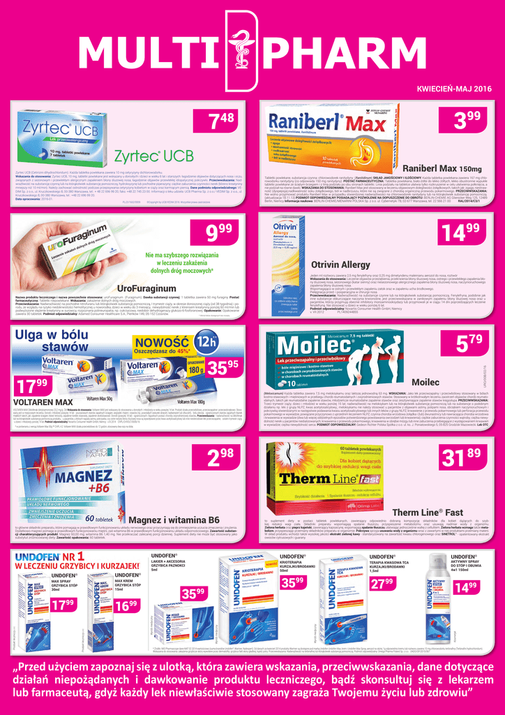 KWIECIEŃ-MAJ 2016 7 czynną lub ynę lub poerek (klirens ostrożność ży oraz kar- 3 48 © Copyright by UCB/VEDIM 2016. Wszystkie prawa zastrzeżone. . z o.o., ul. 99 20, faks: ma Sp. z o.o./ wa, tel.: +48 PL/ZI/1602/0009 PL/ZI/1602/0009 Raniberl Max 150mg Zyrtec UCB (Cetirizini dihydrochloridum). Każda tabletka powlekana zawiera 10 mg cetyryzyny dichlorowodorku. Zyrtec UCB (Cetirizini dihydrochloridum). Każda tabletka powlekana zawiera 10 mg cetyryzyny dichlorowodorku. Wskazania do stosowania: Zyrtec UCB, 10 mg, tabletki powleWskazania do stosowania: Zyrtec UCB, 10 mg, tabletki powlekane jest wskazany u dorosłych i dzieci w wieku 6 lat i starszych: łagodzenie objawów dotyczących nosa i oczu, kane jest wskazany u dorosłych i dzieci w wieku 6 lat i starszych: łagodzenie objawów nosa i oczu, związanych z sezwiązanych z sezonowym i przewlekłym alergicznym zapaleniem błony śluzowej nosa;dotyczących łagodzenie objawów przewlekłej idiopatycznej pokrzywki. Przeciwwskazania: Nadzonowym i przewlekłym alergicznym zapaleniem błony śluzowej wrażliwość na substancję czynną lub na którąkolwiek substancję pomocniczą, lub pochodne piperazyny; ciężkie zaburzenia czynności nerek (klirens kreatyniny nosa; hydroksyzynę łagodzenie objawów przewlekłej idiopatycznej pokrzywki. ką, która zawiera wskazania, przeciwwskazania, dane dotyczące działań niż 10 ml/min). Należy zachować ostrożność podczas przepisywania cetyryzyny kobietom w ciąży oraz Przeciwwskazania: Nadwrażliwość na substancję czynną lub karmiącym piersią. Dane podmiotu odpowiedzialnego: VEnformacje mniejszy dotyczące stosowania produktu leczniczego, bądź skonsultuj na którąkolwiek substancję pomocniczą, hydroksyzynę lub poDIM Sp. z o.o., ul. Kruczkowskiego 8, 00-380 Warszawa, tel.: + 48 22 696 99 20, faks: +48 22 745 23 00. Informacji o leku udziela: UCB Pharma Sp. z o.o./ VEDIM Sp. z o.o., ul. każdy lek niewłaściwie stosowany zagraża Twojemu życiu lub zdrowiu. chodne piperazyny; ciężkie zaburzenia czynności nerek (klirens kreatyniny mniejszy niż 10 ml/min). Należy zachować ostrożność Kruczkowskiego 8, 00-380 Warszawa, tel.: +48 22 696 99 20. podczas przepisywania cetyryzyny kobietom w ciąży oraz karmiącym piersią. Data opracowania: 2016-01. ©Copyright by UCB/VEDIM 2016. Wszystkie prawa zastrzeżone. Dane podmiotu odpowiedzialnego: : VEDIM Sp. z o.o., ul. Kruczkowskiego 8, 00-380 Warszawa, tel.: + 48 22 696 99 20, faks: +48 22 745 23 00. Informacji o leku udziela: UCB Pharma Sp. z o.o./ VEDIM Sp. z o.o., ul. Kruczkowskiego 8, 00-380 Warszawa, tel.: +48 22 696 99 20. Data opracowania: 2016-01. 9 Tabletki powlekane, substancja czynna: chlorowodorek ranitydyny (Ranitidinum) SKŁAD JAKOŚCIOWY I ILOŚCIOWY: Każda tabletka powlekana zawiera 167 mg chlorowodorku ranitydyny (co odpowiada 150 mg ranitydyny). POSTAĆ FARMACEUTYCZNA: Tabletka powlekana, biało-żółte do lekko żółtych, lekko obustronnie wypukłe tabletki powlekane ze ściętym brzegiem i z linią podziału po obu stronach tabletki. Linia podziału na tabletce ułatwia tylko rozkruszenie w celu ułatwienia połknięcia, a nie podział na równe dawki. WSKAZANIA DO STOSOWANIA: Raniberl Max jest stosowany w leczeniu objawowym dolegliwości żołądkowych, takich jak: zgaga, niestrawność (dyspepsja),nadkwaśność soku żołądkowego, ból w nadbrzuszu, które nie są związane z chorobą organiczną przewodu pokarmowego. PRZECIWWSKAZANIA: Nie wolno przyjmować produktu Raniberl Max w przypadku stwierdzonej nadwrażliwości na chlorowodorek ranitydyny lub na którąkolwiek substancję pomocniczą. (aktualizacja 18.11.13) PODMIOT ODPOWIEDZIALNY POSIADAJĄCY POZWOLENIE NA DOPUSZCZENIE DO OBROTU: BERLIN-CHEMIE AG Glienicker Weg 125, 12489 Berlin, Niemcy Informacja naukowa: BERLIN-CHEMIE/MENARINI POLSKA Sp. z o.o. ul. Cybernetyki 7B, 02-677 Warszawa, tel. 22 566 21 00 RAL/2014/C3/1 14 99 Przed użyciem zapoznaj się z ulotką, która zawiera wskazania, przeciwwskazania, dane dotyczące działań niepożądanych i dawkowanie oraz informacje dotyczące stosowania produktu leczniczego, bądź skonsultuj się z lekarzem lub farmaceutą, gdyż każdy lek niewłaściwie stosowany zagraża Twojemu życiu lub zdrowiu. Nie ma szybszego rozwiązania w leczeniu zakażenia dolnych dróg moczowych* Jeden ml roztworu zawiera 2,5 mg fenylefryny oraz 0,25 mg dimetyndenu maleinianu aerozol do nosa, roztwór Wskazania do stosowania: Leczenie objawów przeziębienia, przekrwienia błony śluzowej nosa, ostrego i przewlekłego zapalenia błony śluzowej nosa, sezonowego (katar sienny) oraz niesezonowego alergicznego zapalenia błony śluzowej nosa, naczynioruchowego zapalenia błony śluzowej nosa. Wspomagająco w ostrym i przewlekłym zapaleniu zatok oraz w zapaleniu ucha środkowego. Pielęgnacja przed- i pooperacyjna w chirurgii nosa. Przeciwwskazania: Nadwrażliwość na substancje czynne lub na którąkolwiek substancję pomocniczą. Fenylefryna, podobnie jak inne substancje obkurczające naczynia krwionośne, jest przeciwwskazana w zanikowym zapaleniu błony śluzowej nosa oraz u pacjentów, którzy przyjmują obecnie inhibitory monoaminooksydazy lub przyjmowali je w ciągu 14 dni poprzedzających leczenie fenylefryną. Nie stosować u dzieci w wieku poniżej 6 lat. Podmiot odpowiedzialny: Novartis Consumer Health GmbH, Niemcy v. VII.2012 PL1409244855 Nazwa produktu leczniczego i nazwa powszechnie stosowana: uroFuraginum (Furaginum). Dawka substancji czynnej: 1 tabletka zawiera 50 mg furaginy. Postać farmaceutyczna: Tabletki niepowlekane. Wskazania: zakażenie dolnych dróg moczowych. Przeciwskazania: Nadwrażliwość na pochodne nitrofuranu lub którąkolwiek substancję pomocniczą, I trymestr ciąży, w okresie donoszonej ciąży (od 38 tygodnia) i porodu, ze względu na ryzyko niedokrwistości hemolitycznej u noworodka, dzieci w wieku do 3 miesięcy, niewydolność nerek z klirensem kreatyniny poniżej 60 ml/min lub 