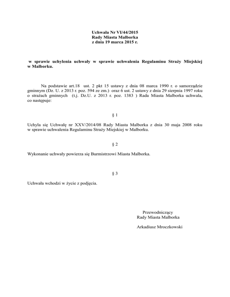 Uchwała Nr VI/44/2015 Rady Miasta Malborka z dnia 19 marca