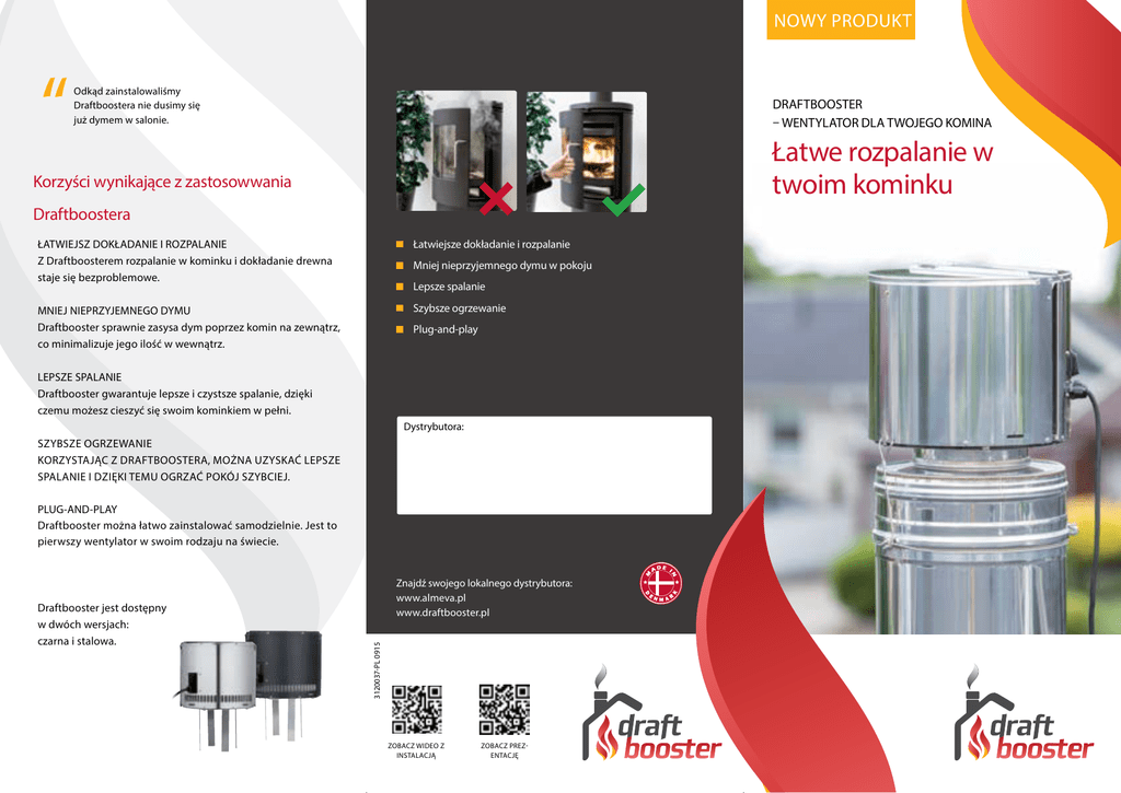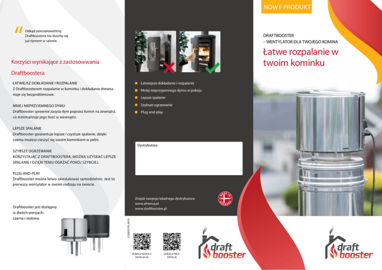 NOWY NYHED PRODUKT “ Odkąd zainstalowaliśmy Draftboostera nie dusimy się już dymem w salonie. DRAFTBOOSTER – WENTYLATOR DLA TWOJEGO KOMINA Łatwe rozpalanie w twoim kominku Korzyści wynikające z zastosowwania Draftboostera ŁATWIEJSZ DOKŁADANIE I ROZPALANIE Z Draftboosterem rozpalanie w kominku i dokładanie drewna staje się bezproblemowe. Łatwiejsze dokładanie i rozpalanie MNIEJ NIEPRZYJEMNEGO DYMU Draftbooster sprawnie zasysa dym poprzez komin na zewnątrz, co minimalizuje jego ilość w wewnątrz. Szybsze ogrzewanie Mniej nieprzyjemnego dymu w pokoju Lepsze spalanie Plug-and-play LEPSZE SPALANIE Draftbooster gwarantuje lepsze i czystsze spalanie, dzięki czemu możesz cieszyć się swoim kominkiem w pełni. Dystrybutora: SZYBSZE OGRZEWANIE KORZYSTAJĄC Z DRAFTBOOSTERA, MOŻNA UZYSKAĆ LEPSZE SPALANIE I DZIĘKI TEMU OGRZAĆ POKÓJ SZYBCIEJ. PLUG-AND-PLAY Draftbooster można łatwo zainstalować samodzielnie. Jest to pierwszy wentylator w swoim rodzaju na świecie. 3120037-PL 0915 Draftbooster jest dostępny w dwóch wersjach: czarna i stalowa. Znajdź swojego lokalnego dystrybutora: www.almeva.pl www.draftbooster.pl ZOBACZ WIDEO Z INSTALACJĄ ZOBACZ PREZENTACJĘ Draftbooster jest łatwy w instalacji na twoim kominie. Ułatwia rozpalanie ognia i dobre spalania w zamkniętych kominkach opalanych drewnem. Tworzy idealne warunki, szczególnie podczas pierwszego uruchomienia, gdy ciąg kominowy jest ograniczony. “ Draftbooster zmniejsza ilość dymu przedostającą się Z Draftboosterem rozpalanie w kominku i dokładanie drewna staje się bezproblemowe. do pomieszczenia, gdy drzwi pieca są otwarte podczas dokładania. Z Draftboosterem uzyskasz pełną satysfakcję z korzystania ze swojego kominka. Fakty na temat Draftboostera Czemu wybrać Draftboostera? Trudności z rozpalaniem biorą się zazwyczaj z niewystarczającego ciągu kominowego. Draftbooster wytwarza ciąg kominowy, który sprawia, że rozpalanie staje się dziecinnie prostą czynnością. Ciąg kominowy jest wytwarzany w wyniku różnicy temperatur pomiędzy: wysoką temperaturą komina, a niższą na zewnątrz. W trakcie rozpalania komin jest zwykle zimny, a ciąg przez to ograniczony, co znacznie utrudnia rozpalanie, więc często trzeba się wspomagać otwieraniem szeroko drzwiczek kominka i wpuszczaniem dymu do salonu. Ważne jest, aby kawałki drewna używane do rozpalania były suche i dostatecznie małe. W ten sposób ogień obejmie szybciej drewno i wytworzy się ciepło potrzebne do właściwego ciągu kominowego. KIEDY UŻYWAĆ DRAFTBOOSTER? Kiedy masz problemy z rozpalaniem w kominku, dym przedostaje się do pokoi, a na szybie jest pełno sadzy to powodem tego jest niedostateczny ciąg kominowy – twoim rozwiązaniem w takim przypadku jest Draftbooster. GDZIE MOŻE BYĆ UŻYWANY DRAFTBOOSTER? Na kominach z niewystarczającym ciągiem kominowym zarówno stalowych, jak i wykonanych z cegły o maksymalnej średnicy Ø220 mm. DO JAKIEGO TYPU URZĄDZEŃ MOŻE BYĆ UŻYWANY? Draftbooster może być używany do zamkniętych kominków opalanych drewnem. JAK SIĘ GO PODŁĄCZA? Draftbooster może być podłączony do standardowego gniazdka z uziemieniem i włączany za pomocą pilota dołączonego do zestawu. “ Kiedyś to było trudne zadanie – uzyskanie odpowiedniejgo ciągu w kominie i rozpalenie ognia; teraz wystarczy nacisnąć przycisk na pilocie. Kiedy w kominku rozpali się na dobre to Draftboostera można wyłączyć, a jeśli to konieczne, ponownie włączyć podczas dokładania.