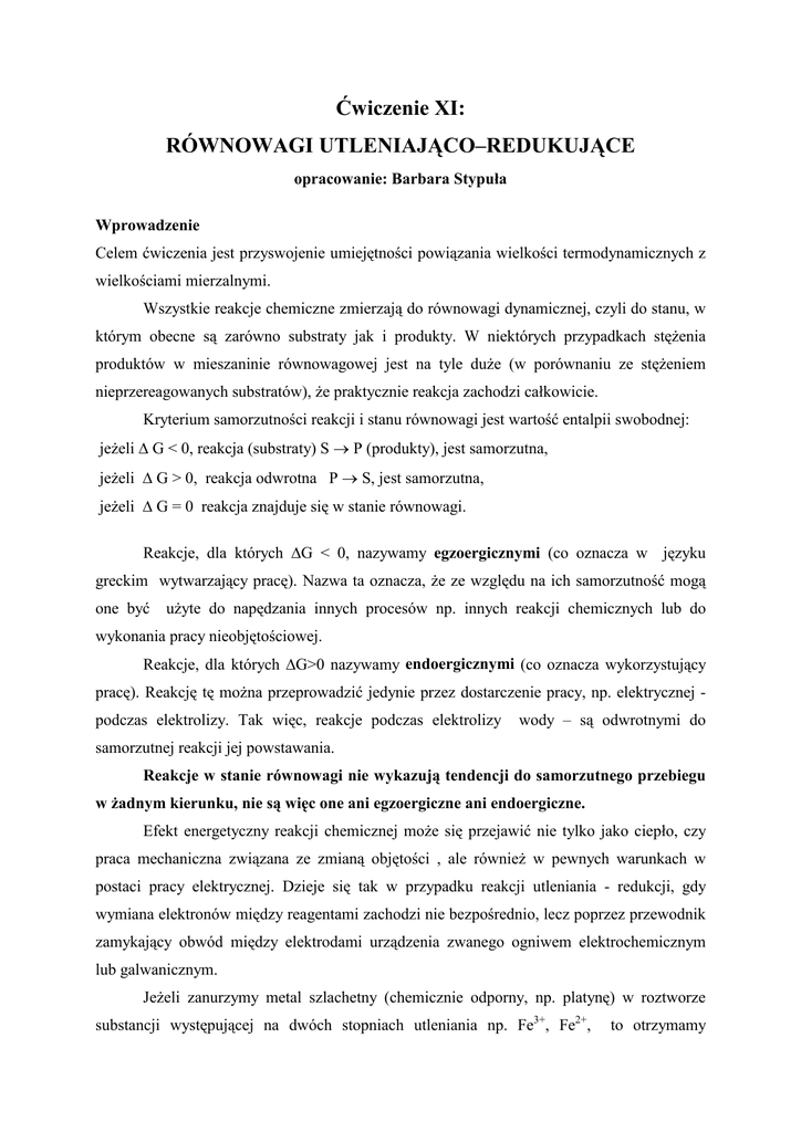 Ćwiczenie XI: RÓWNOWAGI UTLENIAJĄCO–REDUKUJĄCE opracowanie: Barbara Stypuła Wprowadzenie Celem ćwiczenia jest przyswojenie umiejętności powiązania wielkości termodynamicznych z wielkościami mierzalnymi. Wszystkie reakcje chemiczne zmierzają do równowagi dynamicznej, czyli do stanu, w którym obecne są zarówno substraty jak i produkty. W niektórych przypadkach stężenia produktów w mieszaninie równowagowej jest na tyle duże (w porównaniu ze stężeniem nieprzereagowanych substratów), że praktycznie reakcja zachodzi całkowicie. Kryterium samorzutności reakcji i stanu równowagi jest wartość entalpii swobodnej: jeżeli ∆ G < 0, reakcja (substraty) S → P (produkty), jest samorzutna, jeżeli ∆ G > 0, reakcja odwrotna P → S, jest samorzutna, jeżeli ∆ G = 0 reakcja znajduje się w stanie równowagi. Reakcje, dla których ∆G < 0, nazywamy egzoergicznymi (co oznacza w języku greckim wytwarzający pracę). Nazwa ta oznacza, że ze względu na ich samorzutność mogą one być użyte do napędzania innych procesów np. innych reakcji chemicznych lub do wykonania pracy nieobjętościowej. Reakcje, dla których ∆G>0 nazywamy endoergicznymi (co oznacza wykorzystujący pracę). Reakcję tę można przeprowadzić jedynie przez dostarczenie pracy, np. elektrycznej podczas elektrolizy. Tak więc, reakcje podczas elektrolizy wody – są odwrotnymi do samorzutnej reakcji jej powstawania. Reakcje w stanie równowagi nie wykazują tendencji do samorzutnego przebiegu w żadnym kierunku, nie są więc one ani egzoergiczne ani endoergiczne. Efekt energetyczny reakcji chemicznej może się przejawić nie tylko jako ciepło, czy praca mechaniczna związana ze zmianą objętości , ale również w pewnych warunkach w postaci pracy elektrycznej. Dzieje się tak w przypadku reakcji utleniania - redukcji, gdy wymiana elektronów między reagentami zachodzi nie bezpośrednio, lecz poprzez przewodnik zamykający obwód między elektrodami urządzenia zwanego ogniwem elektrochemicznym lub galwanicznym. Jeżeli zanurzymy metal szlachetny (chemicznie odporny, np. platynę) w roztworze substancji występującej na dwóch stopniach utleniania np. Fe3+, Fe2+, to otrzymamy półogniwo (elektrodę utleniająco – redukującą) lub inaczej, elektrodę redoks. Potencjał utleniająco - redukujący tej elektrody jest siłą elektromotoryczną ogniwa, SEM, w którym drugą elektrodą będzie normalna elektroda wodorowa PtH2 ( p H 2 = 1013hPa, a H+ = 1)Fe2+ Fe3+Pt Na elektrodach powyższego ogniwa zachodzi reakcja: Fe3+ + e → Fe2+ H+ + e → ½ H2 Sumaryczna reakcja przebiega według równania: Fe3+ + ½ H2 → Fe2+ + H+ Zgodnie z konwencją sztokholmską definiujemy potencjał półogniwa jako siłę elektromotoryczną (SEM) ogniwa zbudowanego w ten sposób, że prawym półogniwem jest w nim rozważana elektroda, a lewym - standardowa elektroda wodorowa Zgodnie z tą konwencją siła elektromotoryczna ogniwa wynosi: SEM = E 0 + RT a utl ln zF a red 1 2 a 3+ ⋅ a H Fe 0 RT 2 SEM = E + ln zF a 2 + ⋅ a H+ Fe Jeżeli półogniwo wodorowe jest normalne tzn. ciśnienie cząstkowe wodoru równe jest 1atm. (101325 Pa) i aktywność jonów wodorowych w roztworze jest równa jedności (aH+ = 1), wówczas: RT a Fe3+ E Fe2+ Fe3+ = SEM = E 0 + ln zF a 2+ Fe gdzie: E0 – potencjał standardowy elektrody redoks (półogniwa: Fe2+ Fe3+Pt). Przy równych aktywnościach formy utlenionej i zredukowanej, potencjał elektrody redoks E Fe2 + Fe3+ jest równy potencjałowi standardowemu. E 0 Fe2 + Fe3+ . Jeżeli powinowactwo danej reakcji utleniania – redukcji, napisanej w formie: utleniacz + ze → reduktor jest większa niż dla reakcji : H+ + e → ½ H2, to potencjał normalny pierwszej reakcji połówkowej jest większy od zera. W odwrotnym przypadku przypisujemy potencjał reakcji ujemny. Pierwiastki (metale i niemetale) oraz jony, uszeregowane od najniższego do najwyższego potencjału normalnego, tworzą tzn. szereg elektrochemiczny pierwiastków. Wartości potencjałów normalnych reakcji pozwalają przewidzieć w którym kierunku będzie przebiegać dana reakcja utleniania – redukcji. Utleniacz należący do pary, utleniacz-reduktor, o wyższym potencjale, spowoduje utlenienie reduktora należącego do pary o niższym potencjale. np. jony ceru Ce4+ należące do pary Ce4+/Ce3+o potencjale normalnym: E 0 Ce 4 + Ce3+ = 1,61V , spowoduje utlenienie reduktora Fe2+, należącego do pary Fe3+/Fe2+, o potencjale normalnym E 0 Fe3+ Fe2 + W ten sam sposób możemy również przewidzieć, że wolny chlor ( E 01 utleni jony bromkowe do wolnego bromu ( E 01 2 Br2 Br − 2 Cl 2 Cl − = +0,78V . = +1,36V ), = +1,09V ). Umowy dotyczące znaków elektrod W zasadzie do obliczeń elektrochemicznych wystarcza obecnie przyjęta konwencja sztokholmska, jednakże znajomość założeń, funkcjonującej w literaturze elektrochemicznej, konwencji europejskiej i amerykańskiej, pozwala na korzystanie z wielu dobrych i starszych podręczników. Według konwencji europejskiej, elektrodzie przypisuje się potencjał mierzony eksperymentalnie względem elektrody wodorowej. Elektroda cynkowa uzyskuje w roztworze jonów cynku ładunek ujemny i jej potencjał normalny wynosi: E0 = -0,763V, niezależnie od tego czy połówkową reakcję elektrodową napiszemy w formie utleniania: czy w formie redukcji: Zn → Zn2+ + 2e Zn2+ + 2e → Zn Równanie Nernsta w konwencji europejskiej wyraża się zwykle w postaci sumy potencjału normalnego i członu uwzględniającego aktywność (stężenie) formy utlenionej i zredukowanej E = E0 + RT [utl] ln zF [red] dla elektrody cynkowej ZnZn2+: E = E0 + RT ln[Zn 2+ ] zF W konwencji amerykańskiej czynnikiem decydującym o znaku elektrody jest kierunek w jakim samorzutnie dana reakcja przebiega. Jeśli reakcja: Zn → Zn2+ + 2e przebiega samorzutnie od strony lewej ku prawej, to zmiana entalpii swobodnej musi mieć wartość ujemną: ∆G0 = –zFE0 ponieważ z i F mają znak dodatni,