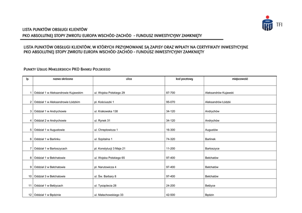 LISTA PUNKTÓW OBSŁUGI KLIENTÓW PKO ABSOLUTNEJ STOPY ZWROTU EUROPA WSCHÓD-ZACHÓD – FUNDUSZ INWESTYCYJNY ZAMKNIĘTY LISTA PUNKTÓW OBSŁUGI KLIENTÓW, W KTÓRYCH PRZYJMOWANE SĄ ZAPISY ORAZ WPŁATY NA CERTYFIKATY INWESTYCYJNE PKO ABSOLUTNEJ STOPY ZWROTU EUROPA WSCHÓD-ZACHÓD – FUNDUSZ INWESTYCYJNY ZAMKNIĘTY PUNKTY U SŁUG MAKLERSKICH PKO BANKU POLSKIEGO lp. nazwa skrócona ulica kod pocztowy miejscowość 1 Oddział 1 w Aleksandrowie Kujawskim ul. Wojska Polskiego 29 87-700 Aleksandrów Kujawski 2 Oddział 1 w Aleksandrowie Łódzkim pl. Kościuszki 1 95-070 Aleksandrów Łódzki 3 Oddział 1 w Andrychowie ul. Krakowska 138 34-120 Andrychów 4 Oddział 2 w Andrychowie ul. Rynek 31 34-120 Andrychów 5 Oddział 1 w Augustowie ul. Chreptowicza 1 16-300 Augustów 6 Oddział 1 w Barlinku ul. Szpitalna 1 74-320 Barlinek 7 Oddział 1 w Bartoszycach pl. Konstytucji 3 Maja 21 11-200 Bartoszyce 8 Oddział 1 w Bełchatowie ul. Wojska Polskiego 65 97-400 Bełchatów 9 Oddział 2 w Bełchatowie pl. Narutowicza 4 97-400 Bełchatów 10 Oddział 3 w Bełchatowie ul. Św. Barbary 8 97-400 Bełchatów 11 Oddział 1 w Bełżycach ul. Tysiąclecia 28 24-200 Bełżyce 12 Oddział 1 w Będzinie ul. Małachowskiego 33 42-500 Będzin 13 Oddział 1 w Białej Piskiej ul. Mickiewicza 8/1 12-230 Biała Piska 14 Oddział 1 w Białej Podlaskiej ul. Brzeska 27 21-500 Biała Podlaska 15 Oddział 2 w Białej Podlaskiej ul. Sidorska 23 21-500 Biała Podlaska 16 Oddział 3 w Białej Podlaskiej ul. Terebelska 60 C 21-500 Biała Podlaska 17 Oddział 4 w Białej Podlaskiej ul. Piłsudskiego 13 21-500 Biała Podlaska 18 Oddział 1 w Białych Błotach ul. Szubińska 87B 86-005 Białe Błota 19 Oddział 1 w Białogardzie pl. Wolności 17 78-200 Białogard 20 Oddział 1 w Białymstoku Rynek Kościuszki 16 15-426 Białystok 21 Oddział 2 w Białymstoku ul. Bolesława Chrobrego 2 15-057 Białystok 22 Oddział 10 w Białymstoku ul. Broniewskiego 4 15-748 Białystok 23 Oddział 11 w Białymstoku ul. Berlinga 14 A 15-814 Białystok 24 Oddział 12 w Białymstoku ul. Lipowa 31/33 15-424 Białystok 25 Oddział 13 w Białymstoku al. 1000-lecia Państwa Polskiego 10 15-111 Białystok 26 Oddział 3 w Białymstoku ul. Witosa 32 15-662 Białystok 27 Oddział 4 w Białymstoku ul. Swobodna 25 15-756 Białystok 28 Oddział 5 w Białymstoku ul. Mickiewicza 32 15-232 Białystok 29 Oddział 6 w Białymstoku ul. Komisji Edukacji Narodowej 48 15-687 Białystok 30 Oddział 7 w Białymstoku ul. Szarych Szeregów 7 15-666 Białystok 31 Oddział 8 w Białymstoku ul. Pułaskiego 69 15-337 Białystok 32 Oddział 9 w Białymstoku ul. Waszyngtona 34 15-305 Białystok 33 Oddział 14 w Białymstoku ul. Malmeda 7 15-440 Białystok 34 Oddział 1 w Bielanach Wrocławskich ul. Czekoladowa 9 55-075 Bielany Wrocławskie 35 Oddział 1 w Bielawie ul. Jana III Sobieskiego 17 58-260 Bielawa 36 Oddział 1 w Bielsku Podlaskim ul. Mickiewicza 54 17-100 Bielsk Podlaski 37 Oddział 1 w Bielsku Białej ul. 11 listopada 15 43-300 Bielsko-Biała 38 Oddział 2 w Bielsku Białej ul. Piastowska 15 43-300 Bielsko-Biała 39 Oddział 3 w Bielsku Białej ul. Grunwaldzka 41 43-300 Bielsko-Biała 40 Oddział 4 w Bielsku Białej ul. Jutrzenki 22 43-300 Bielsko-Biała 41 Oddział 5 w Bielsku Białej ul. 1 Maja 17 43-300 Bielsko-Biała 42 Oddział 6 w Bielsku Białej ul. Doliny Miętusiej 3 43-316 Bielsko-Biała 43 Oddział 7 w Bielsku Białej ul. Cieszyńska 390 43-382 Bielsko-Biała 44 Oddział 8 w Bielsku Białej ul. 11 Listopada 10 43-300 Bielsko-Biała 45 Oddział 1 w Bieruniu ul. Granitowa 8 43-155 Bieruń 46 Oddział 2 w Bieruniu ul. Chemików 3 43-150 Bieruń 47 Oddział 1 w Bierutowie ul. Wrocławska 3 56-420 Bierutów 48 Oddział 1 w Biłgoraju ul. Ogrodowa 14 23-400 Biłgoraj 49 Oddział 2 w Biłgoraju ul. Kościuszki 73 23-400 Biłgoraj 50 Oddział 1 w Biskupcu ul. Niepodległości 15 11-300 Biskupiec 51 Oddział 1 w Blachowni ul. Bankowa 1 42-290 Blachownia 52 Oddział 1 w Błoniu ul. 3 Maja 5 05-870 Błonie 53 Oddział 1 w Bobolicach pl. Zwycięstwa 8 76-020 Bobolice 54 Oddział 1 w Bochni ul. Trudna 13 32-700 Bochnia 55 Oddział 1 w Bogatyni ul. II Armii WP 1 59-920 Bogatynia 56 Oddział 1 w Boguszowie-Gorcach ul. M. Fornalskiej 11 58-370 Boguszów-Gorce 57 Oddział 1 w Bolesławcu ul. Sierpnia 80 16 59-700 Bolesławiec 58 Oddział 1 w Bolkowie ul. Niepodległości 1 59-420 Bolków 59 Oddział 1 w Braniewie ul. Gdańska 10 14-500 Braniewo 60 Oddział 1 w Brodnicy ul. Mostowa 2 87-300 Brodnica 61 Oddział 2 w Brodnicy ul. Wyspiańskiego 10 87-300 Brodnica 62 Oddział 1 w Brwinowie ul. Rynek 26 05-840 Brwinów 63 Oddział 1 w Brzegu ul. Bolesława Chrobrego 33 49-300 Brzeg 64 Oddział 1 w Brzegu Dolnym ul. Rynek 10 56-120 Brzeg Dolny 65 Oddział 1 w Brzesku pl. Żwirki i Wigury 6 32-800 Brzesko 66 Oddział 2 w Brzesku ul. Kościuszki 2 32-800 Brzesko 67 Oddział 1 w Brzezinach ul. Sienkiewicza 9 95-060 Brzeziny 68 Oddział 1 w Brzozowie ul. Kazimierzowska 1 36-200 Brzozów 69 Oddział 1 w Buku ul. Dworcowa 46 64-320 Buk 70 Oddział 1 w Busku Zdroju pl. Zwycięstwa 18 28-100 Busko-Zdrój 71 Oddział 1 w Bychawie ul. J. Piłsudskiego 20 23-100 Bychawa 72 Oddział 1 w Bydgoszczy ul. Gdańska 23 85-005 Bydgoszcz 73 Oddział 2 w Bydgoszczy ul. Stary Port 1 - 3 85-950 Bydgoszcz 74 Oddział 10 w Bydgoszczy ul. Planu 6-Letniego 54 85-806 Bydgoszcz 75 Oddział 11 w Bydgoszczy ul. Skłodowskiej-Curie 33 85-088 Bydgoszcz 76 Oddział 12 w Bydgoszczy ul. Powalisza 4A 85-791 Bydgoszcz 77 Oddział 13 w Bydgoszczy ul. Gałczyńskiego 17 85-316 Bydgoszcz 78 Oddział 14 w Bydgoszczy ul. Twardzickiego 12 85-791 Bydgoszcz 79 Oddział 15 w Bydgoszczy ul. Skłodowskiej-Curie 26 85-094 Bydgoszcz 80 Oddział 16 w Bydgoszczy ul. Kormoranów 12A 85-432 Bydgoszcz 81 Oddział 17 w Bydgoszczy ul. Swobodna 16 85-791 Bydgoszcz 82 Oddział 18 w Bydgoszczy ul. Gdańska 76 85-021 Bydgoszcz 83 Oddział 3 w Bydgoszczy ul. Powstańców Śląskich 9/1 85-665 Bydgoszcz 84 Oddział 4 w Bydgoszczy ul. Sułk