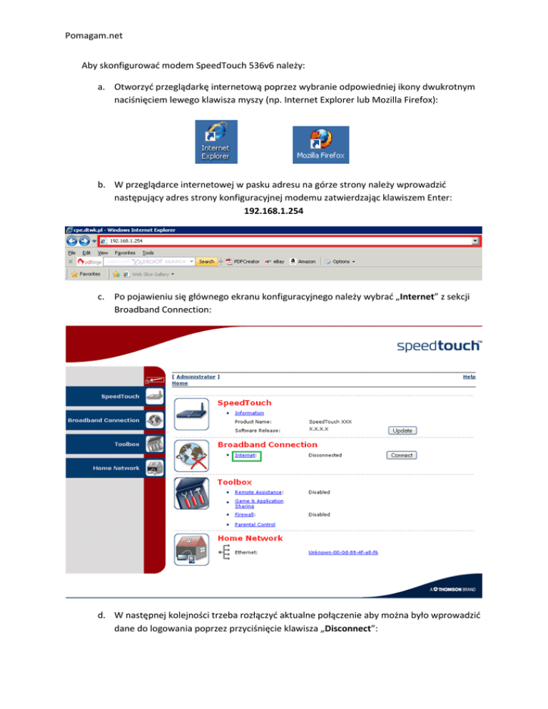 Pomagam.net Aby skonfigurować modem SpeedTouch 536v6 należy: a. Otworzyć przeglądarkę internetową poprzez wybranie odpowiedniej ikony dwukrotnym naciśnięciem lewego klawisza myszy (np. Internet Explorer lub Mozilla Firefox): b. W przeglądarce internetowej w pasku adresu na górze strony należy wprowadzić następujący adres strony konfiguracyjnej modemu zatwierdzając klawiszem Enter: 192.168.1.254 c. Po pojawieniu się głównego ekranu konfiguracyjnego należy wybrać „Internet” z sekcji Broadband Connection: d. W następnej kolejności trzeba rozłączyć aktualne połączenie aby można było wprowadzić dane do logowania poprzez przyciśnięcie klawisza „Disconnect”: Pomagam.net e. Po rozłączeniu w pole „Username” wpisujemy swój unikalny login oraz hasło w pole „Password” zatwierdzając poprzez naciśnięcie „Connect”: Urządzenie zostało poprawnie skonfigurowane, po kilkunastu sekundach nastąpi połączenie z Internetem.