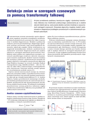 Pomiary Automatyka Robotyka 12/2009 Detekcja zmian w szeregach czasowych za pomocą transformaty falkowej Artykuł przedstawia podstawy teoretyczne ciągłej i dyskretnej transformaty falkowej oraz możliwości praktycznego zastosowania jej w analizie zdarzeń (takich jak np. wykrywanie skoków wartości średniej) w zaszumionych szeregach czasowych. Omawiane algorytmy mogłyby znaleźć zastosowanie w diagnostyce przebiegów procesowych w zaawansowanych systemach automatyki. Maciej Klemiato aawansowane systemy automatyki, oprócz algorytmów regulacji, systemów wizualizacji i archiwizacji danych pomiarowych, powinny być także wyposażone w moduły diagnostyczne. Moduły te pełnią rolę nadzorcy procesu przemysłowego, diagnozując sprawność systemu sterowania i jego poszczególnych elementów, takich jak czujniki, człony wykonawcze czy magistrale komunikacyjne. Jednym z podstawowych elementów systemów diagnostycznych jest analiza zdarzeń w szeregach zmiennych procesowych. Przykładem takiej analizy jest segmentacja szeregów czasowych umożliwiająca wykrycie okresów stacjonarności (stanów ustalonych), skoków wartości średniej lub wariancji. Jednym z podstawowych narzędzi do analizy zdarzeń w szeregach czasowych jest algorytm Page-Hinkleya bazujący na testach stosunku funkcji wiarygodności (ang. Likelihood Ratio – LR) [2]. Stosuje się także filtry wykorzystujące wieloaspektowe testy statystyczne. Powyższe metody zostały opisane we wcześniejszym artykule autora [1]. Oprócz metod statystycznych stosuje się również klasyczne narzędzia analizy częstotliwościowej (transformata Fouriera) oraz metody bardziej zaawansowane takie jak np. transformata falkowa [3, 4]. Analiza falkowa, będąca przedmiotem niniejszego artykułu, jest bardziej predysponowana do zastosowania do sygnałów przejściowych lub niestacjonarnych niż klasyczna analiza fourierowska. W kolejnych rozdziałach przedstawione zostaną pokrótce założenia ciągłej i dyskretnej transformaty falkowej oraz przykłady ich praktycznych zastosowań. Analiza czasowo-częstotliwościowa Dobrze znana i szeroko wykorzystywana w analizie sygnałów transformata Fouriera (ang. Fourier Transform – FT) dokonuje dekompozycji sygnału na składowe sinusoidalne o różnych częstotliwościach: F ( w) = ∞ ∫ f (t )e − j wt dt gdzie F(w) jest widmem częstotliwościowym, a f(t) badaną realizacją czasową. Podczas transformacji następuje zmiana dziedziny czasu na dziedzinę częstotliwości (rys. 1). W wyniku tej operacji informacja czasowa zostaje utracona. Jest to poważną wadą w przypadku analizy sygnałów niestacjonarnych, gdy informacja o chwili wystąpienia i czasie trwania danego zjawiska jest bardzo istotna (jak w analizie zdarzeń w szeregach zmiennych procesowych). Z tego względu transformata Fouriera jest skuteczna jedynie dla sygnałów periodycznych, regularnych i stacjonarnych. Rys. 1. Transformata Fouriera. Przejście z dziedziny czasu (sygnał po lewej) do dziedziny częstotliwości (sygnał po prawej) W pewnym stopniu remedium na wady transformaty Fouriera jest zaproponowana w 1946 r. przez Dennisa Gabora krótkookresowa transformata Fouriera (ang. Short-Time Fourier Transform – STFT). Transformata ta, za pomocą przesuwanego wzdłuż sygnału okna czasowego w(t), dzieli sygnał na małe kawałki, które można uznać za stacjonarne. (1) −∞ dr inż. Maciej Klemiato, Katedra Automatyki, Wydział Elektrotechniki, Automatyki, Informatyki i Elektroniki, Akademia Górniczo-Hutnicza, Kraków Rys. 2. Zasada działania STFT 17 Pomiary Automatyka Robotyka 12/2009 Następnie kawałki te są poddawane FT (rys. 2): F ( t , w) = ∞ ∫ [ f (t )w(t − t )]e − j wt dt (2) −∞ W ten sposób w pewnym stopniu odzyskuje się traconą przez FT informację czasową. Główną wadą STFT jest fakt, że jakość informacji częstotliwościowej jest odwrotnie proporcjonalna do jakości informacji czasowej. Związane jest to z szerokością okna czasowego, która jest stała. Dla wąskiego okna występują: dobra rozdzielczość czasowa i słaba rozdzielczość częstotliwościowa, dla szerokiego okna sytuacja jest odwrotna. Transformata falkowa natomiast dokonuje dekompozycji sygnału na składowe falkowe o różnych częstotliwościach (skalach) i różnych pozycjach. Ponieważ falka zmienia swoją szerokość (skalę), nie występuje tu, jak w STFT, an- Rys. 4. Różne rodzaje falek oraz odpowiadające im funkcje skalujące. Oś pozioma oznacza czas (próbki), a oś pionowa – amplitudę Ciągła transformata falkowa Ciągła transformata falkowa (ang. Continous Wavelet Transform – CWT) ma postać: f y ( a, b ) = Rys. 3. Różnice w rozdzielczości w dziedzinach: czasowej, częstotliwościowej, transformaty STFT oraz falkowej tagonizm między rozdzielczością informacji czasowej a rozdzielczością informacji częstotliwościowej. Falkę można tu rozpatrywać w kategoriach okna o zmiennej szerokości. Dla porównania, na rys. 3 przedstawiono rozdzielczość reprezentacji czasowej, częstotliwościowej, STFT oraz falkowej. Asymetria i nieregularne kształty niektórych falek naturalnie predysponują je do analizy sygnałów przejściowych, o dużych zakłóceniach, gwałtownych zmianach i pikach (powszechnie występujących w instalacjach przemysłowych). Sygnały takie o wiele trudniej odwzorować za pomocą sinusoid. Ponieważ dla różnych falek uzyskuje się różne reprezentacje tego samego sygnału, kluczową sprawą jest wybór falki bazowej. Jest to bardzo ważny element całej analizy. Na rys. 4 przedstawiono kilka najbardziej popularnych falek. 18 1 ∞ ⎛ t − b⎞ ∫ f (t )y ⎜⎝ a ⎟⎠ dt a −∞ (3) gdzie: y Î L2(R), f Î L2(R) – funkcje ciągłe, całkowalne z kwadratem, bÎR, aÎR+. Jądrem transformaty falkowej jest falka podstawowa (bazowa) y Î L2(R) (ang. mother wavelet). Generalnie jest ona funkcją oscylującą, szybko zanikającą lub określoną na n
