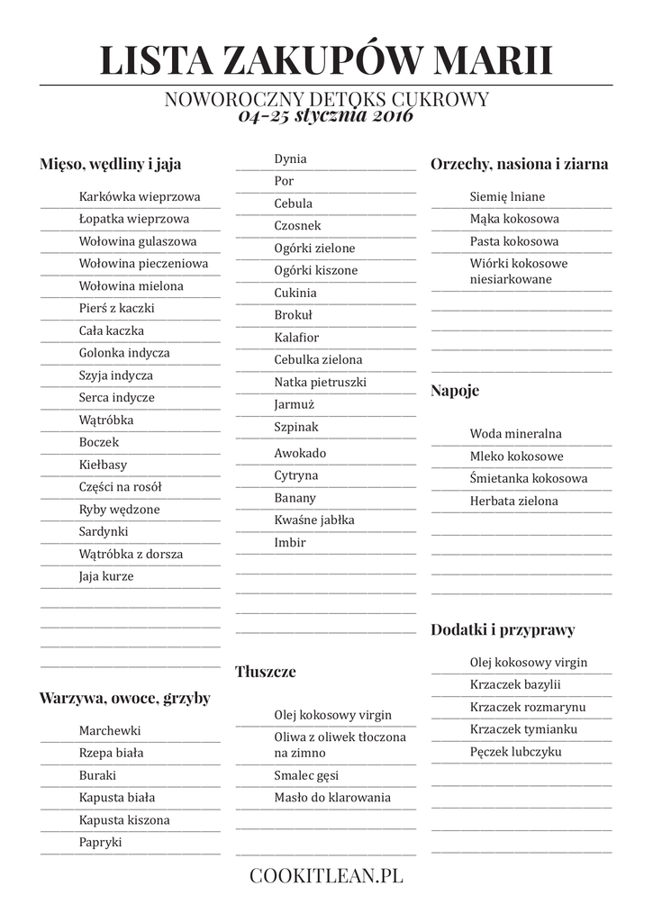 LISTA ZAKUPÓW MARII NOWOROCZNY DETOKS CUKROWY 04-25 stycznia 2016 Mięso, wędliny i jaja Karkówka wieprzowa _____________________________________ Łopatka wieprzowa _____________________________________ Wołowina gulaszowa _____________________________________ Wołowina pieczeniowa _____________________________________ Wołowina mielona _____________________________________ Pierś z kaczki _____________________________________ Cała kaczka _____________________________________ Golonka indycza _____________________________________ Szyja indycza _____________________________________ Serca indycze _____________________________________ Wątróbka _____________________________________ Boczek _____________________________________ Kiełbasy _____________________________________ Części na rosół _____________________________________ Ryby wędzone _____________________________________ Sardynki _____________________________________ Wątróbka z dorsza _____________________________________ Jaja kurze _____________________________________ _____________________________________ _____________________________________ _____________________________________ _____________________________________ Warzywa, owoce, grzyby Marchewki _____________________________________ Rzepa biała _____________________________________ Buraki _____________________________________ Kapusta biała _____________________________________ Kapusta kiszona _____________________________________ Papryki _____________________________________ Dynia _____________________________________ Por _____________________________________ Cebula _____________________________________ Czosnek _____________________________________ Ogórki zielone _____________________________________ Ogórki kiszone _____________________________________ Cukinia _____________________________________ Brokuł _____________________________________ Orzechy, nasiona i ziarna Siemię lniane _____________________________________ Mąka kokosowa _____________________________________ Pasta kokosowa _____________________________________ Wiórki kokosowe niesiarkowane _____________________________________ _____________________________________ _____________________________________ _____________________________________ Kalafior _____________________________________ Cebulka zielona _____________________________________ Napoje Szpinak _____________________________________ Awokado _____________________________________ Woda mineralna _____________________________________ Mleko kokosowe _____________________________________ Natka pietruszki _____________________________________ Jarmuż _____________________________________ Cytryna _____________________________________ Banany _____________________________________ Kwaśne jabłka _____________________________________ Imbir _____________________________________ _____________________________________ _____________________________________ _____________________________________ _____________________________________ Tłuszcze Olej kokosowy virgin _____________________________________ Oliwa z oliwek tłoczona na zimno _____________________________________ Smalec gęsi _____________________________________ Masło do klarowania _____________________________________ _____________________________________ _____________________________________ COOKITLEAN.PL _____________________________________ Śmietanka kokosowa _____________________________________ Herbata zielona _____________________________________ _____________________________________ _____________________________________ _____________________________________ _____________________________________ Dodatki i przyprawy Olej kokosowy virgin _____________________________________ Krzaczek bazylii _____________________________________ Krzaczek rozmarynu _____________________________________ Krzaczek tymianku _____________________________________ Pęczek lubczyku _____________________________________ _____________________________________ _____________________________________ _____________________________________ _____________________________________