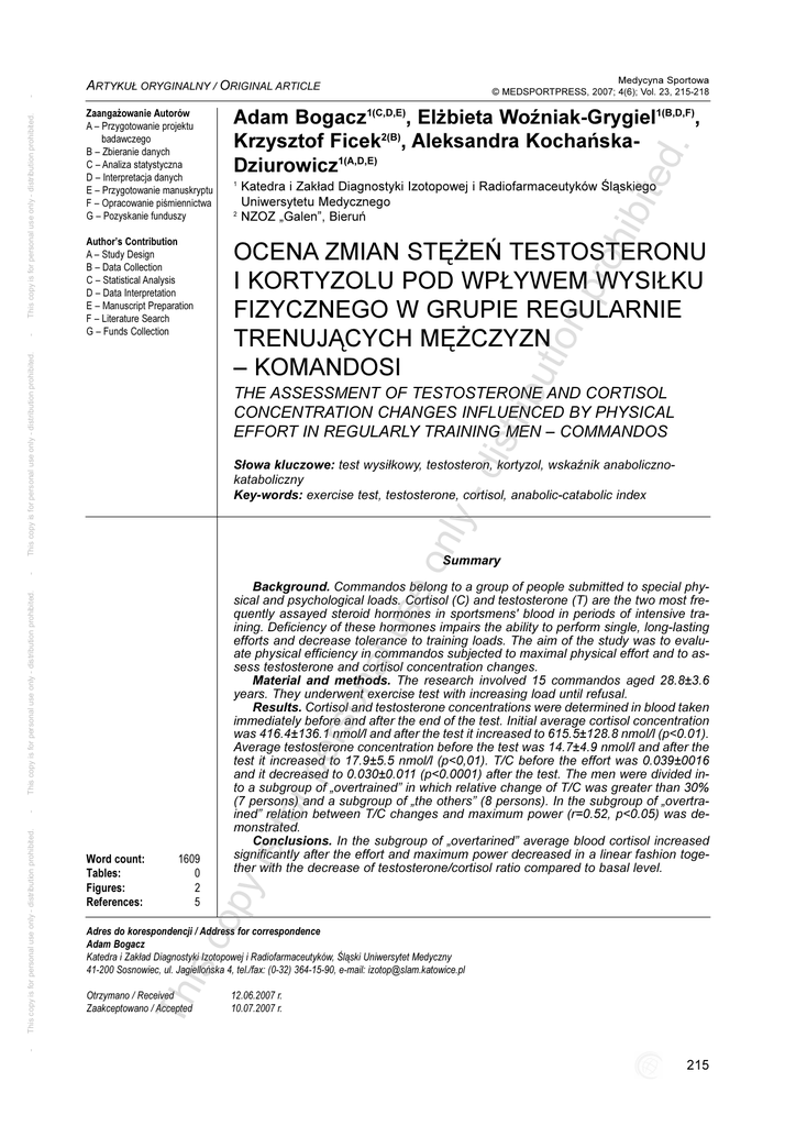 Medycyna Sportowa © MEDSPORTPRESS, 2007; 4(6); Vol. 23, 215-218 Adam Bogacz1(C,D,E), El¿bieta WoŸniak-Grygiel1(B,D,F), Krzysztof Ficek2(B), Aleksandra KochañskaDziurowicz1(A,D,E) Author’s Contribution A – Study Design B – Data Collection C – Statistical Analysis D – Data Interpretation E – Manuscript Preparation F – Literature Search G – Funds Collection OCENA ZMIAN STʯEÑ TESTOSTERONU I KORTYZOLU POD WP£YWEM WYSI£KU FIZYCZNEGO W GRUPIE REGULARNIE TRENUJ¥CYCH MʯCZYZN – KOMANDOSI 2 Katedra i Zak³ad Diagnostyki Izotopowej i Radiofarmaceutyków Œl¹skiego Uniwersytetu Medycznego NZOZ „Galen”, Bieruñ ibu tio np roh ibit 1 ed . Zaanga¿owanie Autorów A – Przygotowanie projektu badawczego B – Zbieranie danych C – Analiza statystyczna D – Interpretacja danych E – Przygotowanie manuskryptu F – Opracowanie piœmiennictwa G – Pozyskanie funduszy This copy is for personal use only - distribution prohibited. - This copy is for personal use only - distribution prohibited. - ARTYKU£ ORYGINALNY / ORIGINAL ARTICLE -d istr THE ASSESSMENT OF TESTOSTERONE AND CORTISOL CONCENTRATION CHANGES INFLUENCED BY PHYSICAL EFFORT IN REGULARLY TRAINING MEN – COMMANDOS nly S³owa kluczowe: test wysi³kowy, testosteron, kortyzol, wskaŸnik anabolicznokataboliczny Key-words: exercise test, testosterone, cortisol, anabolic-catabolic index - eo Summary y is 1609 0 2 5 op Word count: Tables: Figures: References: Th is c Adres do korespondencji / Address for correspondence Adam Bogacz Katedra i Zak³ad Diagnostyki Izotopowej i Radiofarmaceutyków, Œl¹ski Uniwersytet Medyczny 41-200 Sosnowiec, ul. Jagielloñska 4, tel./fax: (0-32) 364-15-90, e-mail: [email protected] Otrzymano / Received Zaakceptowano / Accepted 12.06.2007 r. 10.07.2007 r. - This copy is for personal use only - distribution prohibited. - for pe rs on al us This copy is for personal use only - distribution prohibited. Background. Commandos belong to a group of people submitted to special physical and psychological loads. Cortisol (C) and testosterone (T) are the two most frequently assayed steroid hormones in sportsmens' blood in periods of intensive training. Deficiency of these hormones impairs the ability to perform single, long-lasting efforts and decrease tolerance to training loads. The aim of the study was to evaluate physical efficiency in commandos subjected to maximal physical effort and to assess testosterone and cortisol concentration changes. Material and methods. The research involved 15 commandos aged 28.8±3.6 years. They underwent exercise test with increasing load until refusal. Results. Cortisol and testosterone concentrations were determined in blood taken immediately before and after the end of the test. Initial average cortisol concentration was 416.4±136.1 nmol/l and after the test it increased to 615.5±128.8 nmol/l (p<0.01). Average testosterone concentration before the test was 14.7±4.9 nmol/l and after the test it increased to 17.9±5.5 nmol/l (p<0,01). T/C before the effort was 0.039±0016 and it decreased to 0.030±0.011 (p<0.0001) after the test. The men were divided into a subgroup of „overtrained” in which relative change of T/C was greater than 30% (7 persons) and a subgroup of „the others” (8 persons). In the subgroup of „overtrained” relation between T/C changes and maximum power (r=0.52, p<0.05) was demonstrated. Conclusions. In the subgroup of „overtarined” average blood cortisol increased significantly after the effort and maximum power decreased in a linear fashion together with the decrease of testosterone/cortisol ratio compared to basal level. 215 Wyniki Komandosi nale¿¹ do grupy osób podlegaj¹cych szczególnym obci¹¿eniom fizycznym i psychicznym. Stres towarzysz¹cy ich pracy wymaga intensywnego treningu i zaanga¿owania porównywalnego z treningiem w takich dyscyplinach sportu jak hokej na lodzie lub boks. Po intensywnym wysi³ku fizycznym, któremu towarzyszy stres psychiczny, organizm zmierza do stabilizacji, wykorzystuj¹c uk³ad hormonalny i nerwowy. G³ównym zadaniem kortyzolu w tym procesie jest mobilizacja substratów i rezerw metabolicznych w zakresie zwiêkszonego uwalniania do krwi wolnych kwasów t³uszczowych, prawid³owej pracy miêœni szkieletowych i serca. Testosteron jako hormon anaboliczny ma przede wszystkim wp³ywaæ na odbudowê bia³ek strukturalnych, ponadto zabezpieczaæ bia³ka przed nadmiernym ich rozpadem oraz regulowaæ poziom glikogenu po wysi³ku [1-4]. Dlatego kortyzol i testosteron to obecnie dwa najczêœciej oznaczane hormony steroidowe we krwi u sportowców w okresie intensywnych treningów. Wykazano, ¿e niedobory obu hormonów upoœledzaj¹ mo¿liwoœci do wykonania jednorazowego, d³ugotrwa³ego wysi³ku i zmniejszaj¹ tolerancjê obci¹¿eñ treningowych [4]. Celem pracy by³o okreœlenie stopnia wytrenowania grupy komandosów poddanych maksymalnemu wysi³kowi fizycznemu, poprzez ocenê zmian stê¿eñ testosteronu i kortyzolu. W czasie testu do wolicjonalnej odmowy badani mê¿czyŸni osi¹gnêli œredni¹ moc maksymaln¹ 282,0± 33,8 W, a œredni czas trwania próby wysi³kowej wynosi³ 22,0±2,5 min. Przed testem wysi³kowym w ca³ej badanej grupie œrednie stê¿enie kortyzolu wynosi³o 416,4±136,1 nmol/l i mieœci³o siê w granicach normy fizjologicznej. Po teœcie wysi³kowym stwierdzono statystycznie istotny wzrost œredniego stê¿enia kortyzolu do wartoœci 615,5±128,8 nmol/l (p<0,01). Œrednie stê¿enie testosteronu przed testem wysi³kowym wynosi³o 14,7±4,9 nmol/l i mieœci³o siê w granicach normy fizjologicznej, po teœcie wzros³o istotnie statystycznie do wartoœci 17,9±5,5 nmol/l (p<0,01). Dla ka¿dego mê¿czyzny, na podstawie otrzymanych stê¿eñ kortyzolu i testosteronu, obliczono wartoœæ wskaŸnika anaboliczno-katabolicznego T/C (stosunek stê¿enia testosteronu do kortyzolu). Przed wysi³kiem fizycznym œrednia wartoœæ wskaŸnika T/C dla badanej grupy wynios³a 0,039