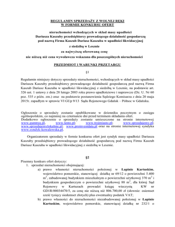 REGULAMIN SPRZEDAŻY Z WOLNEJ RĘKI W FORMIE KONKURSU OFERT nieruchomości wchodzących w skład masy upadłości Dariusza Kaszuby przedsiębiorcy prowadzącego działalność gospodarczą pod nazwą Firma Kaszub Dariusz Kaszuba w upadłości likwidacyjnej z siedzibą w Lesznie za najwyższą oferowaną cenę nie niższą niż cena wywoławcza wskazana dla poszczególnych nieruchomości PRZEDMIOT l WARUNKI PRZETARGU §1 Regulamin niniejszy dotyczy sprzedaży nieruchomości, wchodzących w skład masy upadłości Dariusza Kaszuby przedsiębiorcy prowadzącego działalność gospodarczą pod nazwą Firma Kaszub Dariusz Kaszuba w upadłości likwidacyjnej z siedzibą w Lesznie, na podstawie art. 326 ust. 1 ustawy z dnia 28 lutego 2003 roku prawo upadłościowe i naprawcze (Dz. U. Nr 60 poz. 535 z późn. zm.) oraz na podstawie postanowienia Sędziego Komisarza z dnia 20 maja 2015r. zapadłym w sprawie VI GUp 9/13 Sądu Rejonowego Gdańsk – Północ w Gdańsku. Ogłoszenie o sprzedaży zostanie opublikowane w dzienniku poczytnym o zasięgu ogólnopolskim, co najmniej na czternaście dni przed terminem składania ofert. Dodatkowo ogłoszenie o sprzedaży zostanie umieszczone na stronie internetowej www.gumtree.pl, www.lento.pl; www.trojmiasto.pl; www.sprzedajemy.pl; www.sprzedajemylokalnie.pl; www.proinvestdata.pl oraz na stronie internetowej syndyka www.syndyk-kowalewska.pl. Organizatorem sprzedaży w formie konkursu ofert jest syndyk masy upadłości Dariusza Kaszuby przedsiębiorcy prowadzącego działalność gospodarczą pod nazwą Firma Kaszub Dariusz Kaszuba w upadłości likwidacyjnej z siedzibą w Lesznie. §2 Pisemny konkurs ofert dotyczy: 1. sprzedaż nieruchomości obejmującej: a) prawo własności nieruchomości położonej w Łapinie Kartuskim, województwo pomorskie, stanowiącej działkę nr 69/12 o powierzchni 5.400 m2, zabudowanej budynkiem mieszkalnym o powierzchni użytkowej 370 m2 i budynkiem gospodarczym o powierzchni użytkowej 88 m2, dla której Sąd Rejonowy w Kartuzach prowadzi księgę wieczystą KW nr GD1R/00034470/5, za cenę nie niższą niż 806.700,00 zł (słownie: osiemset sześć tysięcy siedemset złotych) plus ewentualny podatek VAT; b) prawo własności do nieruchomości niezabudowanej położonej w Łapinie Kartuskim, województwo pomorskie, stanowiącej działkę nr 232/1 o powierzchni 7.900 m2, dla której Sąd Rejonowy w Kartuzach prowadzi księgę wieczystą KW nr GD1R/00031260/9 za cenę nie niższą niż 235.200,00 zł (słownie: dwieście trzydzieści pięć tysięcy dwieście złotych) plus ewentualny podatek VAT; c) prawo własności udziału 2/10 części działki 69/17 o powierzchni 1.400 m2, droga, położonej w Łapinie Kartuskim, województwo pomorskie, dla której Sąd Rejonowy w Kartuzach prowadzi księgę wieczystą KW nr GD1R/00044403/8 za cenę nie niższą niż 8.100,00 zł (słownie: osiem tysięcy sto złotych) plus ewentualny podatek VAT; z wyłączeniem możliwości oddzielnego sprzedawania przedmiotowych praw. za łączną cenę wywoławczą nie niższą niż 1.050.000,00 zł (słownie: jeden milion pięćdziesiąt tysięcy złotych) plus ewentualny podatek VAT; Sprzedaż i nabycie nieruchomości nastąpi w takim stanie, w jakim znajdują się one w dacie sprzedaży. §3 Do składania ofert mogą przystąpić osoby fizyczne i prawne oraz jednostki organizacyjne nie posiadające osobowości prawnej, utworzone zgodnie z przepisami prawa i którym odrębne przepisy prawa przyznają zdolność prawną. W sprzedaży nie mogą uczestniczyć: syndyk i Sędzia-Komisarz; przedstawiciele upadłego; małżonek, wstępny, zstępny, rodzeństwo osób wymienionych powyżej; podmioty wobec, których ogłoszono upadłość z możliwością zawarcia układu lub upadłość likwidacyjną §4 1. Oferty należy składać osobiście w biurze syndyka ul. Budowlanych 7, 80-298 Gdańsk w dni powszednie w godzinach od 8.00 do 15.00. albo za pośrednictwem poczty (decyduje data wpływu oferty do biura syndyka). Oferty należy składać w zapieczętowanych kopertach, w sposób uniemożliwiający zapoznanie się z treścią oferty przed otwarciem koperty. O przyjęciu oferty decyduje data wpływu oferty do siedziby syndyka. Koperty należy zaadresować: BIURO SYNDYKA DOROTY KOWALEWSKIEJ ul. Budowlanych 7, 80-298 Gdańsk sygnatura akt VI GUp 9/13 „oferta na zakup z wolnej ręki nieruchomości Dariusza Kaszuby przedsiębiorcy prowadzącego działalność gospodarczą pod nazwą Firma Kaszub Dariusz Kaszuba w upadłości likwidacyjnej z siedzibą w Lesznie” 2. Każdy oferent może złożyć tylko jedną ofertę za zakup poszczególnych nieruchomości. §5 Organizator konkursu ofert ustala następujące warunki zbycia: 1. przyszły nabywca zobowiązany jest do pokrycia wszystkich kosztów, podatków i opłat związanych z zawarciem umowy oraz z przeniesieniem własności praw opisanych powyżej; 2. przyszły nabywca zobowiązany jest do złożenia oświadczenia, że zapoznał się ze stanem faktycznym i prawnym nieruchomości oraz jej stanem technicznym oraz nie wnosi do nich zastrzeżeń i wyraża zgodę na wyłączenie rękojmi za wady fizyczne i prawne na mocy art. 558 § l kodeksu cywilnego; 3. w przypadku zawarcia umowy przedwstępnej przyszły nabywca obowiązany jest uiścić zadatek w wysokości 10% ustalonej ceny sprzedaży; 4. umowa ostateczna winna zostać zawarta nie później niż do dnia 31 marca 2016 roku w formie aktu notarialnego; 5. możliwość zawarcia umowy ostatecznej uzależniona jest od faktu wpłynięcia do masy upadłości całej ceny nabycia przedmiotowych nieruchomości. §6 Oferta nabywcy winna być sporządzona w języku polskim i zawierać: 1. imię i nazwisko lub firmę nabywcy; 2. adres, numer NIP; 3. datę sporządzenia oferty; 4. wskazanie nieruchomości, których oferta dotyczy 5. proponowane ceny nabycia netto w PLN ( dla nieruchomości wskazanej w §2, punkt 1 proponowana cena nabycia netto winna być wskazana dla k