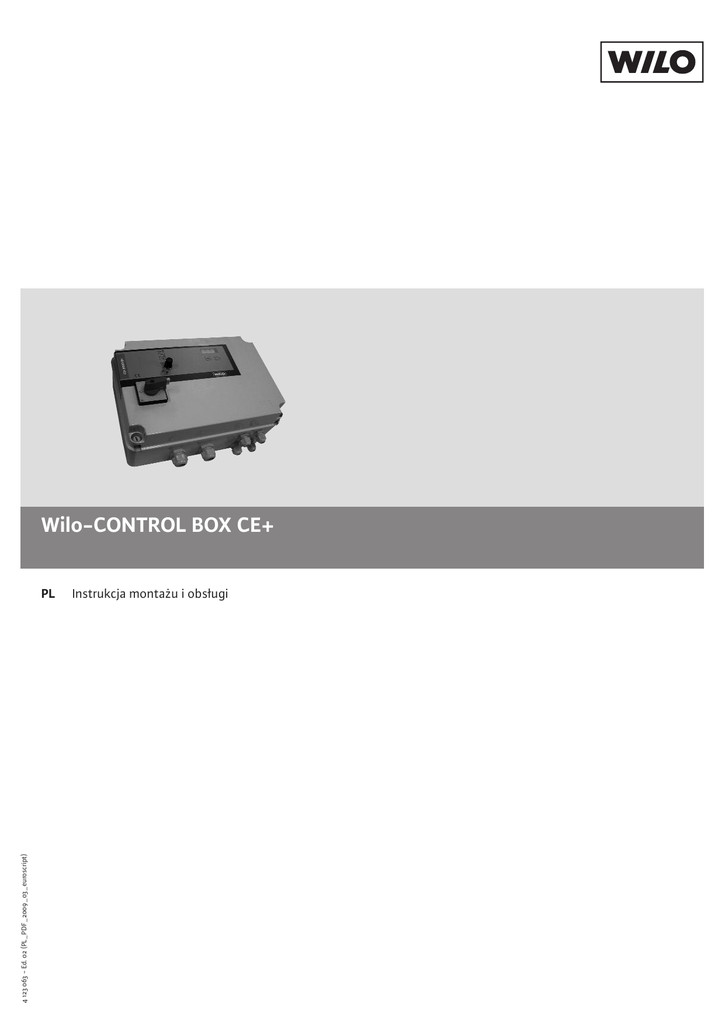 Wilo-CONTROL BOX CE+ PL Instrukcja montażu i obsługi I Istruzioni di montaggio, uso e manutenzione E Instrucciones de instalación y funcionamiento P Manual de instalação e funcionamento NL Inbouw- en bedieningsvoorschriften S Monterings- och skötselinstruktioner 4 123 063 - Ed. 02 (PL_PDF_2009_03_euroscript) FIN Huolto- ja käyttöohje PL Monterings- og driftsvejledning PL Instrukcja montażu i obsługi RO Instrukcja montazu i obslugi CZ Návod k montáži a obsluze TR Montaj ve Kullanma K›lavuzu Rys. 1a 2 10 9 5 11 7 3 6 1 8 4 Rys. 1b 10 9 2 5 11 3 7 6 1 8 4 Rys. 1c 2 10 3 2 11 5 1 7 6 12 13 4 8 Rys. 1d 9 10 3 2 11 5 1 7 6 12 13 4 8 Rys. 1e 9 11 10 2 5 13 12 6 3 8 4 1 7 Rys. 2 4 3 5 1 6 2 Rys. 3 1 4 5 3 2 Rys. 5 3 PE 4 5 6 X2 Motor PE Motor W2 Motor U2 Motor V2 5 1 2 4 2 3 4 6 (NO ontact) X4 3 1 1 5 6 (NC ontact) 4 Ext, Off 3 Sensor (In) 2 Sensor (+24V) (NC ontact) Dry 1 Run signal X3 (NO ontact) 2 SSM 3 (NC ontact) 2 Motor W1 4 WSK 1 Motor V1 XO L1 L2 L3 N PE X1 Motor U1 Supply PE Supply N Supply L3 Supply L2 Supply L1 Rys. 4a 1 Rys. 4b 2 PL Instrukcja montażu i obsługi 8 Istruzioni di montaggio, uso e manutenzione xx E Instrucciones de instalación y funcionamiento xx P Manual de instalação e funcionamento xx N Polski 1. Ogólne informacje 1.1 O niniejszym dokumencie Instrukcja montażu i obsługi stanowi część produktu. Powinna być stale dostępna w pobliżu produktu. Ścisłe przestrzeganie tej instrukcji stanowi warunek użytkowania zgodnego z przeznaczeniem oraz należytej obsługi produktu. Instrukcja montażu i obsługi odpowiada wersji produktu i stanowi norm regulujących problematykę bezpieczeństwa, obowiązujących na dzień złożenia instrukcji do druku. 2. Bezpieczeństwo Niniejsza instrukcja obsługi zawiera podstawowe wskazówki zalecenia , które muszą być uwzględnione przy instalowaniu, uruchamianiu i pracy urządzenia. Dlatego instrukcja obsługi musi być koniecznie przeczytana przez montera i użytkownika przed przystąpieniem do montażu i uruchomienia. Należy przestrzegać nie tylko ogólnych zasad bezpieczeństwa, wymienionych w tym punkcie, ale także szczegółowych zasad bezpieczeństwa, zamieszczonych w dalszych punktach, oznaczonych symbolami niebezpieczeństw. 2.1 Oznaczenia zaleceń zawartych w instrukcji obsługi Symbole: Ogólny symbol niebezpieczeństwa Niebezpieczeństwo związane z napięciem elektrycznym ZALECENIE: ... Teksty ostrzegawcze: NIEBEZPIECZEŃSTWO! Bardzo niebezpieczna sytuacja. Nieprzestrzeganie grozi ciężkimi obrażeniami, a nawet śmiercią. UWAGA! Użytkownik może doznać (ciężkich) obrażeń w razie nieprzestrzegania wskazówki. OSTROŻNIE! Istnieje niebezpieczeństwo uszkodzenia produktu/instalacji. „Ostrożnie“ odnosi się do prawdopodobnych uszkodzeń produktu, spowodowanych zlekceważeniem zalecenia. ZALECENIE: Użyteczna wskazówka dotycząca posługiwania się produktem. Zwraca uwagę na potencjalne trudności. 2.2 Kwalifikacje personelu Personel wykonujący montaż i uruchomienie musi posiadać odpowiednie kwalifikacje do wykonywania tych zadań. 2.3 Niebezpieczeństwa wynikające z nieprzestrzegania zaleceń Nieprzestrzeganie zaleceń dot. bezpieczeństwa może prowadzić do powstania zagrożenia dla osób oraz produktu/instalacji. Nieprzestrzeganie zasad bezpieczeństwa pociągną za sobą powoduje utratę wszelkich praw do gwarancji i odszkodowania. W szczególności nieprzestrzeganie tych zasad może nieść ze sobą następujące zagrożenia: • niewłaściwe działanie ważnych funkcji pompy/ urządzenia, • nieskuteczność zabiegów konserwacyjnych i napraw, • zagrożenie ludzi działaniem czynników elektrycznych, mechanicznych i bakteriologicznych, • szkody materialne. 2.4 Zalecenia dla użytkowników Należy przestrzegać obowiązujących zasad bezpieczeństwa i higieny pracy. Należy wyeliminować zagrożenia związane z energią elektryczną. Należy przestrzegać przepisów [np. IEC, VDE itd.] oraz zaleceń lokalnego zakładu energetycznego. 2.5 Zalecenia dla prac montażowych i sprawdzających Użytkownik jest zobowiązany do zapewnienia wykonania wszystkich czynności związanych z przeglądami i montażem przez autoryzowanych, odpowiednio wykwalifikowanych specjalistów, po dokładnym zapoznaniu się z instrukcją obsługi. Prace przy produkcie/instalacji mogą być wykonywane tylko podczas przestoju. 2.6 Samowolna przebudowa i stosowanie niewłaściwych części zamiennych Zmiany produktu/instalacji dozwolone są tylko po uzgodnieniu z producentem. Celem stosowania oryginalnych części zamiennych i atestowanego osprzętu jest zapewnienie bezpieczeństwa. Zastosowanie innych części zwalnia producenta z odpowiedzialności za wynikające z tego skutki 2.7 Niedopuszczalne sposoby pracy Bezpieczeństwo eksploatacji dostarczonego produktu/instalacji jest zagwarantowane wyłącznie w przypadku użytkowania zgodnego z przeznaczeniem wg ustępu 4 instrukcji obsługi. Wartości graniczne, podane w katalogu/specyfikacji, nie mogą być przekraczane (odpowiednio w górę lub w dół). 3. Transport i magazynowanie Po otrzymaniu produktu natychmiast sprawdzić, czy nie uległ uszkodzeniom podczas transportu. W przypadku stwierdzenia uszkodzeń należy je natychmiast zgłosić spedytorowi. OSTROŻNIE! Jeżeli materiał ma być zamontowany później, należy go składować w suchym miejscu. Produkt należy chronić przed upadkiem/uderzeniem oraz wpływami zewnętrznymi (wilgoć, mróz itd.). Ostrożnie obchodzić się z urządzeniem. 8 WILO SE 09/2008 Polski 4. Zakres zastosowania Urządzenie sterujące CE+ służy do automatycznej kontroli, sterowania i automatycznej ochrony urządzenia do podwyższania ciśnienia. Jest stosowane do zaopatrzenia w wodę wysokich budynków mieszkalnych, szpitali, budynków administracyjnych i przemysłowych. Zastosowanie reduktora ciśnienia w przewodzie zasysającym jest wymagane w przypadku zmian ciśnienia powyżej 1 bar. Ciśnienie zachowane za red